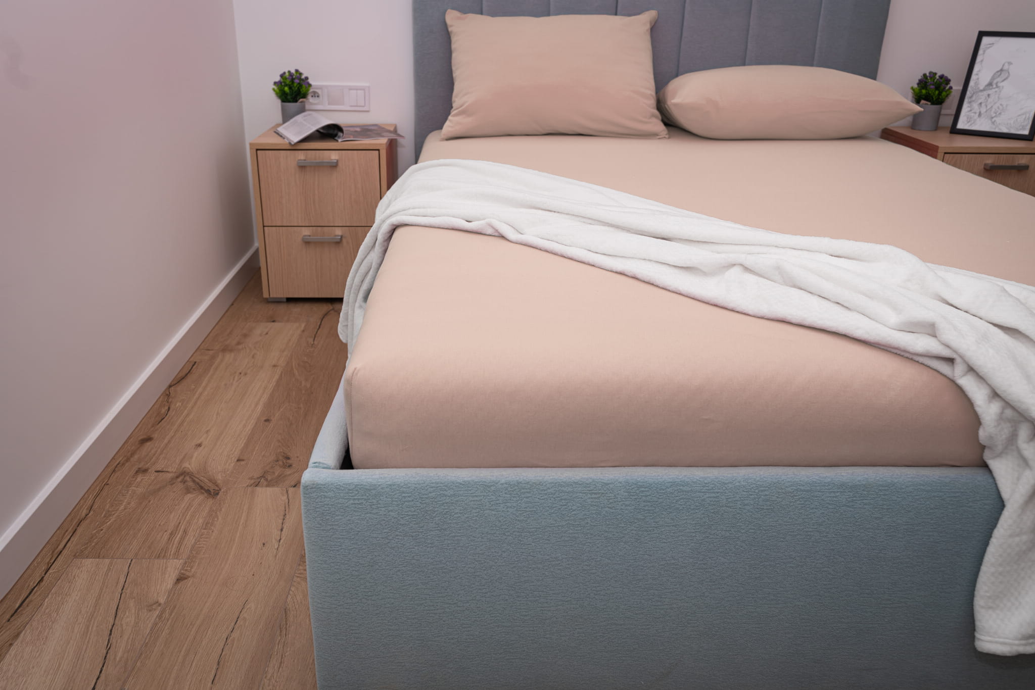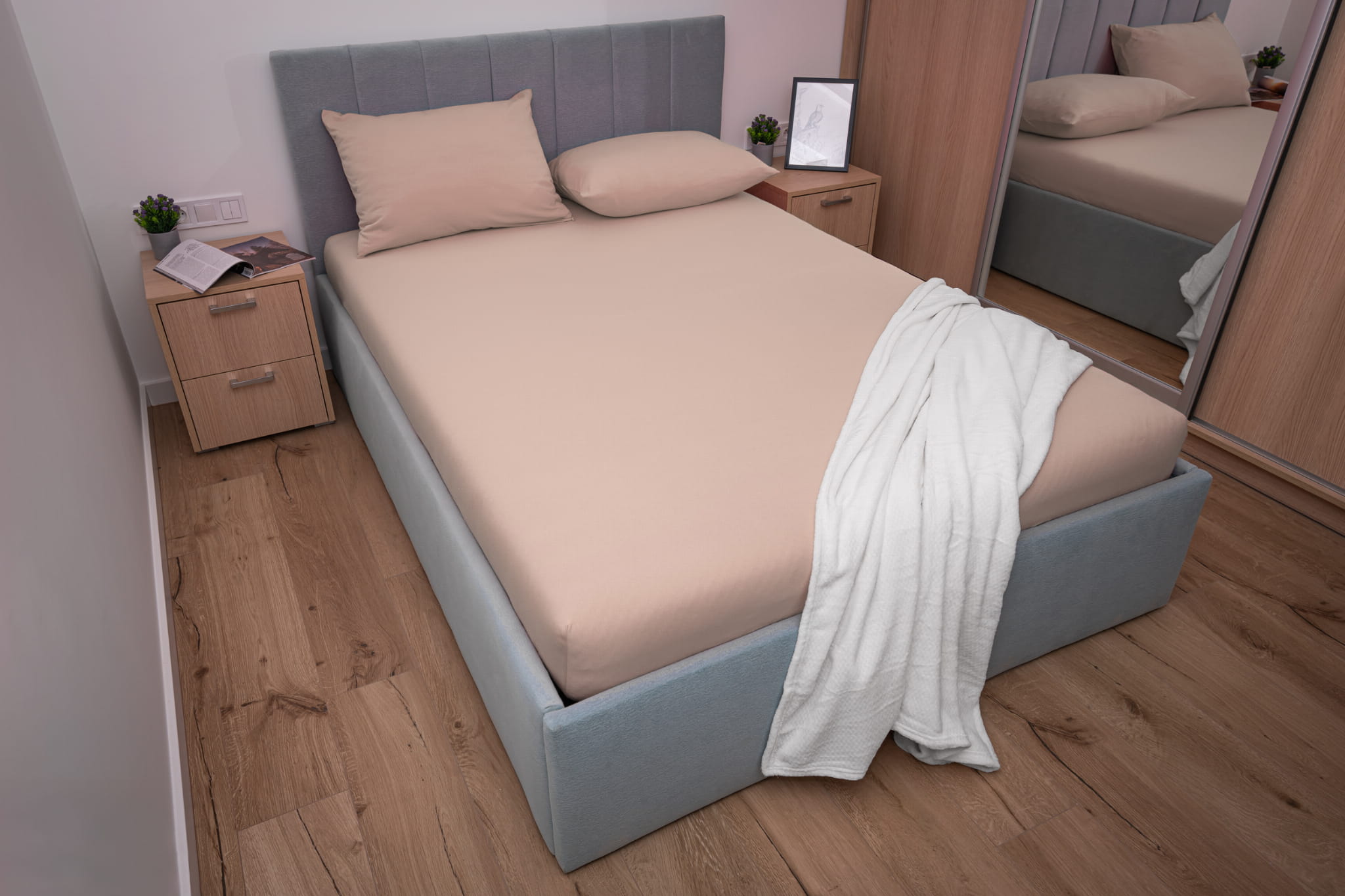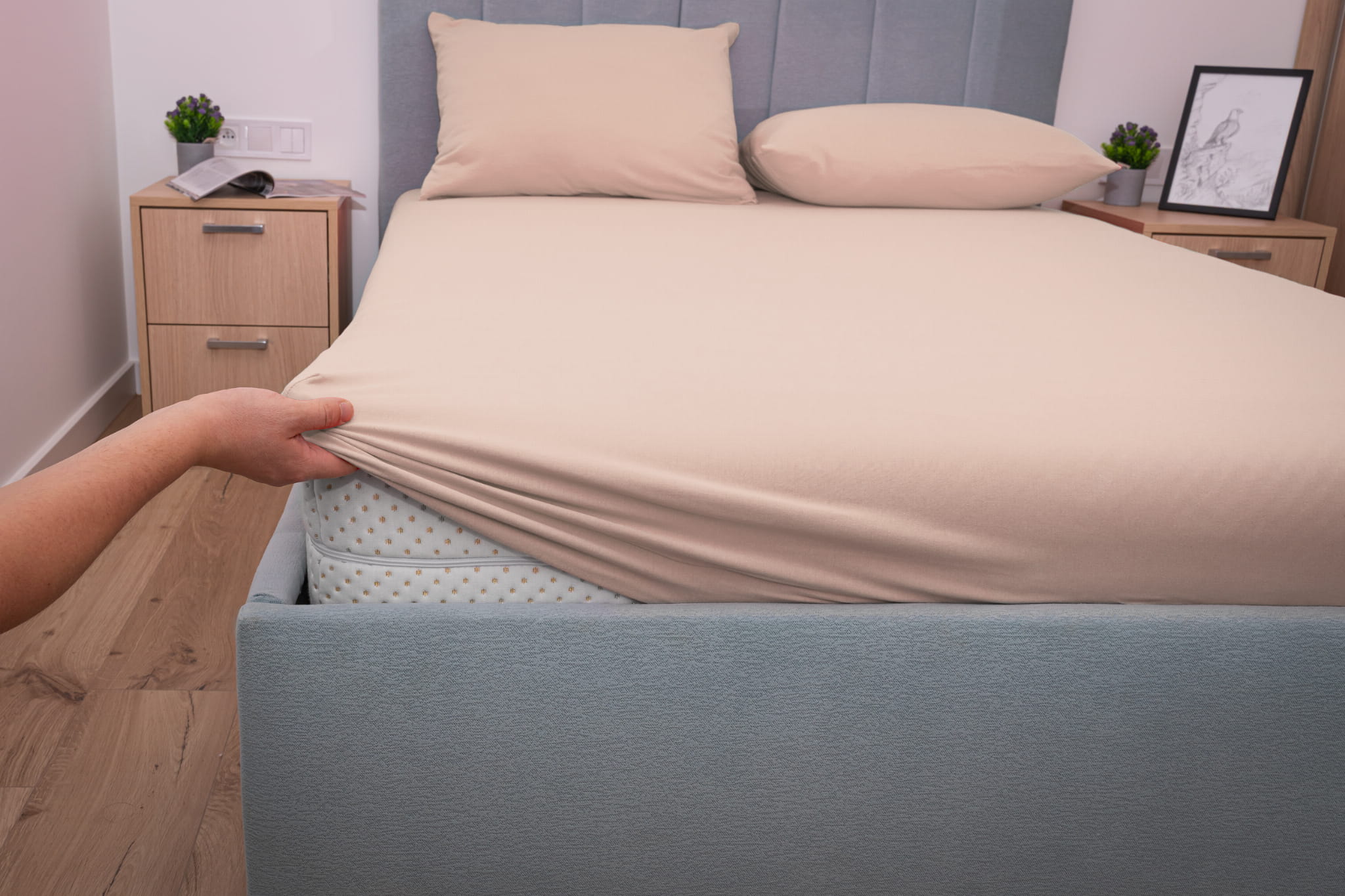 Prześcieradło jersey z gumką w kolorze beżowym wykonane zostało z materiału jersey z wysokiej jakości przędzy czesanej składającej się w 100% z bawełny. Dzięki wykonaniu z naturalnych włókien bawełnianych prześcieradło bardzo dobrze reguluje temperaturę ciała co zapobiega nadmiernemu poceniu się skóry. Prześcieradło jersey z gumką charakteryzuje się wykorzystaniem przędzy czesanej czyli najbardziej ekskluzywnej dostępnej na rynku o gramaturze 155 g/m² która sprawia że prześcieradło jest gładkie, miękkie i aksamitne w dotyku.