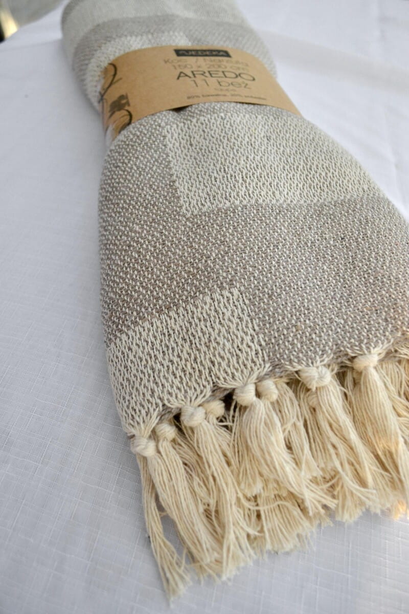 Koc bawełniany Aredo 11 150x200 pochodzi z kolekcji marki Jedeka, która stawia na naturalne i efektowne wzornictwo. Koc wykonany jest w 80% bawełny i 20% poliestru dzięki czemu nie krępuje ruchów podczas użytkowania. Do tego jest bardzo elegancki i starannie wykończony. Świetnie prezentuje się w każdym wnętrzu dodając elegancji i ciepła. Użytkowanie takiego koca to sama przyjemność dla Ciebie lub dla osoby, którą chcesz obdarować. Produkt świetnie spełnia zadanie przytulnego i ciepłego koca oraz narzuty na łóżko. Ozdobiony jest frędzlami.