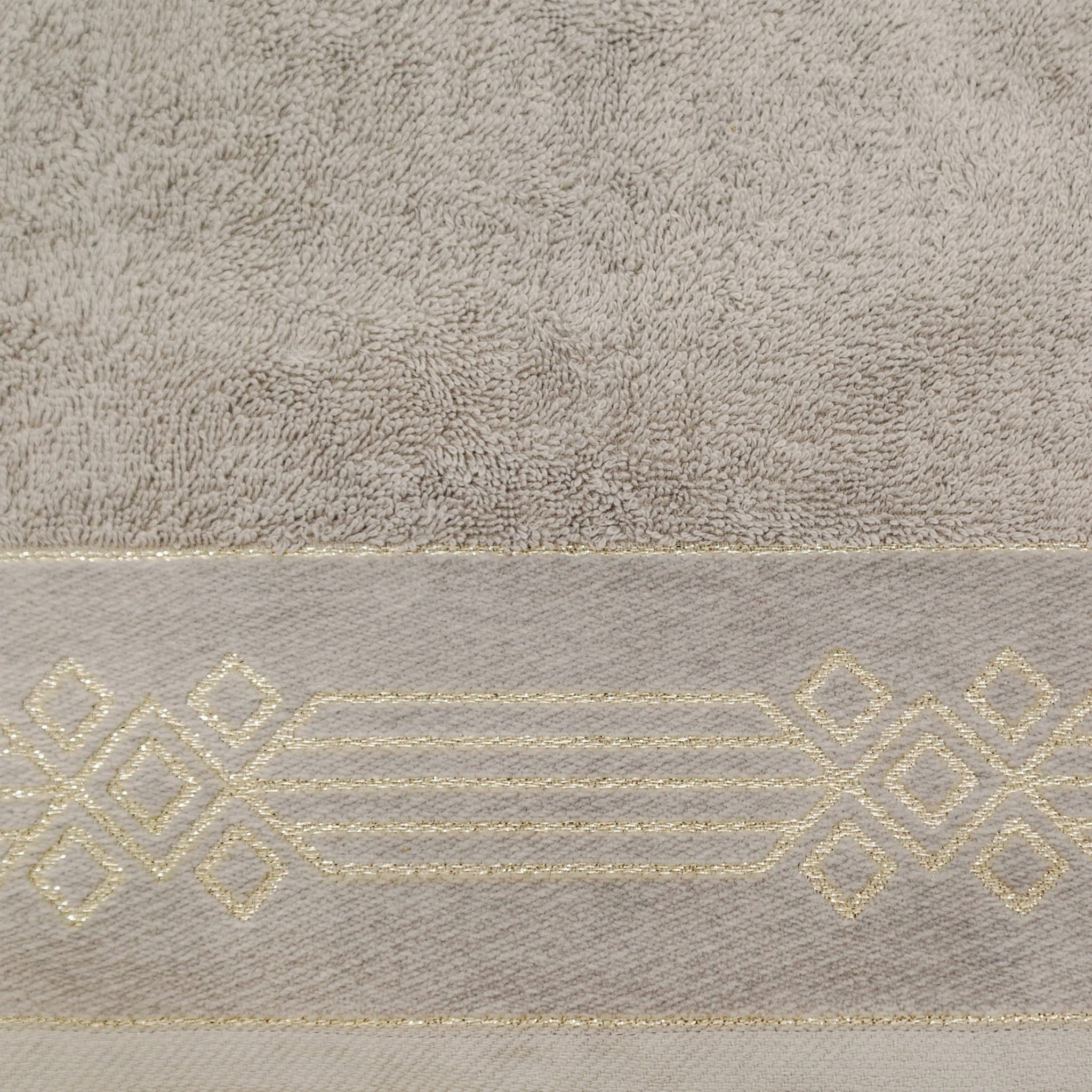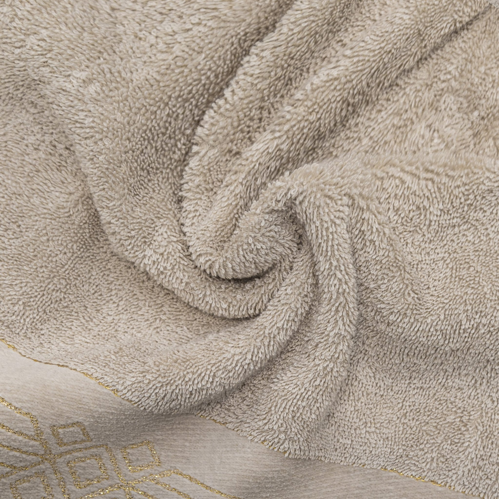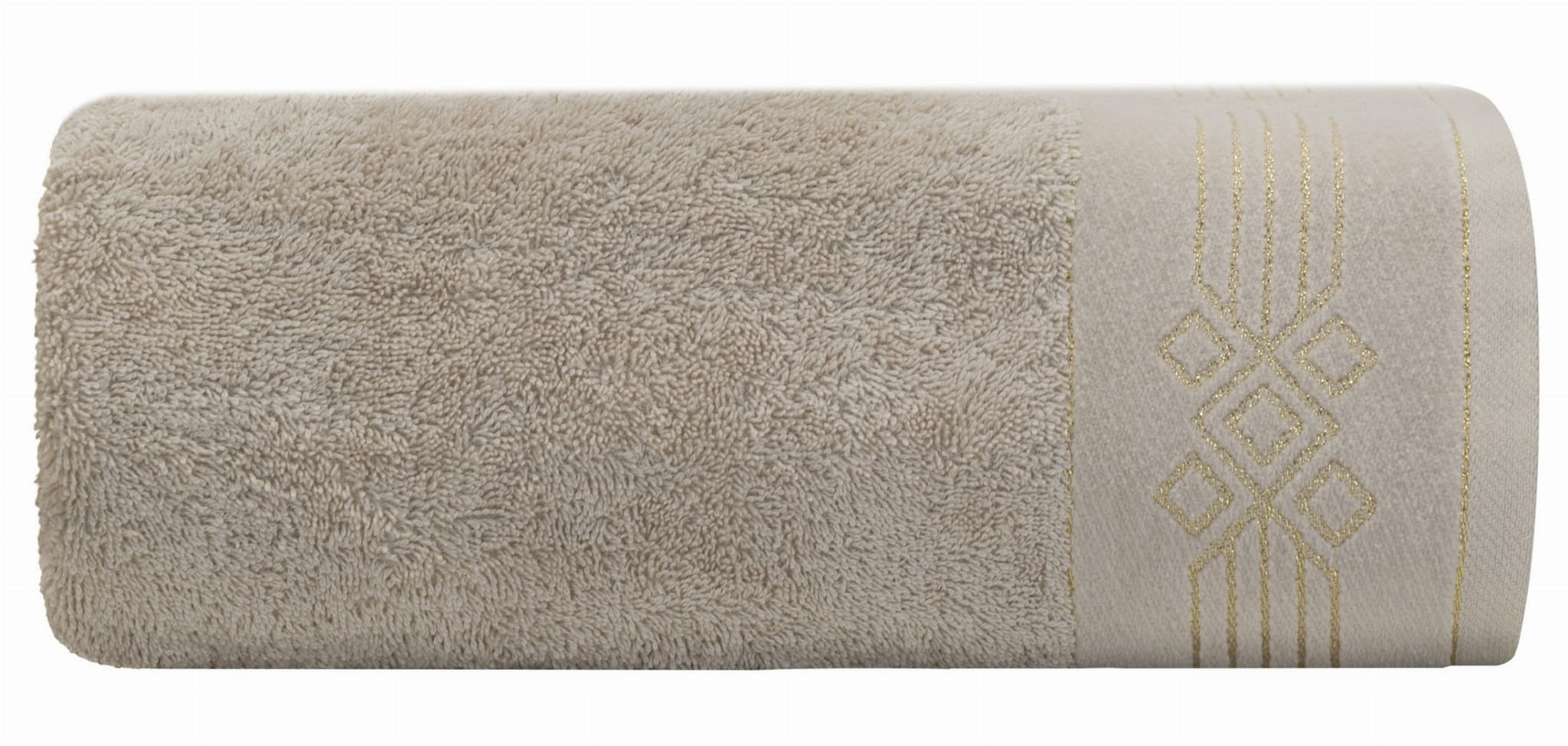 Ręcznik bawełniany Kamela w kolorze beżowym z piękną złotą, geometryczną listwą został wyprodukowany przez znaną i cenioną markę Eurofirany. Został wykonany z wysokiej jakości przędzy frotte, składającej się w 100% bawełny, która zapewnia wysokie właściwości higroskopijne czyli zdolność pochłaniania wilgoci. Charakteryzuje się wysoką i najbardziej optymalną do codziennego użytku gramaturą 520 g/m², dzięki której szybko schnie. Dodatkowo ręcznik Kamela cechuje się przyjemnym i miękkim chwytem. Elegancka, kwiatowa część ozdobna świetnie odnajdzie się w klasycznych jak i nowoczesnych wnętrzach. Z pewnością zadowolą klientów szukających wysokiej jakości w połączeniu z atrakcyjną ceną i eleganckim designem.