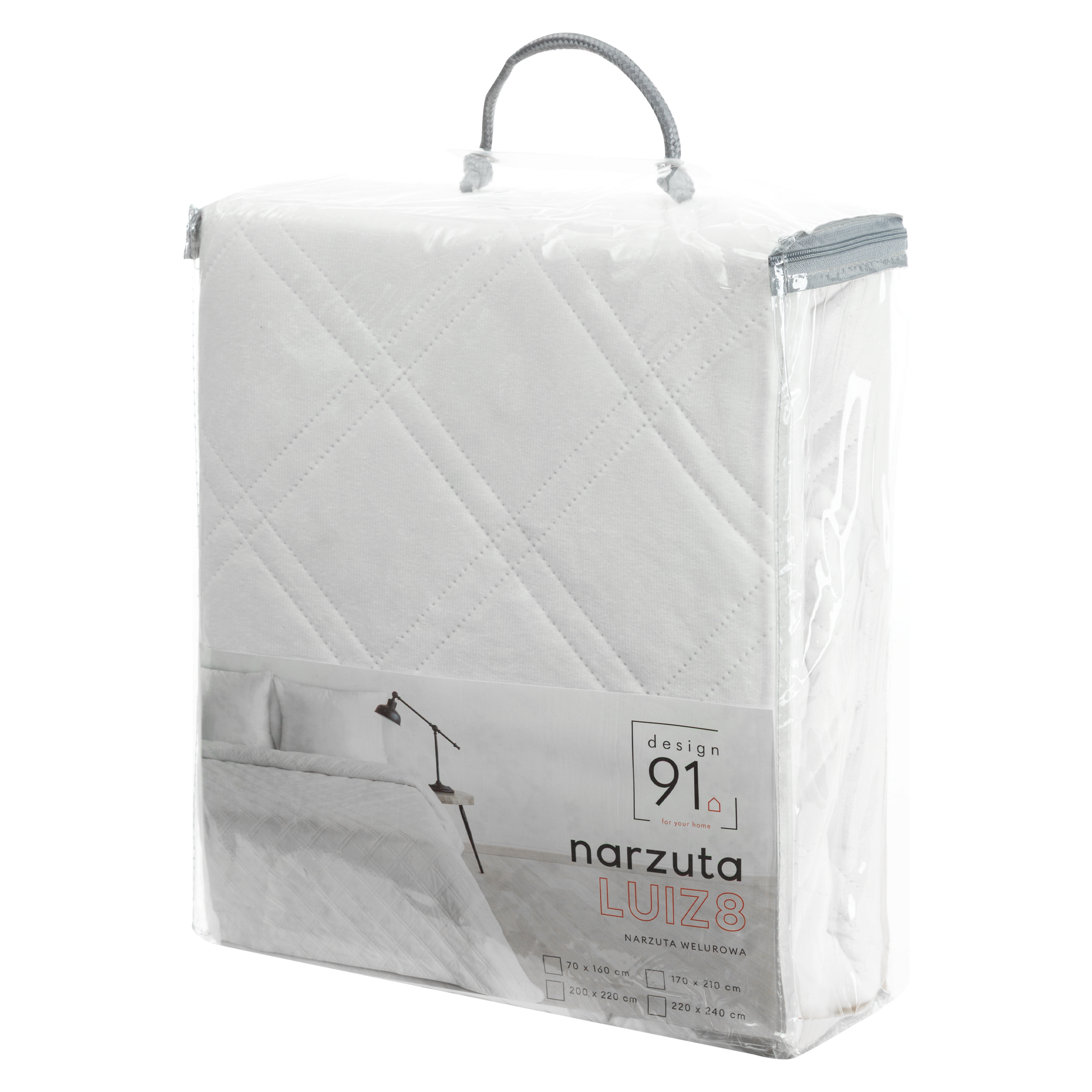 Narzuta na łóżko Luiz 8 170x210 w kolorze białym została wykonana na zlecenie firmy Desing91. Funkcja narzuty to nie tylko sama dekoracja i prezencja ale również ochrona pościeli przed zabrudzeniami. Dwustronna narzuta została starannie wykonana geometrycznym wzorem. Materiał posiada matowy połysk a jej strona wierzchnia została wykonana z bardzo przyjemnego i delikatnego w dotyku velvetu. Druga strona to gładka i matowa mikrofibra imitująca bawełnę. Eleganckie pikowanie w geometryczny wzór zostało wykonane metodą hot press 3D czyli bez użycia nici i igieł. Całość jest zatem miła i przyjemna w dotyku oraz nie posiada dodatkowych przeszyć. Pikowanie za pomocą termo-zgrzewania posiada tą zaletę, że powstaje trwały materiał o dużej wytrzymałości. Cała narzuta jest lekka dzięki temu łatwo mieści się do pralki a codziennie ścielenie łóżka jest szybkie i przyjemne.