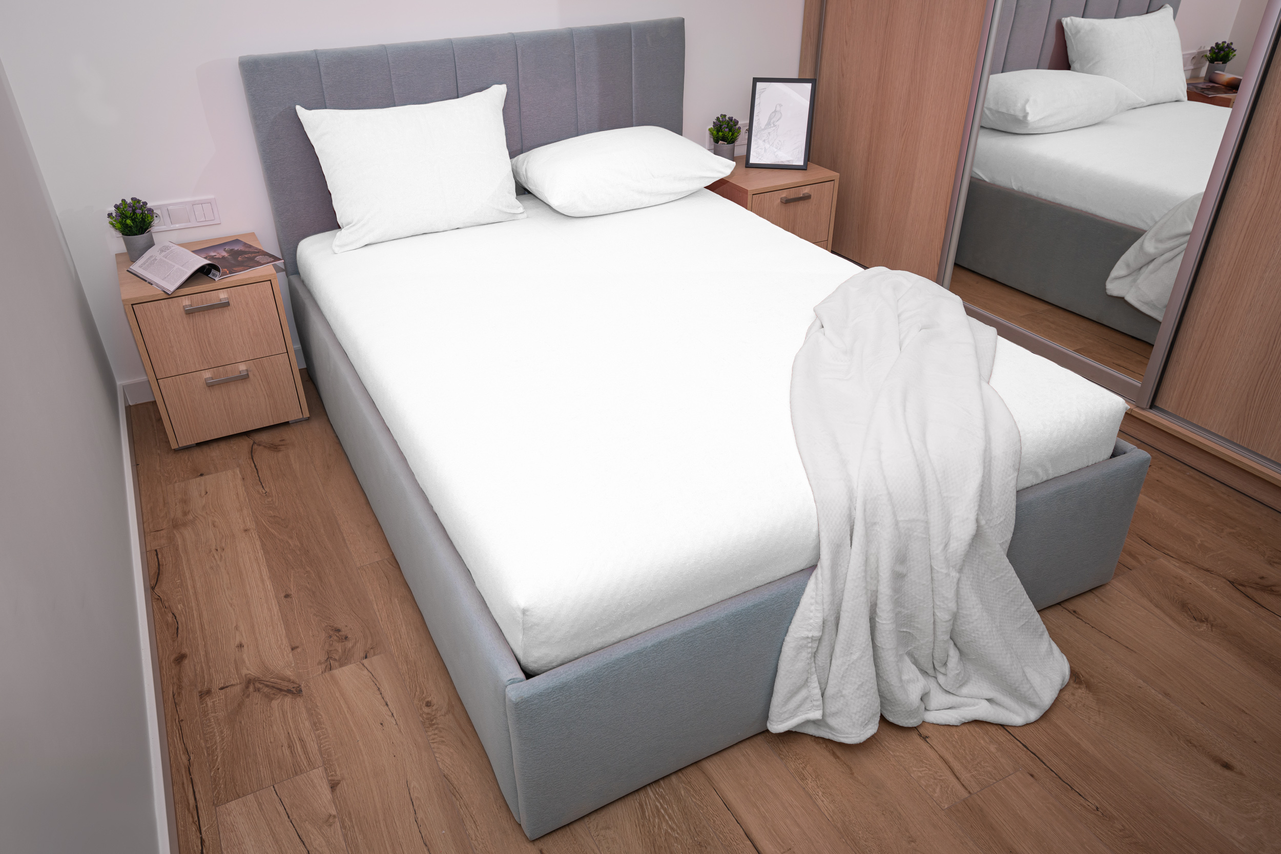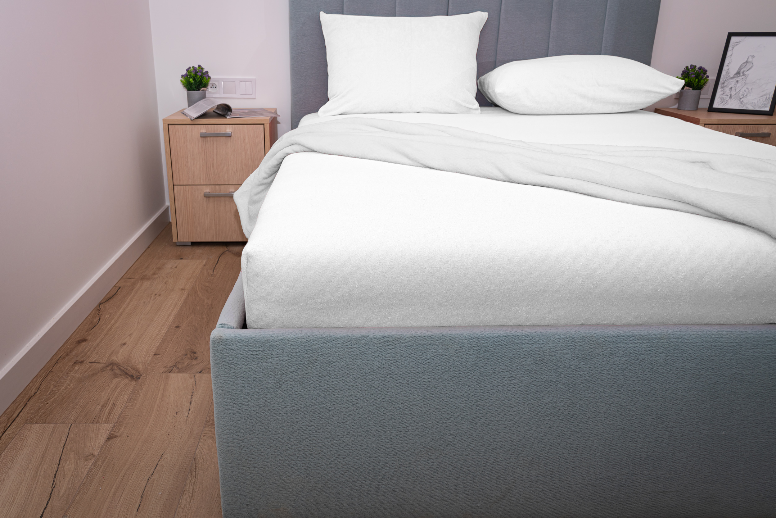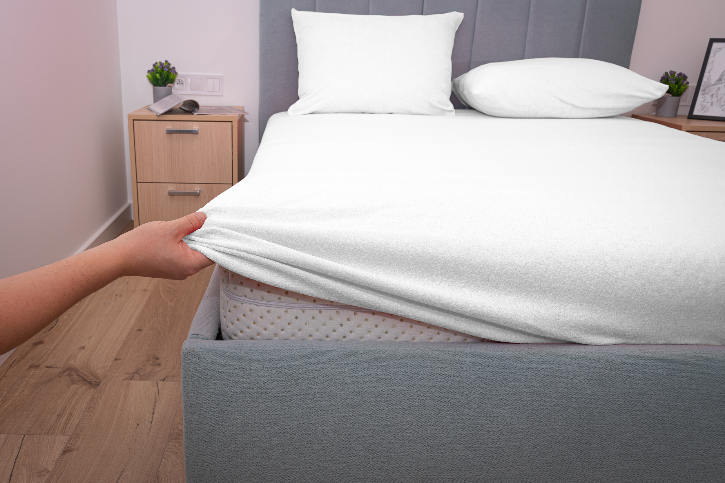 Prześcieradło frotte z gumką w kolorze białym wykonane zostało z materiału frotte z wysokiej jakości przędzy czesanej. Dzianina składa się w 82% z bawełny i 18% z poliestru czyli tysięcy bawełnianych pętelek między którymi swobodnie przepływa powietrze. Taka proporcja bawełny do poliestru sprawia, że prześcieradło bardzo dobrze reguluje temperaturę ciała co zapobiega nadmiernemu poceniu się skóry a poliester gwarantuje ciągliwość i wytrzymałość oraz idealne dopasowanie do materaca. Prześcieradło frotte z gumką charakteryzuje się wykorzystaniem przędzy czesanej czyli najbardziej ekskluzywnej dostępnej na rynku o gramaturze 200g/m² która sprawia że prześcieradło jest grube, miękkie i przyjemne w dotyku.