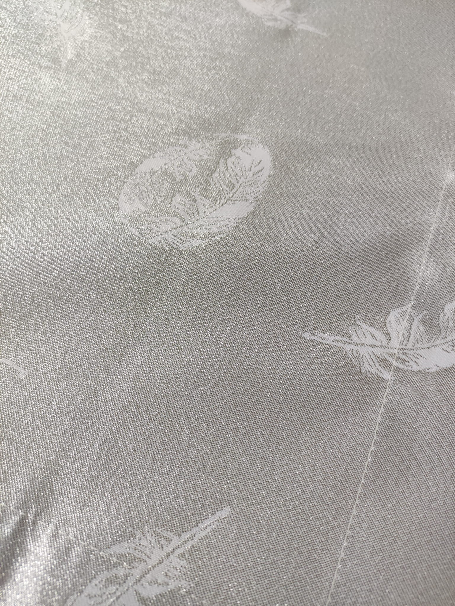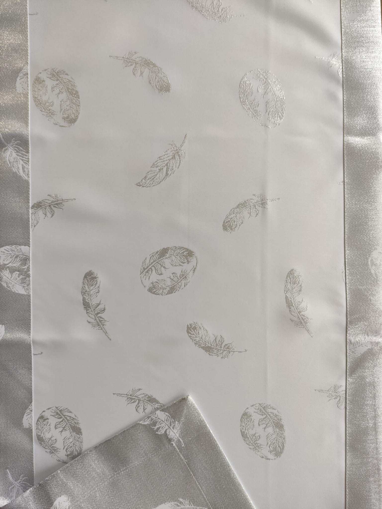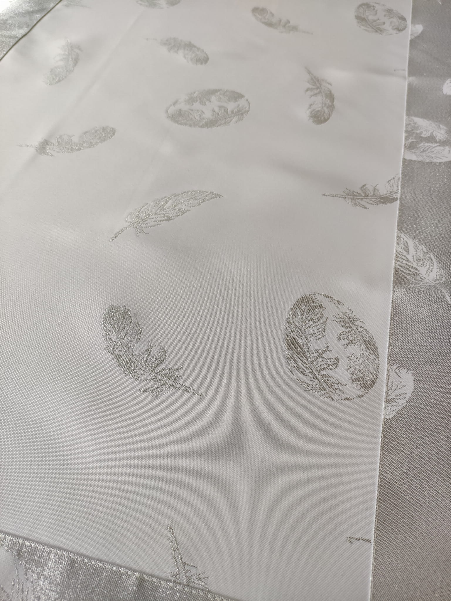biało srebrny obrus plamoodporny na wielkanoc piórka