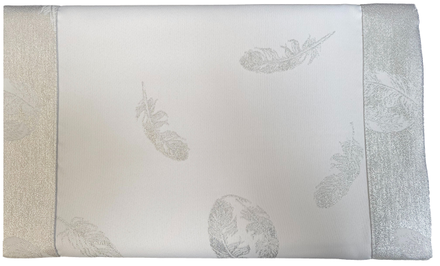 Elegancki biało srebrny obrus plamoodporny z motywem jajek i piór z pewnością dopełni bogato zastawiony stół Wielkanocny. Został wykonany z dwóch warstw tkaniny plamoodpornej zszytej razem. Jedna strona to elegancki srebrny nadruk z motywem świątecznym na białym tle. Druga to tkanina o tym samym motywie w całości w kolorze srebrnym. Całość wygląda nowocześnie bardzo elegancko a zarazem minimalistycznie.