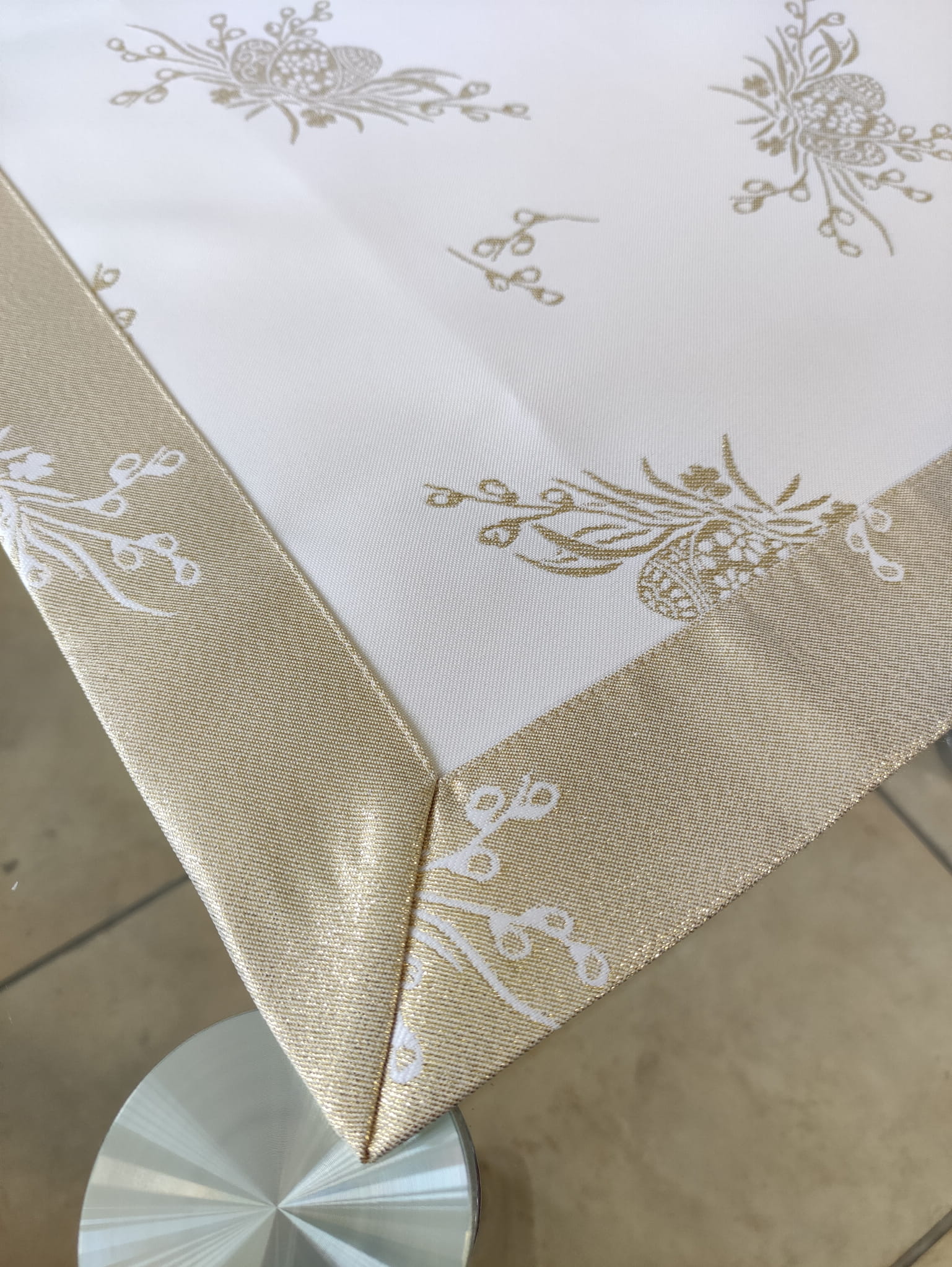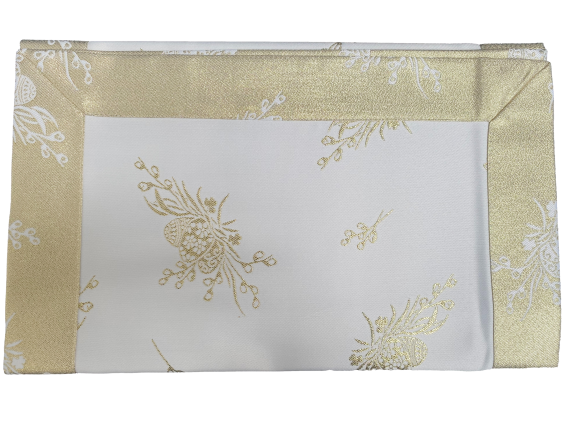 Elegancki biało srebrny obrus plamoodporny z motywem jajek i piór z pewnością dopełni bogato zastawiony stół Wielkanocny. Został wykonany z dwóch warstw tkaniny plamoodpornej zszytej razem. Jedna strona to elegancki złoty nadruk z motywem świątecznym na białym tle. Druga to tkanina o tym samym motywie w całości w kolorze złotym. Całość wygląda nowocześnie bardzo elegancko a zarazem minimalistycznie.