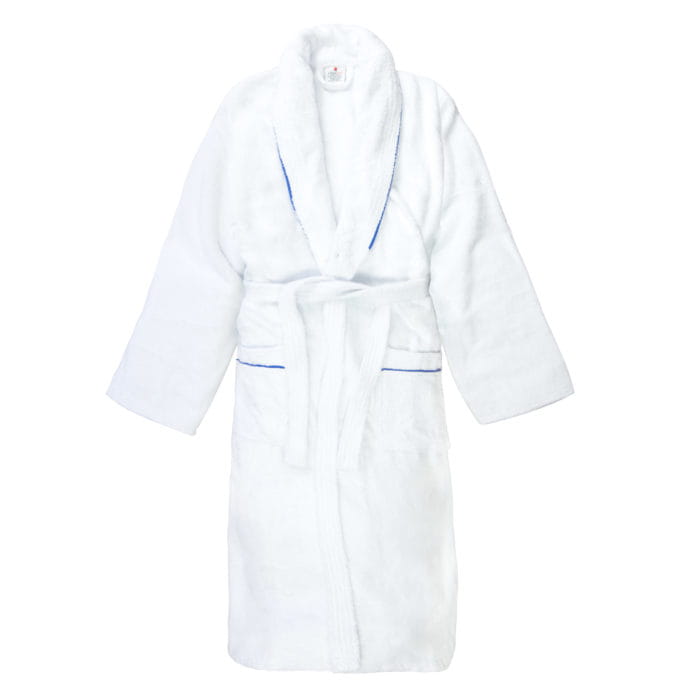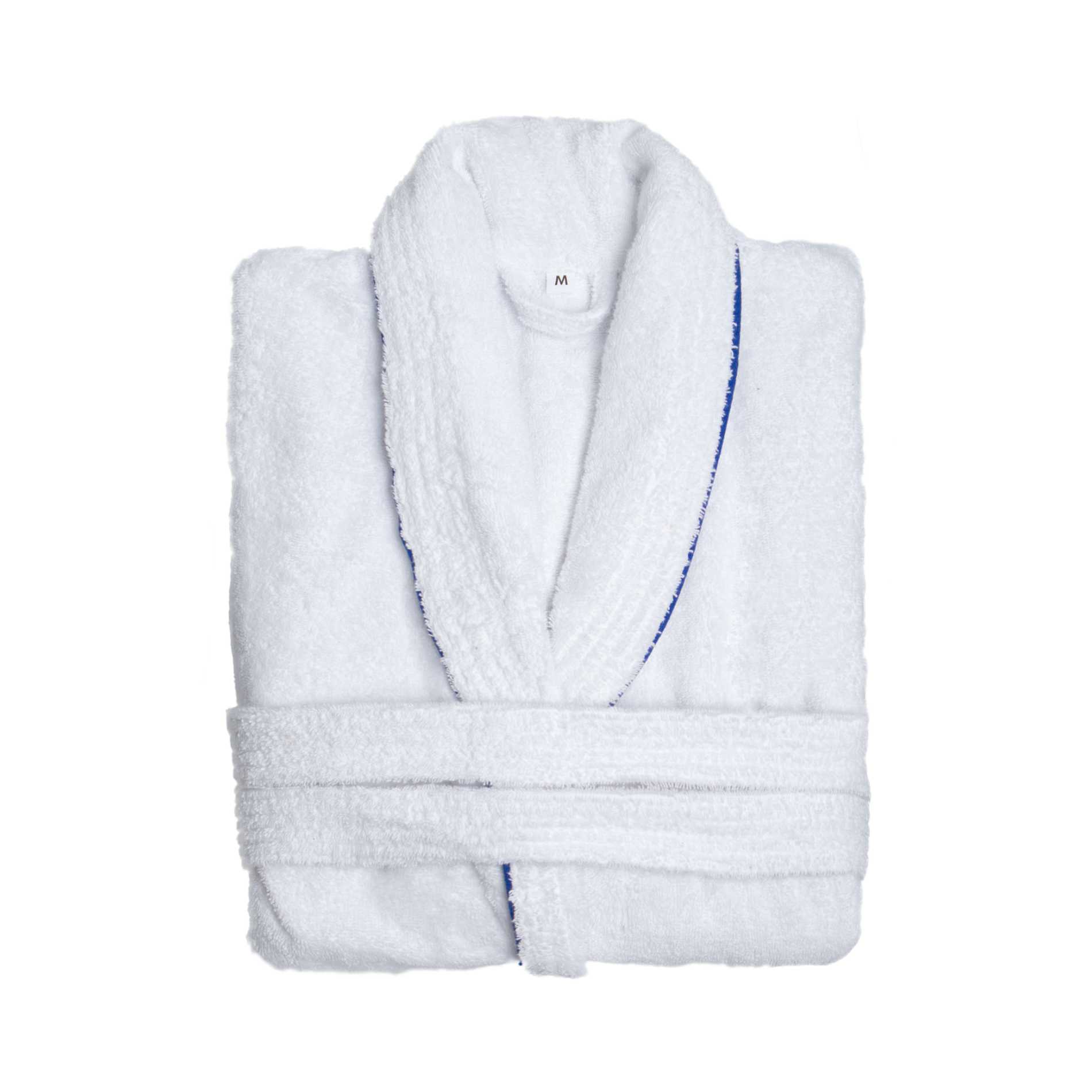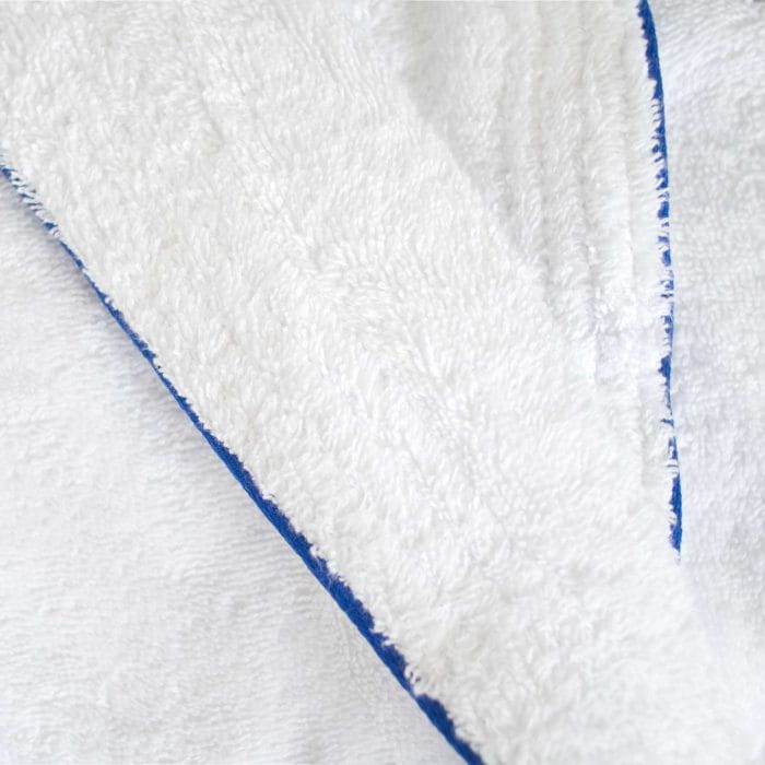 Biały bawełniany szlafrok Milano wykonany jest z wysokiej jakości bawełny frotte. Szlafrok jest puszysty, miękki i przyjemny w dotyku, doskonale pochłania wodę. Posiada naszywane, wygodne w użytkowaniu kieszenie, ozdobione delikatną lamówką w kolorze niebieskim. Dopełnieniem całości wizerunku szlafroka jest kołnierz szalowy, ozdobiony niebieską lamówką.