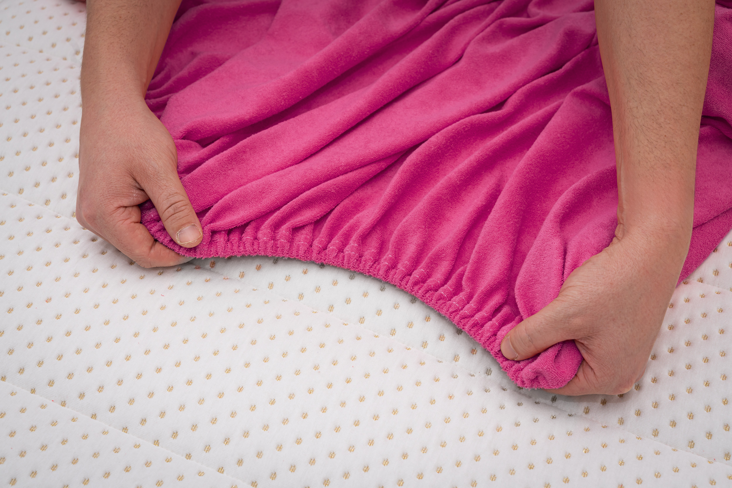 Prześcieradło frotte z gumką w kolorze biskupim wykonane zostało z materiału frotte z wysokiej jakości przędzy czesanej. Dzianina składa się w 82% z bawełny i 18% z poliestru czyli tysięcy bawełnianych pętelek między którymi swobodnie przepływa powietrze. Taka proporcja bawełny do poliestru sprawia, że prześcieradło bardzo dobrze reguluje temperaturę ciała co zapobiega nadmiernemu poceniu się skóry a poliester gwarantuje ciągliwość i wytrzymałość oraz idealne dopasowanie do materaca. Prześcieradło frotte z gumką charakteryzuje się wykorzystaniem przędzy czesanej czyli najbardziej ekskluzywnej dostępnej na rynku o gramaturze 200g/m² która sprawia że prześcieradło jest grube, miękkie i przyjemne w dotyku.
