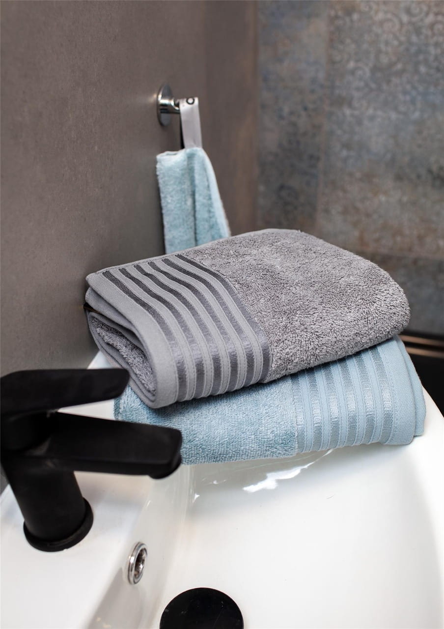 Ręcznik z Modalem Vela w kolorze błękitnym z ozdobną bordiurą w paski został wyprodukowany przez znaną i cenioną markę Faro. Został wykonany z wysokiej jakości przędzy, składającej się w 60% bawełny i 40% modalu, która zapewnia wysokie właściwości higroskopijne czyli zdolność pochłaniania wilgoci. Charakteryzuje się wysoką do codziennego użytku gramaturą 550 g/m², dzięki której szybko schnie. Dodatkowo ręcznik Vela z delikatną bordiurą cechuje się przyjemnym i miękkim chwytem. Świetnie odnajdzie się w klasycznych jak i nowoczesnych wnętrzach tym bardziej, że ręcznik występuje w bardzo bogatej kolorystyce. Z pewnością zadowolą klientów szukających wysokiej jakości w połączeniu z atrakcyjną ceną i eleganckim designem.