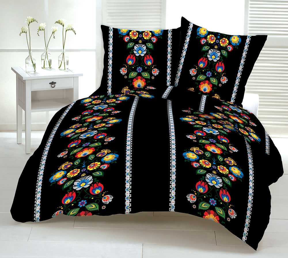 Czarna pościel łowicka bawełniana 160x200 produkowana jest z najwyższej jakości przędz czesanych, które sprawiają, że tkanina ma perfekcyjnie jednorodną powierzchnię, estetyczny wygląd i niesamowitą miękkość. Design pościeli w stylu ludowym to połączenie eleganckiej i ponadczasowej czerni z klasyczną bielą z dodatkiem kolorowych kwiatów łowickich co idealnie połączyło klasykę z nowoczesnością. Folkowy wzór łowicki został narysowany przez polskich projektantów więc mamy do czynienia z produktem w 100% pochodzącym z Polski zaczynając od projektu a kończąc na gotowym produkcie. Dzięki dodatkowemu procesowi wyczesywania włókien tkanina nie posiada zgrubień i innych nieczystości pozostałych po procesie przędzenia bawełny. Gęstość bawełny z której uszyty został komplet pościeli to aż 68 nitek na każde 10 cm². Pościel gwarantuje nam wysoki komfort a dzięki wykonaniu w 100% z naturalnych włókien bawełnianych świetną cyrkulację powietrza oraz gwarancję komfortowego i zdrowego snu. Dodatkowym atutem pościeli wykonanej z bawełny jest wysoka higroskopijność (zdolność pochłaniania wilgoci), odporność na rozciąganie oraz przyjazność dla osób uczulonych lub cierpiących na alergie. Dokładne wykończenie, dbałość o detale oraz estetyczne opakowanie składa się na wysoką jakość produktu. Komplet pościeli z bawełny zapinany jest na bezpieczny i atestowany zamek błyskawiczny kryty plisą. Komplet pościeli z polskiej bawełny może okazać się świetnym pomysłem na prezent.