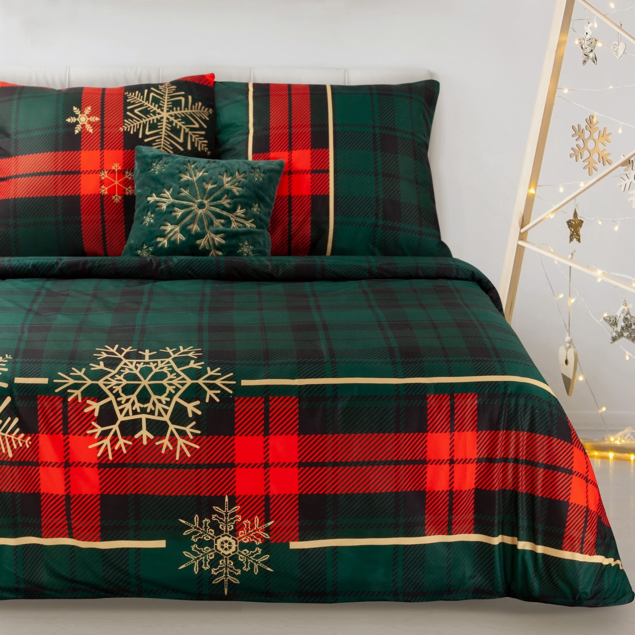 Pościel satyna bawełniana Star z motywem kraty i śnieżynek została wyprodukowana na zlecenie marki Eurofirany. Pościel w kolorystyce czerwieni, zieleni i złota idealnie wpasuje się do wnętrza klasycznej jak i nowoczesnej sypialni. Do produkcji użyto specjalnie wyselekcjonowanych bardzo włókien bawełny o gramaturze 115g/m², dzięki czemu jest ona lekka i miła w dotyku. Lekka, naturalna tkanina zapewnia komfort snu, a ponadto jest łatwa w prasowaniu. Przyjemna w dotyku satyna bawełniana zapewnia uczucie chłodu w gorące noce, a w zimie przyjemnie otula i zapewnia ciepło. Materiał z którego wykonano pościel został poddany procesowi sanforyzacji czyli wykurczania, dzięki czemu pościel nie kurczy się i nie zmienia rozmiarów w trakcie użytkowania i konserwacji. Pościel Christmas Collection nie podrażnia skóry, jest przewiewna i niezwykle miła dla ciała.