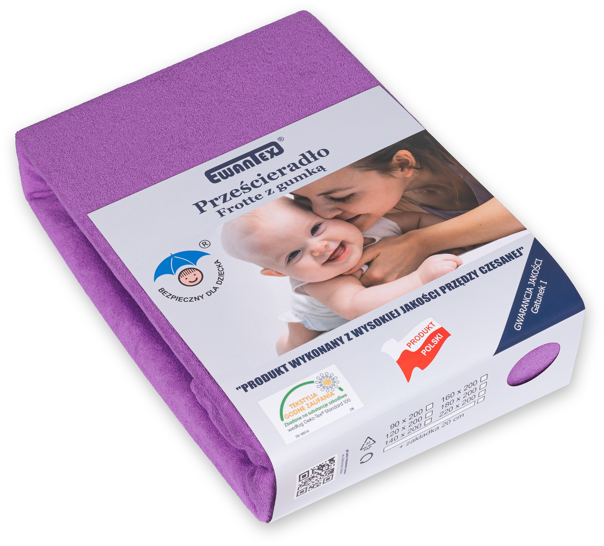 Prześcieradło frotte z gumką w kolorze fioletowym wykonane zostało z materiału frotte z wysokiej jakości przędzy czesanej. Dzianina składa się w 82% z bawełny i 18% z poliestru czyli tysięcy bawełnianych pętelek między którymi swobodnie przepływa powietrze. Taka proporcja bawełny do poliestru sprawia, że prześcieradło bardzo dobrze reguluje temperaturę ciała co zapobiega nadmiernemu poceniu się skóry a poliester gwarantuje ciągliwość i wytrzymałość oraz idealne dopasowanie do materaca. Prześcieradło frotte z gumką charakteryzuje się wykorzystaniem przędzy czesanej czyli najbardziej ekskluzywnej dostępnej na rynku o gramaturze 200g/m² która sprawia że prześcieradło jest grube, miękkie i przyjemne w dotyku.