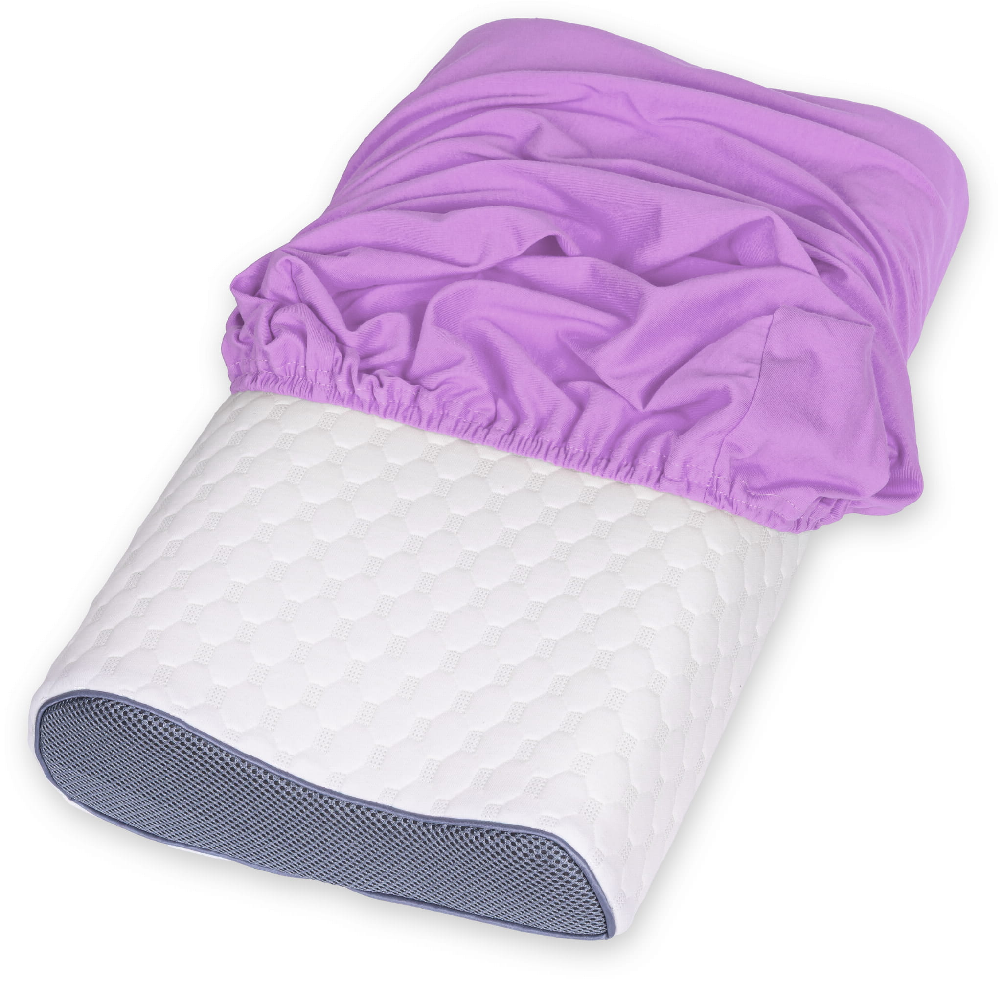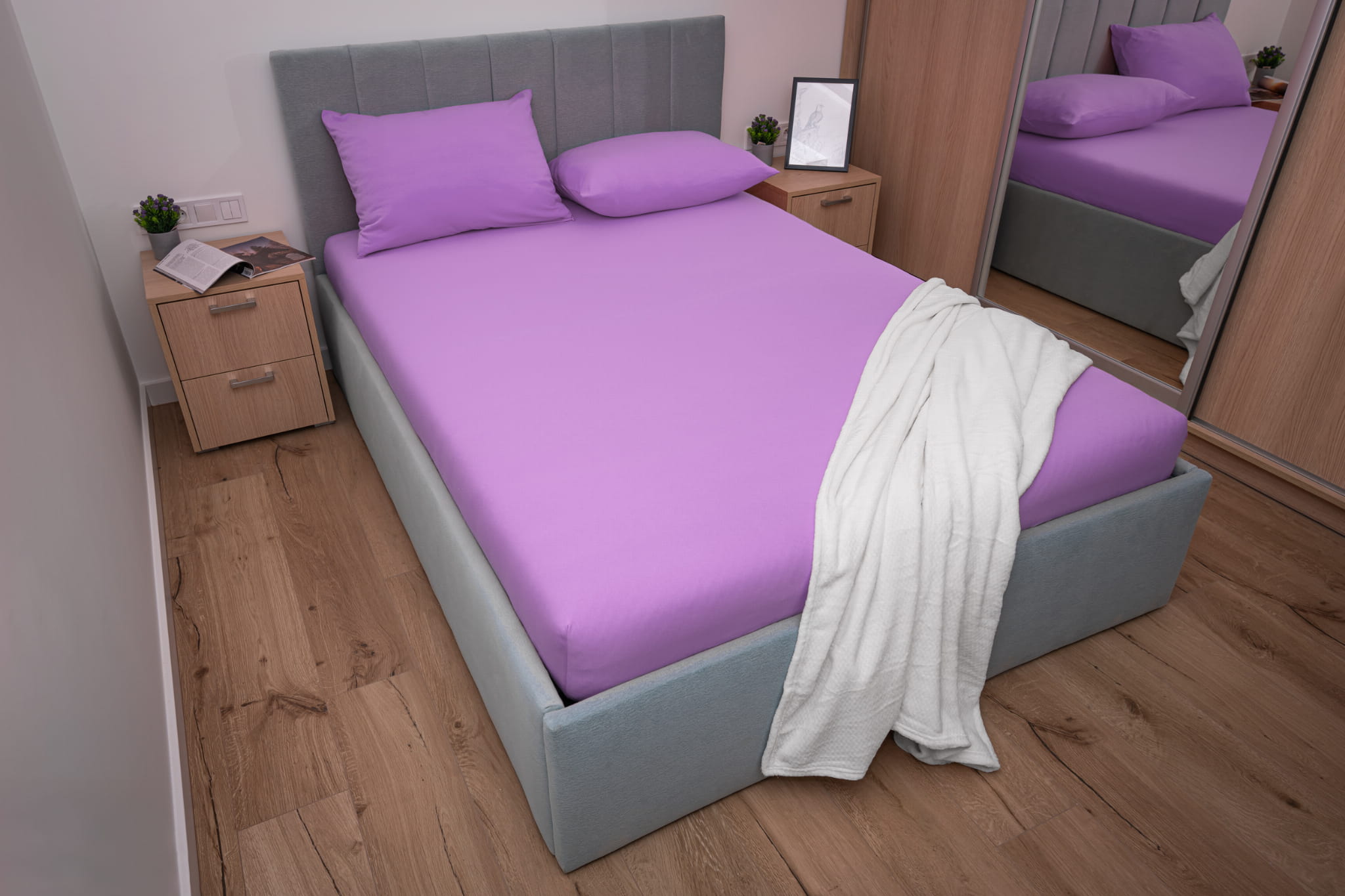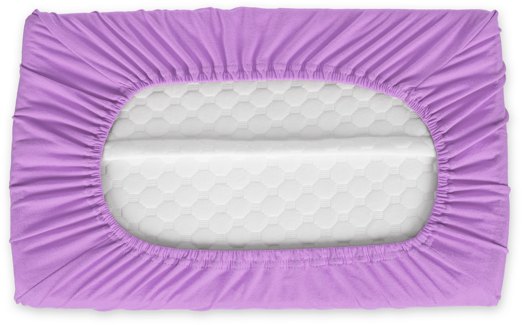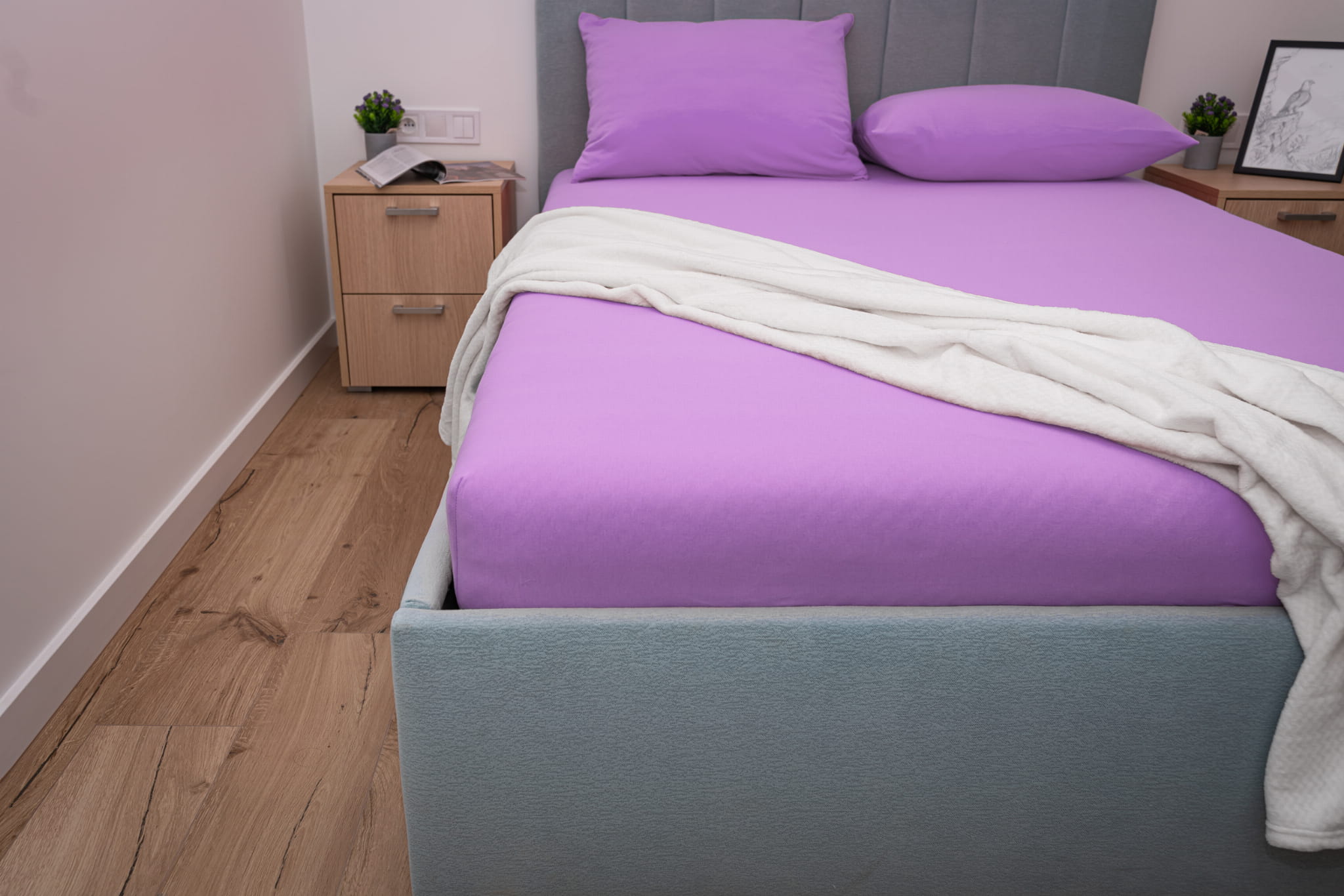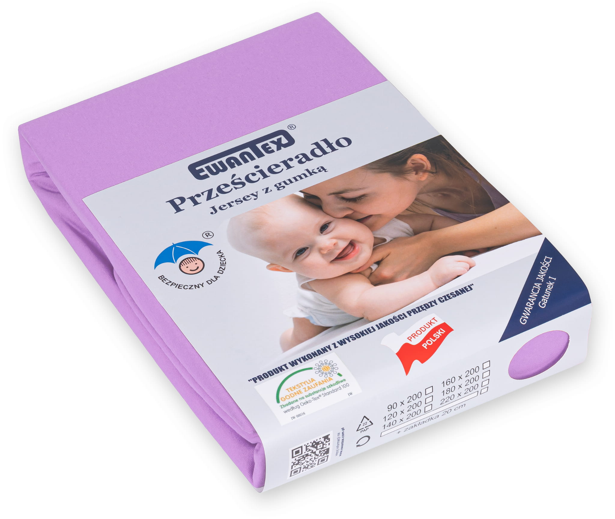 Prześcieradło jersey z gumką w kolorze fioletowym wykonane zostało z materiału jersey z wysokiej jakości przędzy czesanej składającej się w 100% z bawełny. Dzięki wykonaniu z naturalnych włókien bawełnianych prześcieradło bardzo dobrze reguluje temperaturę ciała co zapobiega nadmiernemu poceniu się skóry. Prześcieradło jersey z gumką charakteryzuje się wykorzystaniem przędzy czesanej czyli najbardziej ekskluzywnej dostępnej na rynku o gramaturze 155 g/m² która sprawia że prześcieradło jest gładkie, miękkie i aksamitne w dotyku.