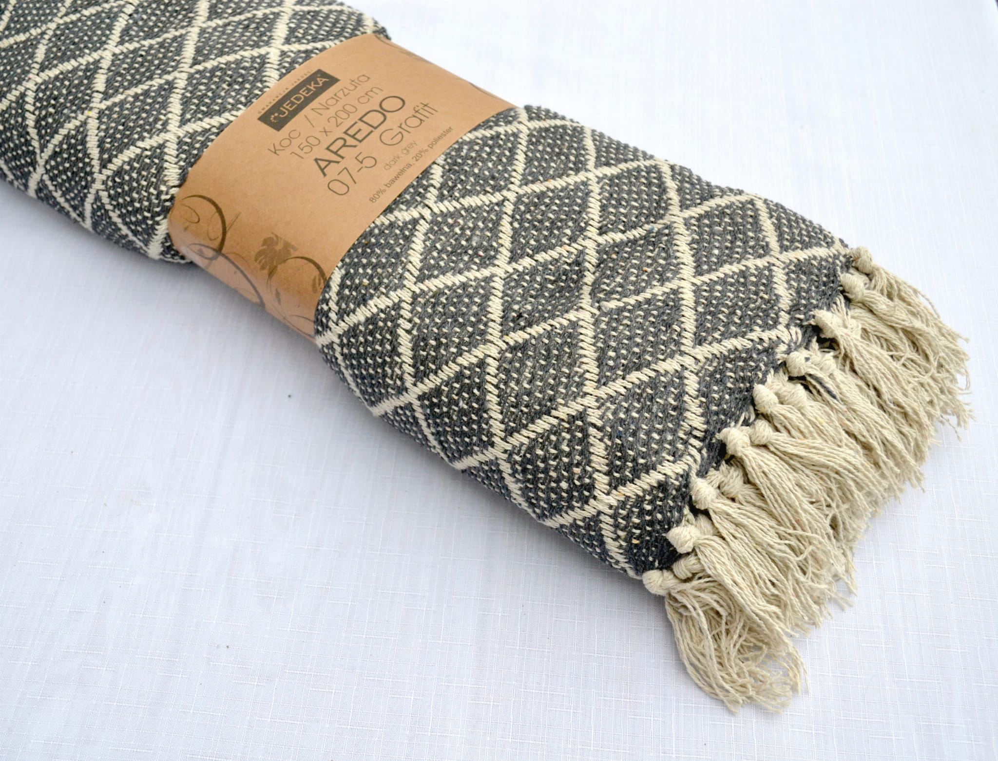 Koc bawełniany Aredo 07-5 150x200 pochodzi z kolekcji marki Jedeka, która stawia na naturalne i efektowne wzornictwo. Koc wykonany jest w 80% bawełny i 20% poliestru dzięki czemu nie krępuje ruchów podczas użytkowania. Do tego jest bardzo elegancki i starannie wykończony. Świetnie prezentuje się w każdym wnętrzu dodając elegancji i ciepła. Użytkowanie takiego koca to sama przyjemność dla Ciebie lub dla osoby, którą chcesz obdarować. Produkt świetnie spełnia zadanie przytulnego i ciepłego koca oraz narzuty na łóżko. Ozdobiony jest frędzlami.