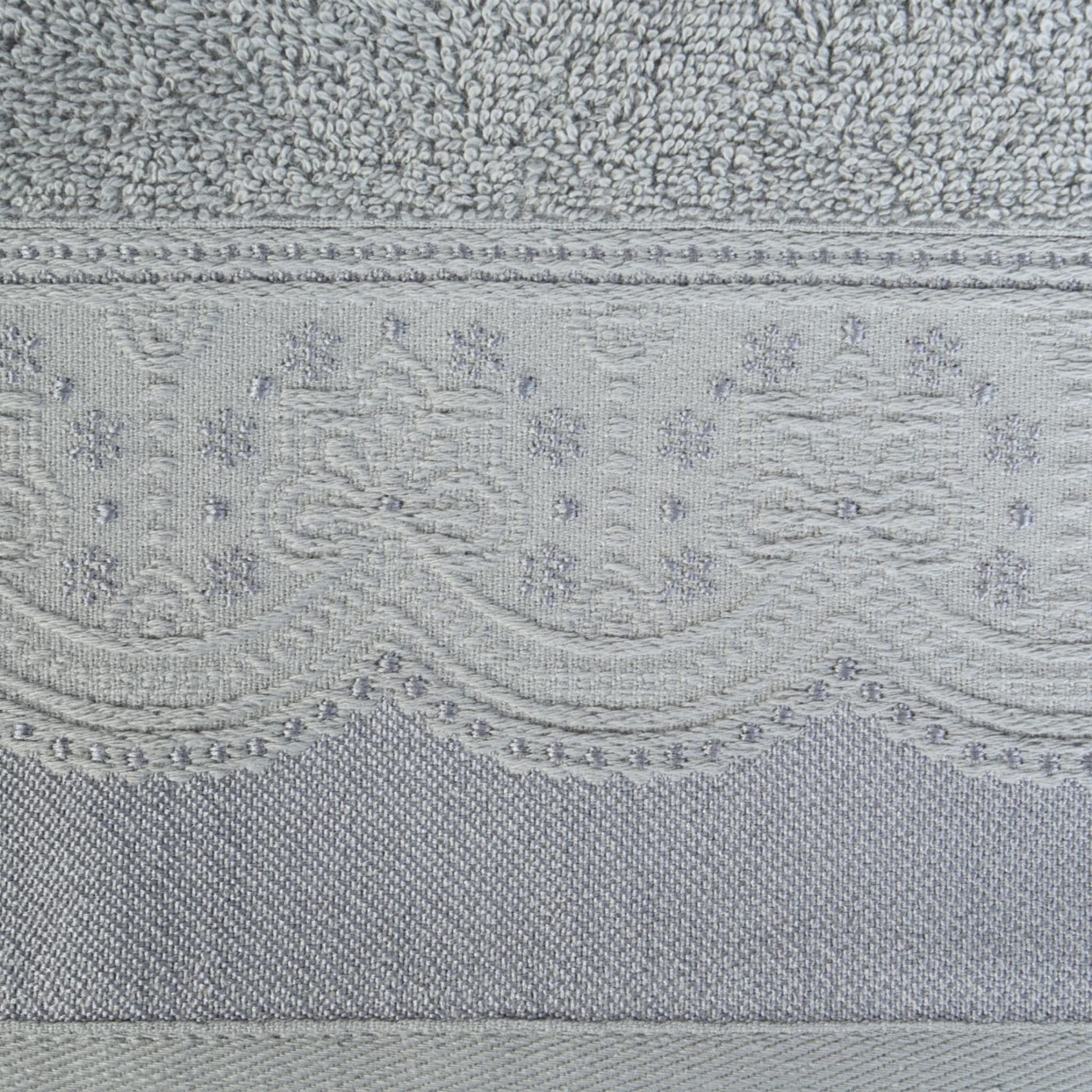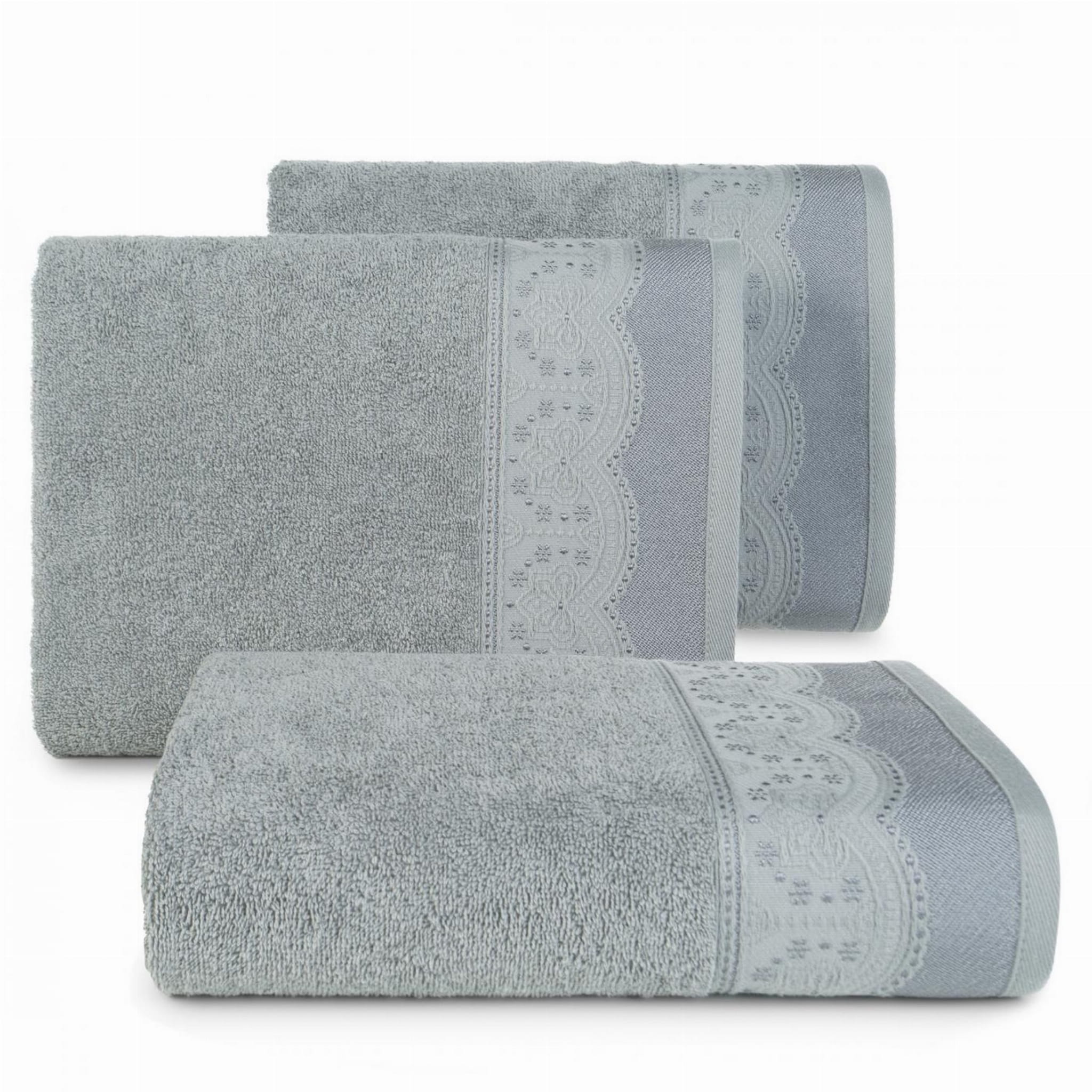 Ręcznik bawełniany Tina w kolorze grafitowym z ozdobną bordiurą został wyprodukowany przez znaną i cenioną markę Eurofirany. Został wykonany z wysokiej jakości przędzy frotte, składającej się w 100% bawełny, która zapewnia wysokie właściwości higroskopijne czyli zdolność pochłaniania wilgoci. Charakteryzuje się optymalną do codziennego użytku gramaturą 450 g/m², dzięki której szybko schnie. Dodatkowo ręcznik cechuje się przyjemnym i miękkim chwytem. Świetnie odnajdzie się w klasycznych jak i nowoczesnych wnętrzach tym bardziej, że ręcznik występuje w bardzo bogatej kolorystyce. Z pewnością zadowolą klientów szukających wysokiej jakości w połączeniu z atrakcyjną ceną i eleganckim designem.