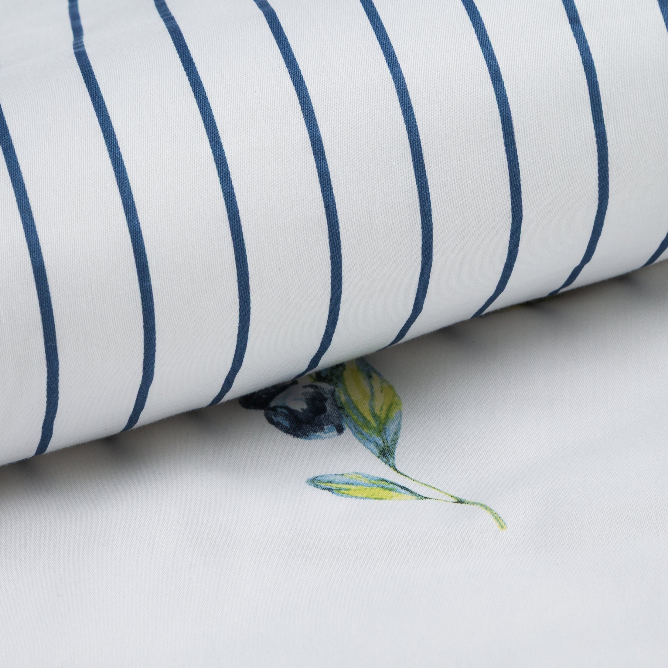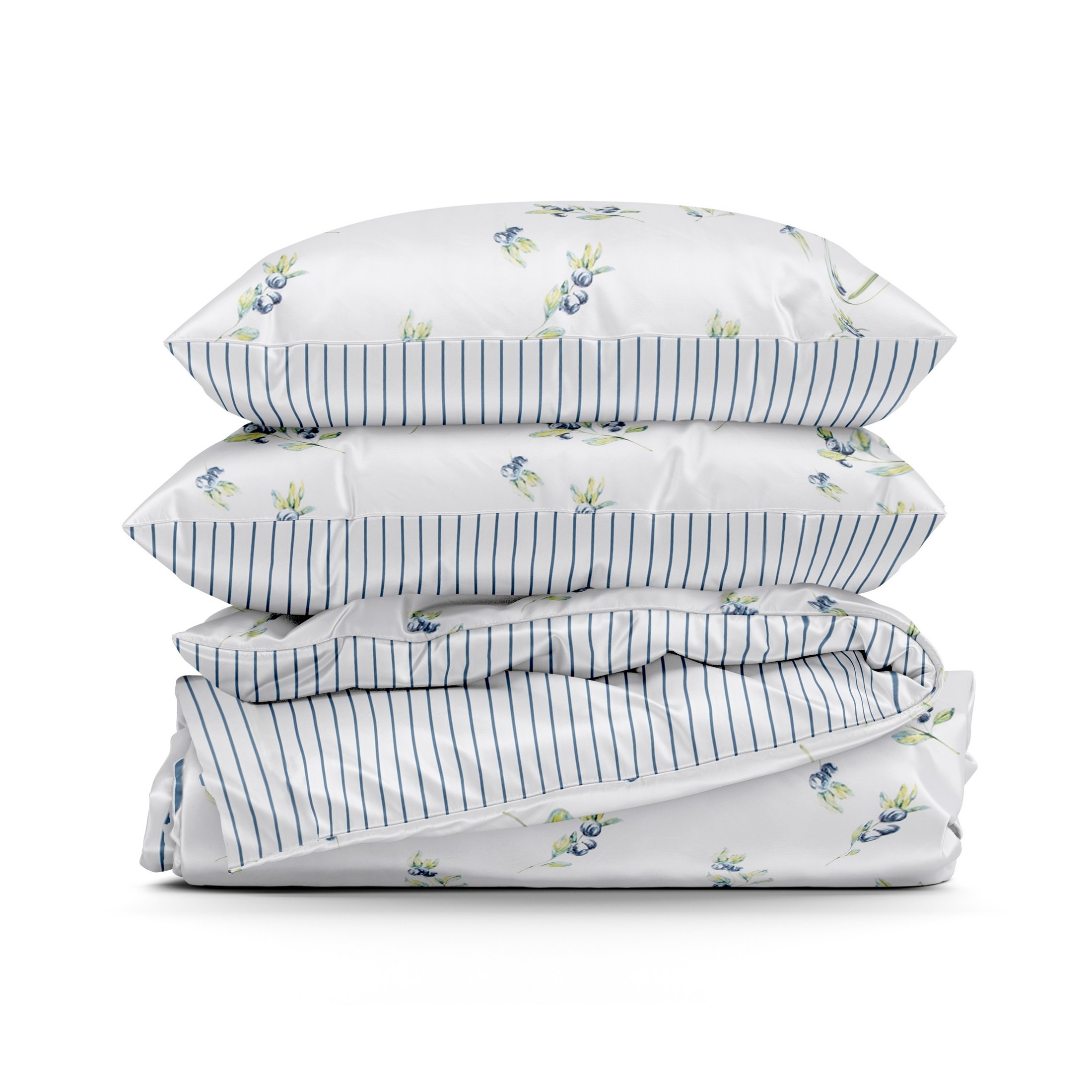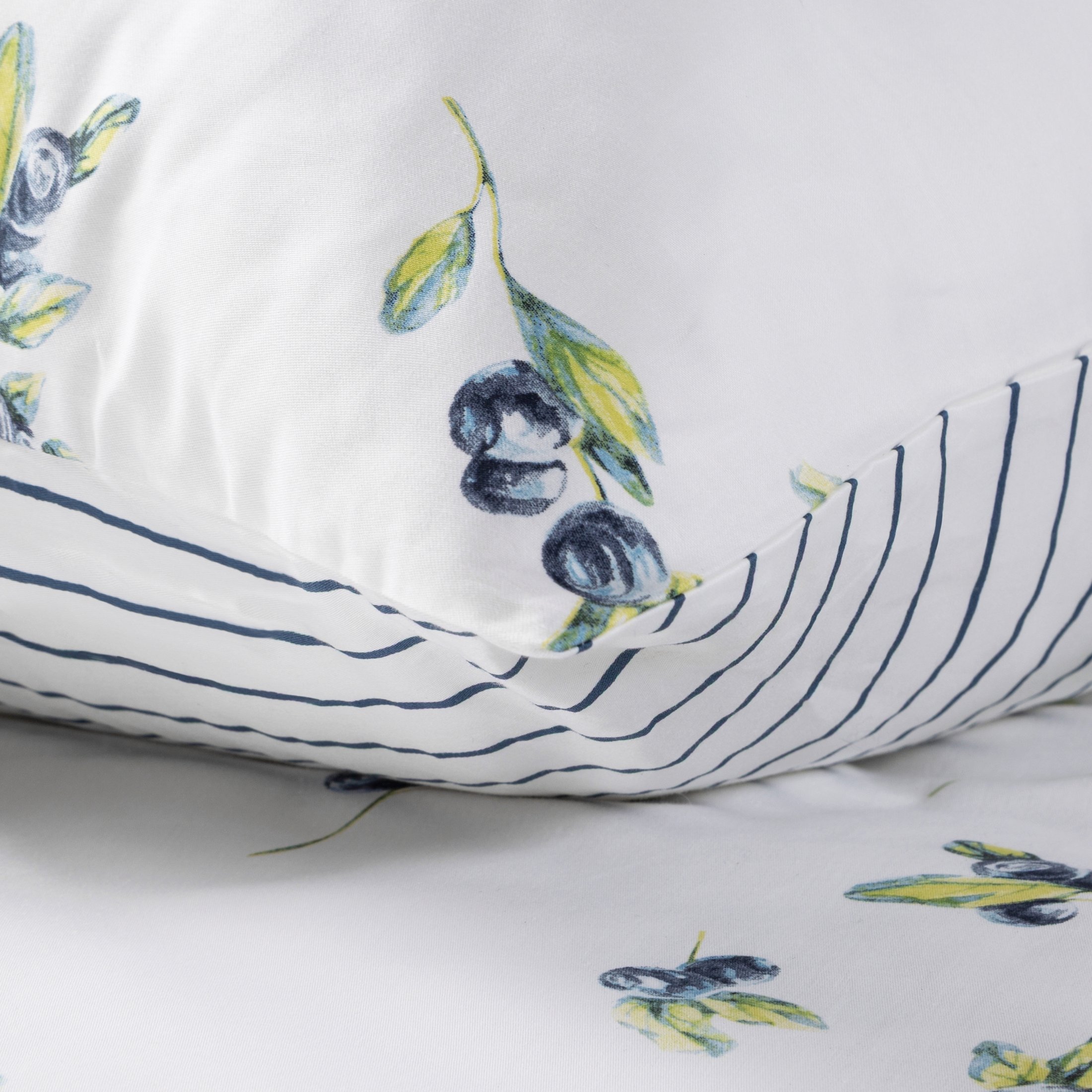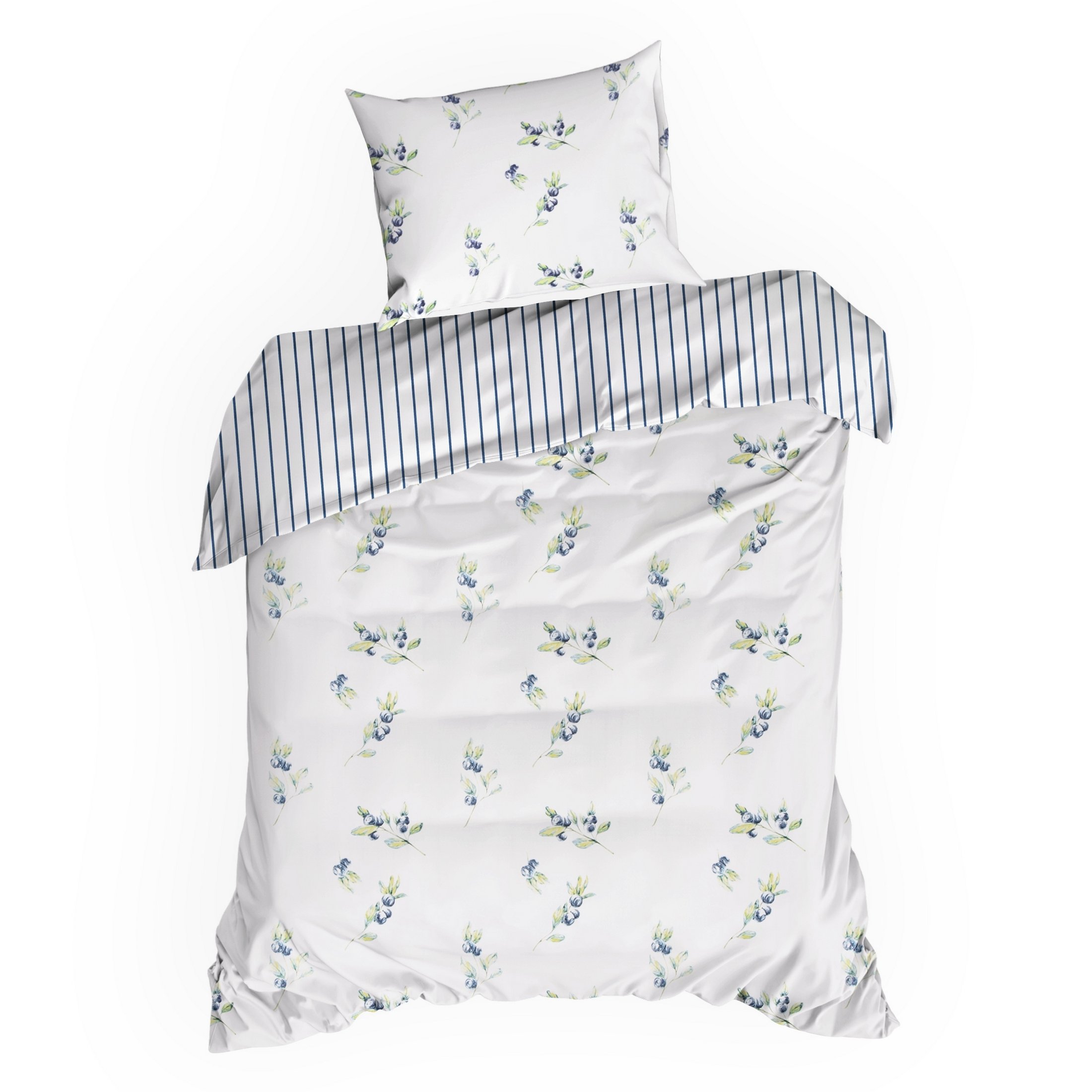 Komplet pościeli Raya 4 z borówkami, uszyto z wysokiej jakości satyny bawełnianej z nadrukiem pasków. Pościel została wyprodukowana na zlecenie marki Eurofirany. Nowoczesna technika nadruku rotacyjnego, gwarantuje wyrazisty wzór, nasycone kolory granatu i bieli to niezwykłe przejścia kolorystyczne które sprawia, że nadruk nie traci swojej intensywności, nawet po wielu praniach. Proces sanforyzacji, daje gwarancję niezmienności rozmiaru, dzięki niemu pościel nie kurczy się nawet po wielu praniach. Pościel o gramaturze 115g/m² nie podrażnia skóry, jest przewiewna i niezwykle miła dla ciała.