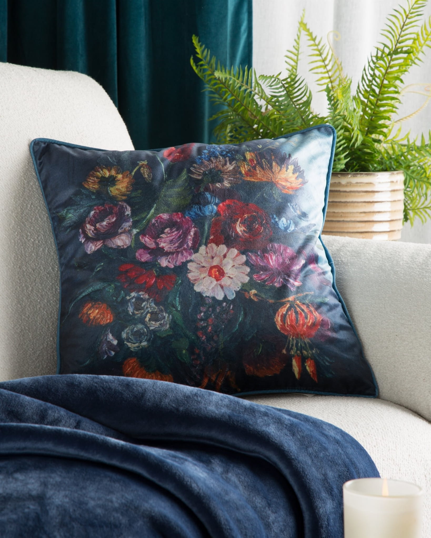 Poszewka dekoracyjna velvetowa 112 z motywem kwiatów na poduszkę w rozmiarze 45x45 cm została estetycznie wykonana z materiału składającego się z poliestru, dzięki czemu posiada bardzo intensywną barwę i jest niezwykle przyjemna w dotyku. Zaprojektowana w nowoczesnej formie z miękkiego i miłego w dotyku velvetu.