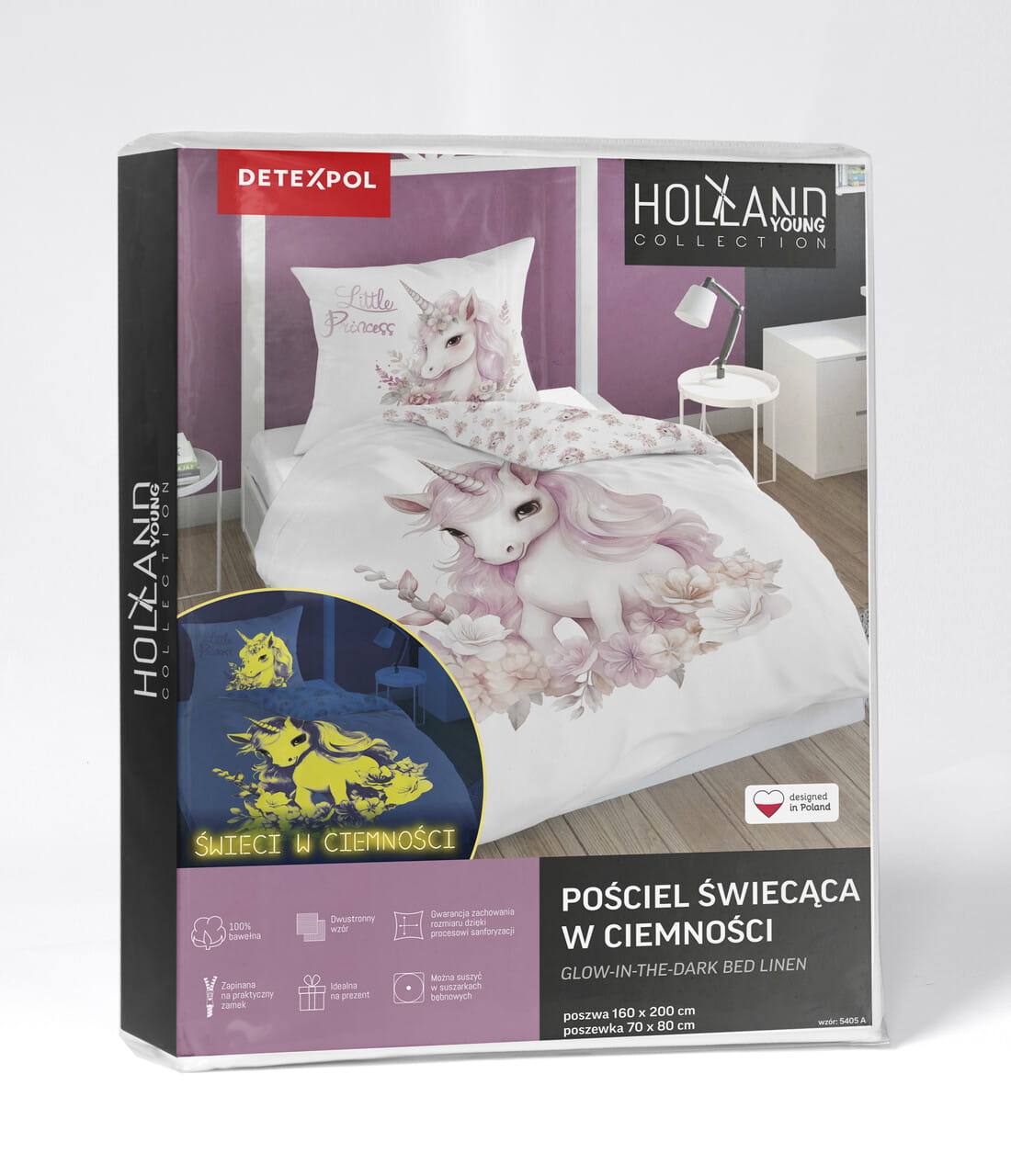 Pościel dla dzieci fluo świecąca w ciemności z Jednorożcem 5405A wykonana jest w 100% z bawełny co jest bardzo istotne przy produktach przeznaczonych dla dzieci. Bawełna jest naturalna i pozwala skórze swobodnie oddychać. Tkanina posiada Certyfikat Oeko-Tex Standard 100 co oznacza, że została przebadana i nie zawiera substancji szkodliwych dla dziecka oraz substancji powodujących alergie.