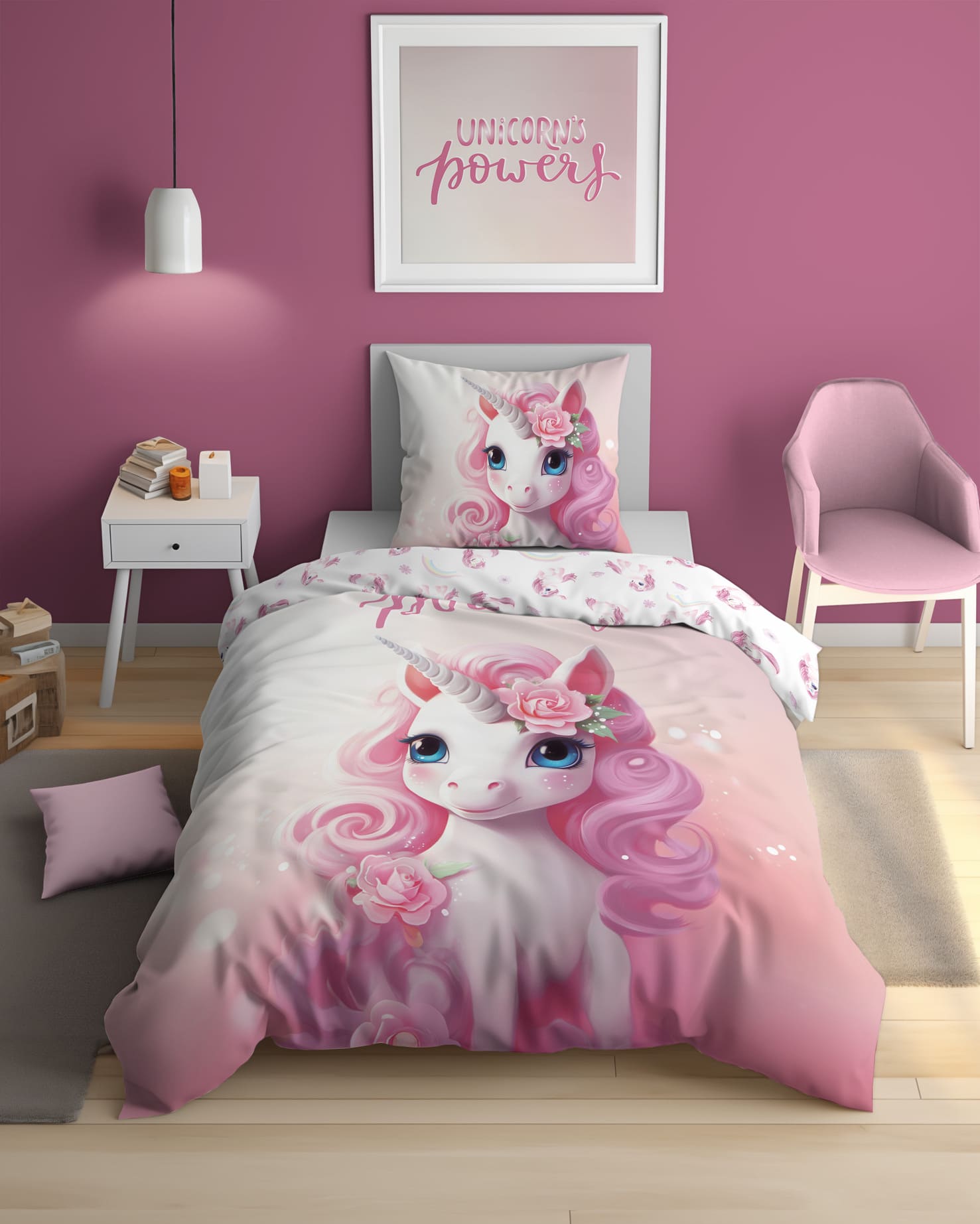 Kolorowy nadruk na pościeli wprowadzi do sypialni przyjazną atmosferę i pozwoli cieszyć się spokojnym snem z jednorożcem. Dodatkowo wzór pościeli jest dwustronny więc możemy wybrać w jaki sposób zaaranżujemy sypialnie. Pościel Jednorożec zapinana jest na bezpieczny i atestowany zamek błyskawiczny, który ułatwia i przyśpiesza wymianę pościeli. Pościel może okazać się idealną propozycją na prezent.