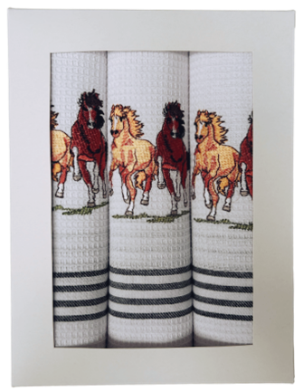 Zestaw 3 ścierek bawełnianych do kuchni z haftem Koni. Nowoczesne i ciekawe wzornictwo sprawdzi się w każdej kuchni, zarówno tej o klasycznym jak i nowoczesnym charakterze. Ściereczka została w całości uszyta oraz nadrukowana w Polsce. Dzięki wykonaniu ścierki ze 100% bawełny ściereczki dobrze chłoną wodę.