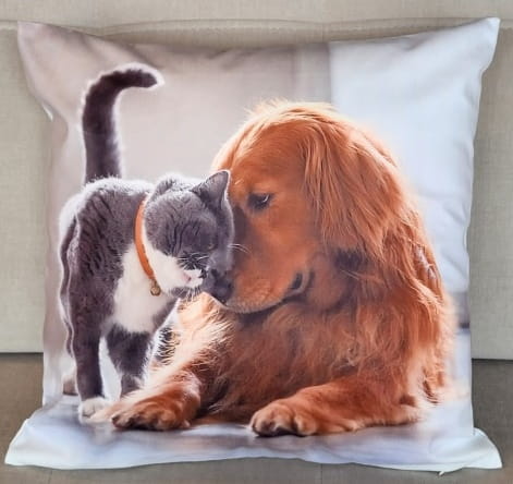 Poszewka dekoracyjna z Kotkiem i Pieskiem w rozmiarze 40x40 cm została estetycznie wykonana z materiału typu welur. Dzięki temu poszewka posiada bardzo intensywną barwę i jest niezwykle przyjemna w dotyku. Zaprojektowana w nowoczesnej formie z miękkiego i miłego w dotyku weluru zdobionego nadrukiem. Idealnie uzupełnienie salonu, pokoju lub sypialni.