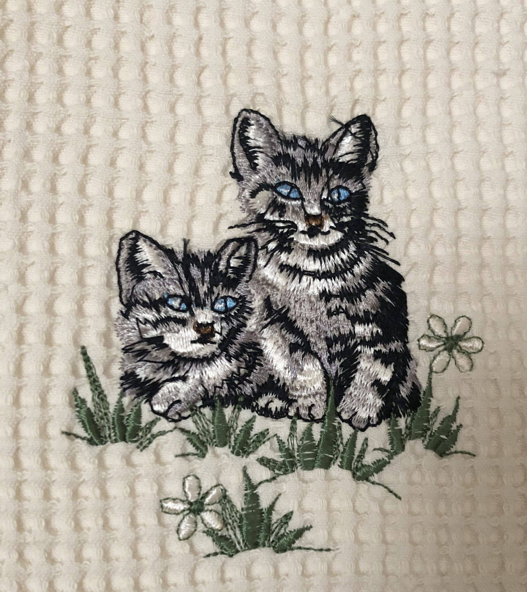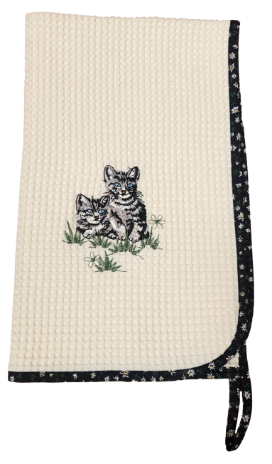 Ręcznik kuchenny 50x70 w kolorze kremowym z haftem kotów został wykonana przez firmę Jedeka. Ręcznik wykonany w 100% z wafla, niezwykle praktyczny i trwały. Sprawdzi się w każdej kuchni. Bardzo dobrze chłonie wodę. Przydatny w kuchni podczas gotowania, może okazać się atrakcyjnym prezentem i pięknym elementem dekoracyjnym każdej kuchni. Posiada uchwyt i jest wykończony lamówką.