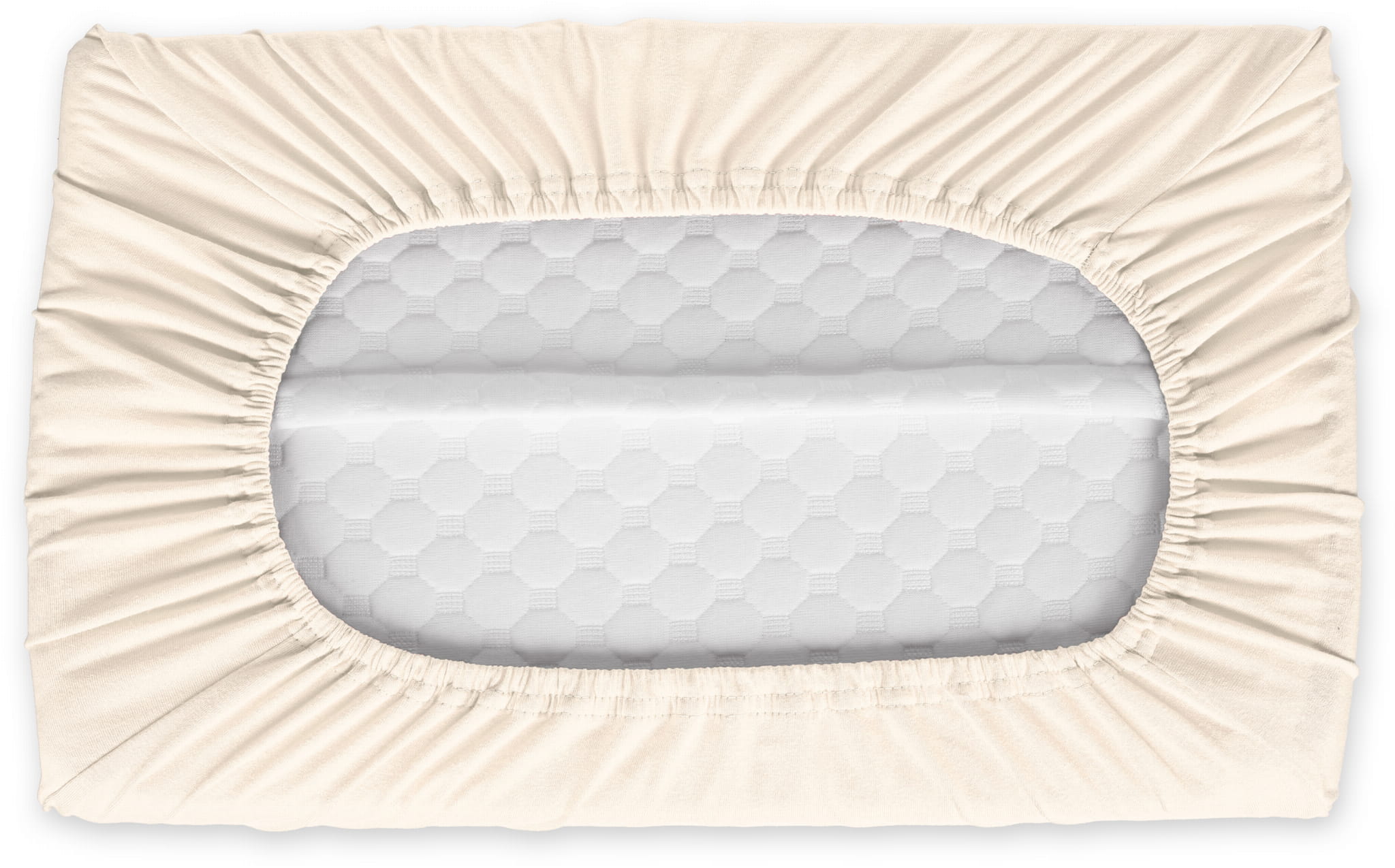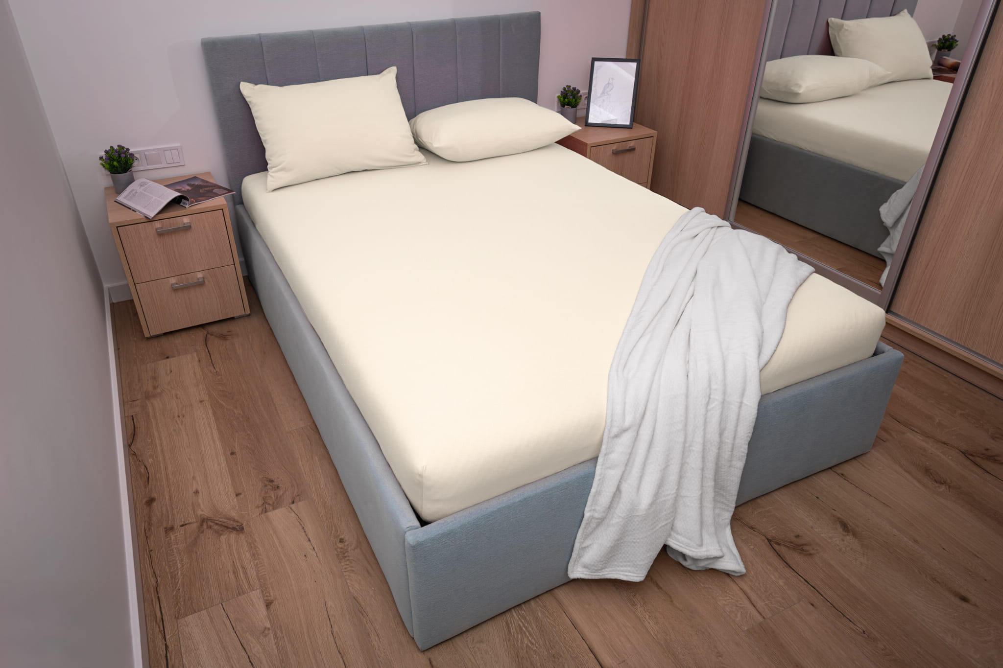 Prześcieradło jersey z gumką w kolorze kremowym wykonane zostało z materiału jersey z wysokiej jakości przędzy czesanej składającej się w 100% z bawełny. Dzięki wykonaniu z naturalnych włókien bawełnianych prześcieradło bardzo dobrze reguluje temperaturę ciała co zapobiega nadmiernemu poceniu się skóry. Prześcieradło jersey z gumką charakteryzuje się wykorzystaniem przędzy czesanej czyli najbardziej ekskluzywnej dostępnej na rynku o gramaturze 155 g/m² która sprawia że prześcieradło jest gładkie, miękkie i aksamitne w dotyku.