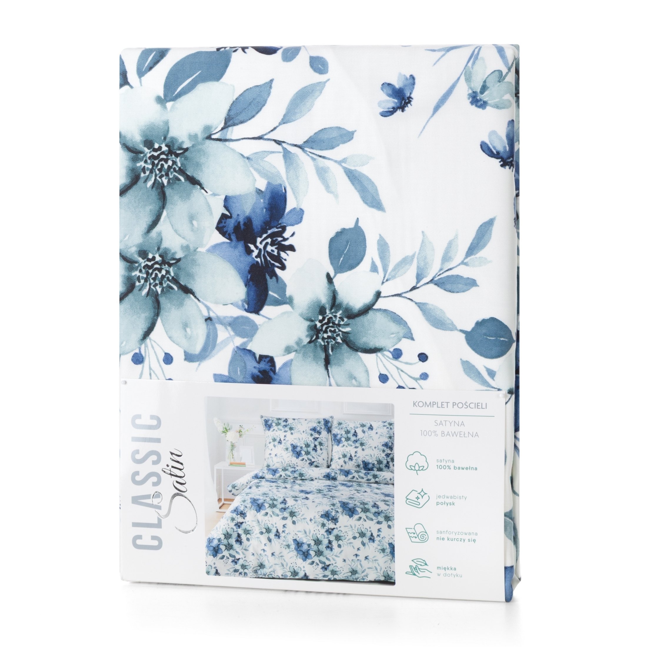 Komplet pościeli Spring 54, uszyto z wysokiej jakości satyny bawełnianej z nadrukiem kwiatów. Pościel została wyprodukowana na zlecenie marki Eurofirany. Nowoczesna technika nadruku rotacyjnego, gwarantuje wyrazisty wzór, nasycone kolory bieli i chabru to niezwykłe przejścia kolorystyczne które sprawia, że nadruk nie traci swojej intensywności, nawet po wielu praniach. Proces sanforyzacji, daje gwarancję niezmienności rozmiaru, dzięki niemu pościel nie kurczy się nawet po wielu praniach. Pościel o gramaturze 115g/m² nie podrażnia skóry, jest przewiewna i niezwykle miła dla ciała.
