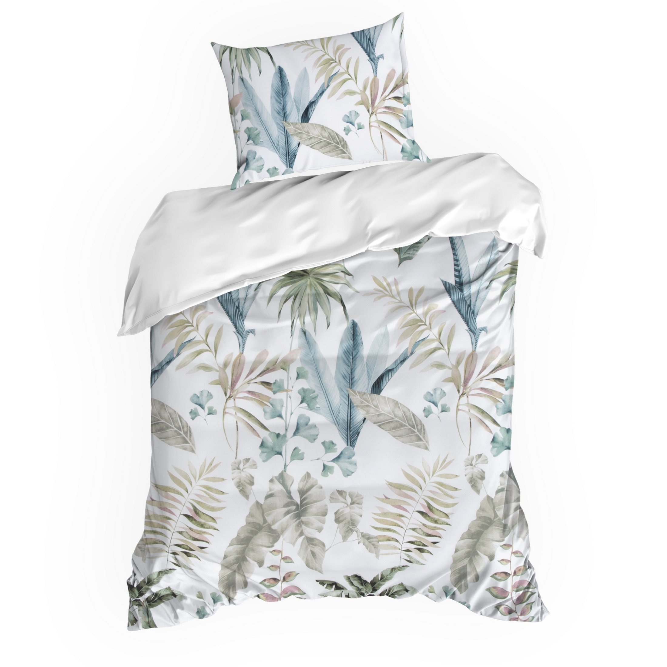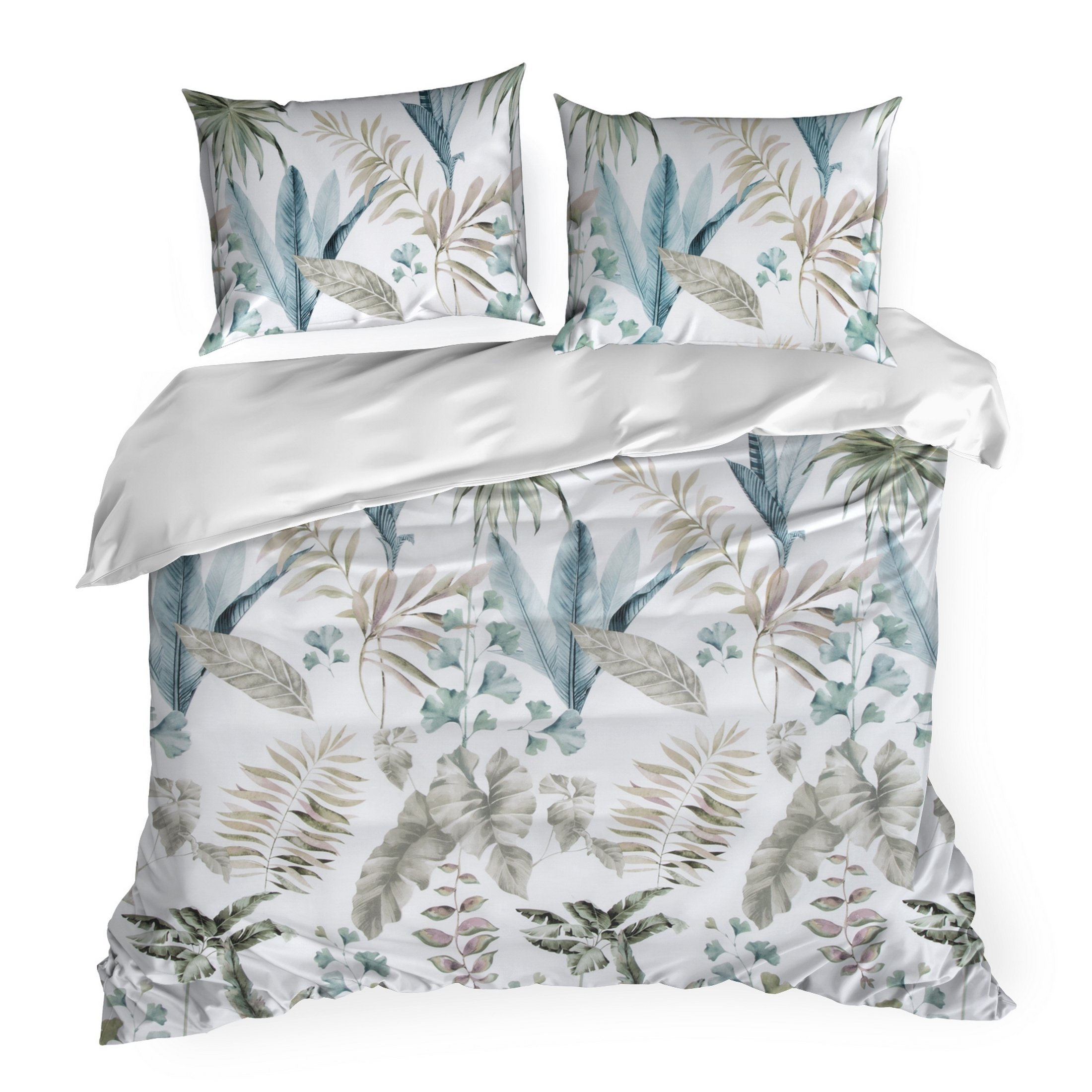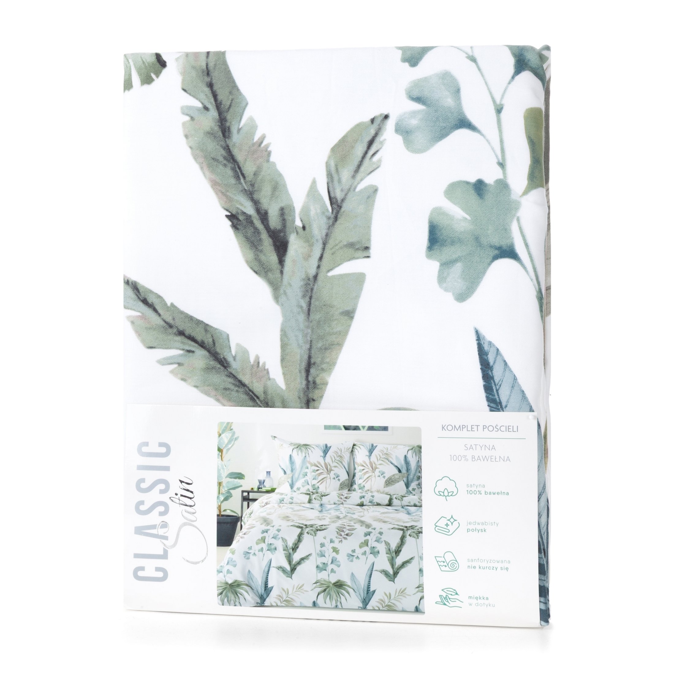 Komplet pościeli Spring 52, uszyto z wysokiej jakości satyny bawełnianej z nadrukiem liści. Pościel została wyprodukowana na zlecenie marki Eurofirany. Nowoczesna technika nadruku rotacyjnego, gwarantuje wyrazisty wzór, nasycone kolory bieli, zieleni to niezwykłe przejścia kolorystyczne które sprawia, że nadruk nie traci swojej intensywności, nawet po wielu praniach. Proces sanforyzacji, daje gwarancję niezmienności rozmiaru, dzięki niemu pościel nie kurczy się nawet po wielu praniach. Pościel o gramaturze 115g/m² nie podrażnia skóry, jest przewiewna i niezwykle miła dla ciała.