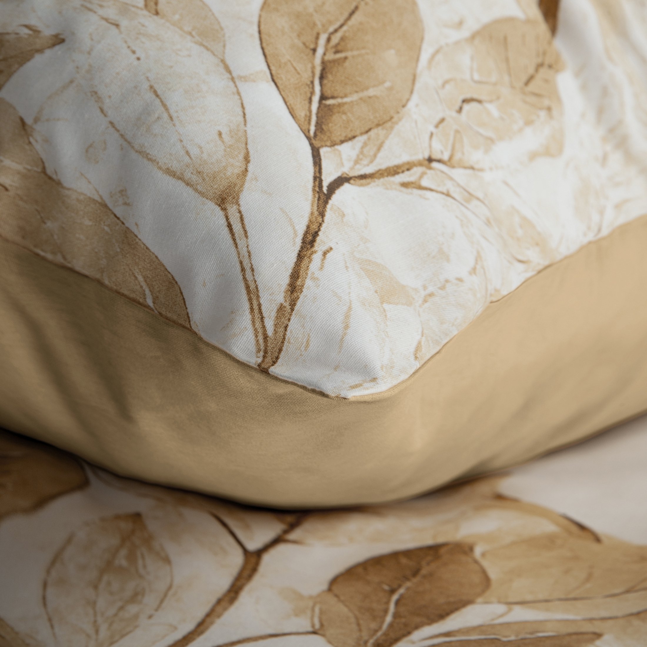 Komplet pościeli Spring 60, uszyto z wysokiej jakości satyny bawełnianej z nadrukiem liści. Pościel została wyprodukowana na zlecenie marki Eurofirany. Nowoczesna technika nadruku rotacyjnego, gwarantuje wyrazisty wzór, nasycone kolory beżu i bieli to niezwykłe przejścia kolorystyczne które sprawia, że nadruk nie traci swojej intensywności, nawet po wielu praniach. Proces sanforyzacji, daje gwarancję niezmienności rozmiaru, dzięki niemu pościel nie kurczy się nawet po wielu praniach. Pościel o gramaturze 115g/m² nie podrażnia skóry, jest przewiewna i niezwykle miła dla ciała.