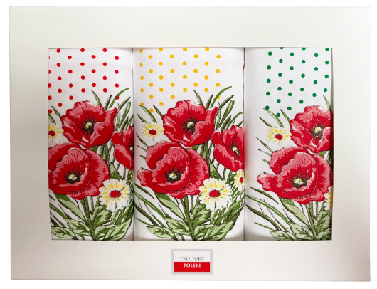 Zestaw 3 ścierek bawełnianych do kuchni z nadrukiem Maków. Nowoczesne i ciekawe wzornictwo sprawdzi się w każdej kuchni, zarówno tej o klasycznym jak i nowoczesnym charakterze. Ściereczka została w całości uszyta oraz nadrukowana w Polsce. Dzięki wykonaniu ścierki ze 100% bawełny ściereczki dobrze chłoną wodę.