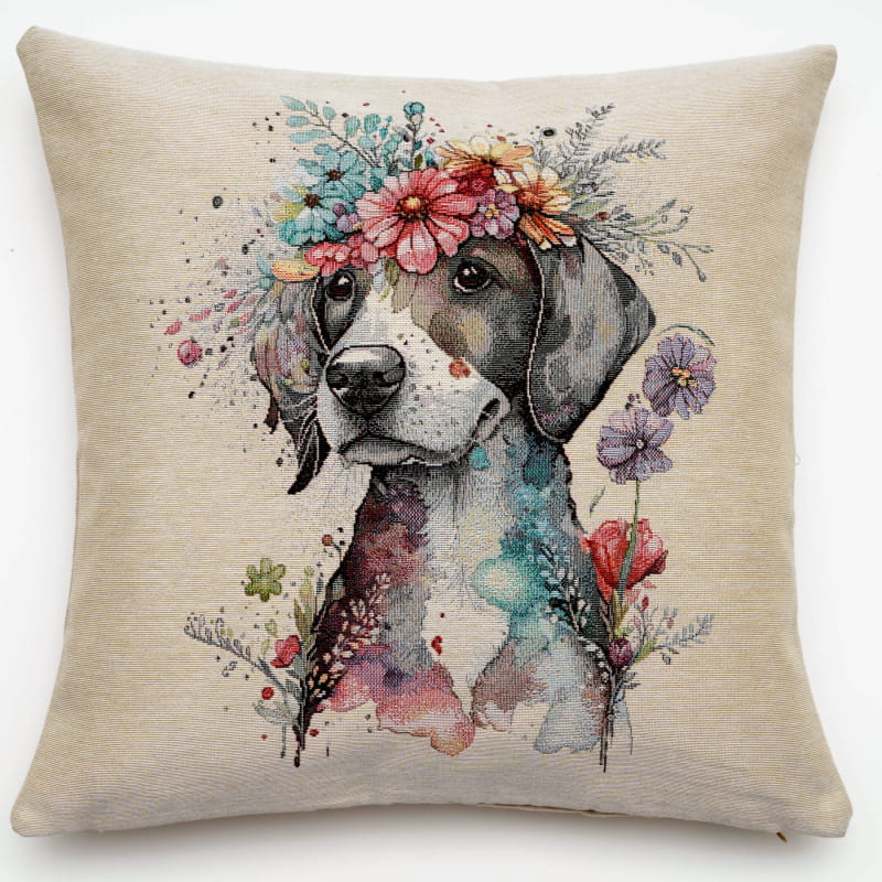 Piękna dekoracyjna poszewka Gobelin Malowany Pies 45x45 na poduszkę elegancko ozdobi Twoje wnętrze. Zasuwana na zamek błyskawiczny. Poszewka dwustronna.