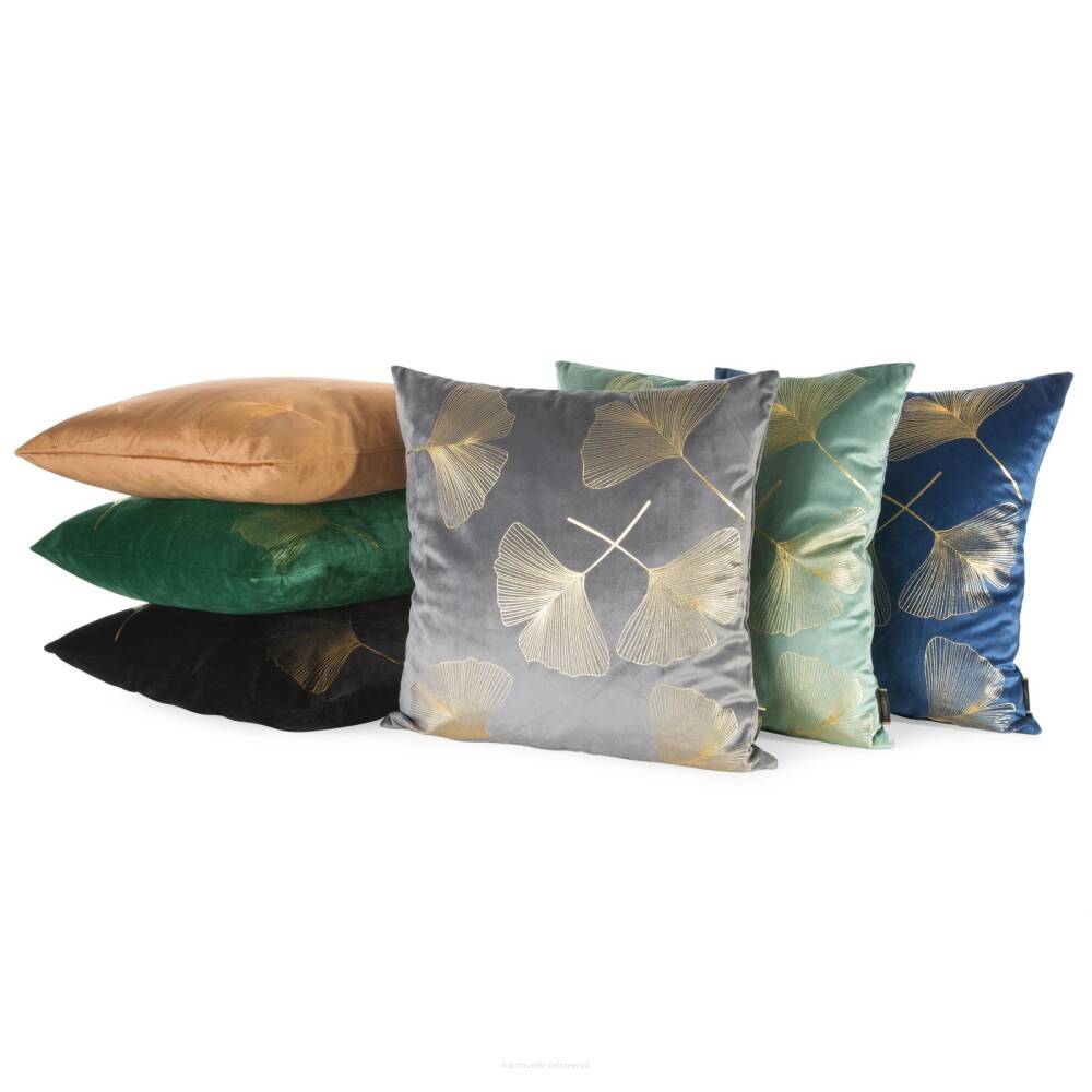 Poszewka dekoracyjna velvetowa Ginko 1 na poduszkę ze wzorem liści miłorzębu japońskiego w rozmiarze 45x45cm została estetycznie wykonana z materiału składającego się z poliestru, dzięki czemu posiada bardzo intensywną barwę i jest niezwykle przyjemna w dotyku. Zaprojektowana w nowoczesnej formie z miękkiego i miłego w dotyku velvetu zdobionego złotym nadrukiem.