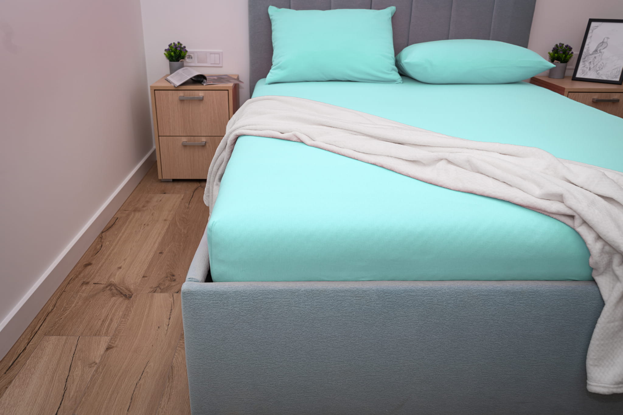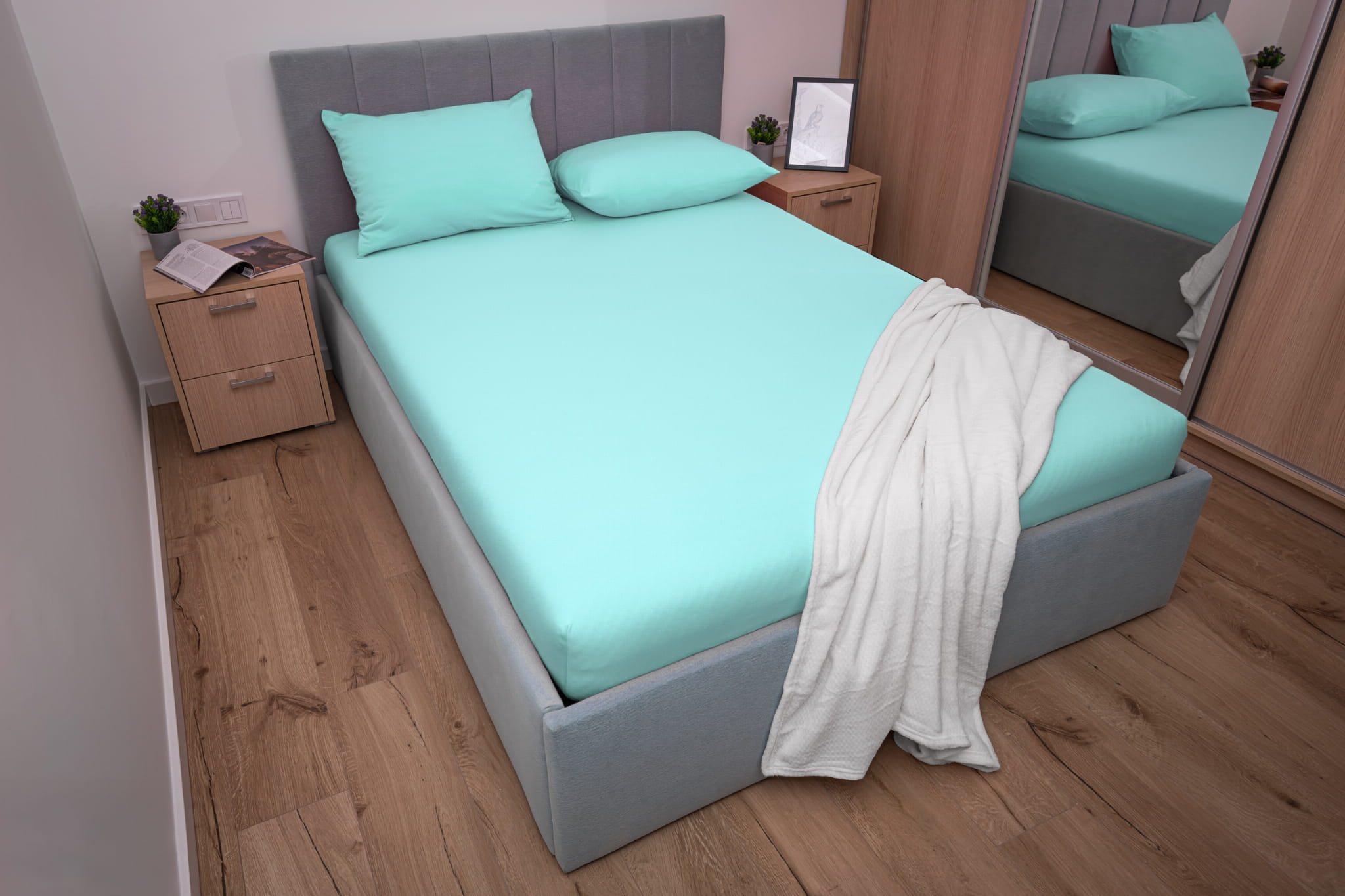 Prześcieradło jersey z gumką w kolorze miętowym wykonane zostało z materiału jersey z wysokiej jakości przędzy czesanej składającej się w 100% z bawełny. Dzięki wykonaniu z naturalnych włókien bawełnianych prześcieradło bardzo dobrze reguluje temperaturę ciała co zapobiega nadmiernemu poceniu się skóry. Prześcieradło jersey z gumką charakteryzuje się wykorzystaniem przędzy czesanej czyli najbardziej ekskluzywnej dostępnej na rynku o gramaturze 155 g/m² która sprawia że prześcieradło jest gładkie, miękkie i aksamitne w dotyku.