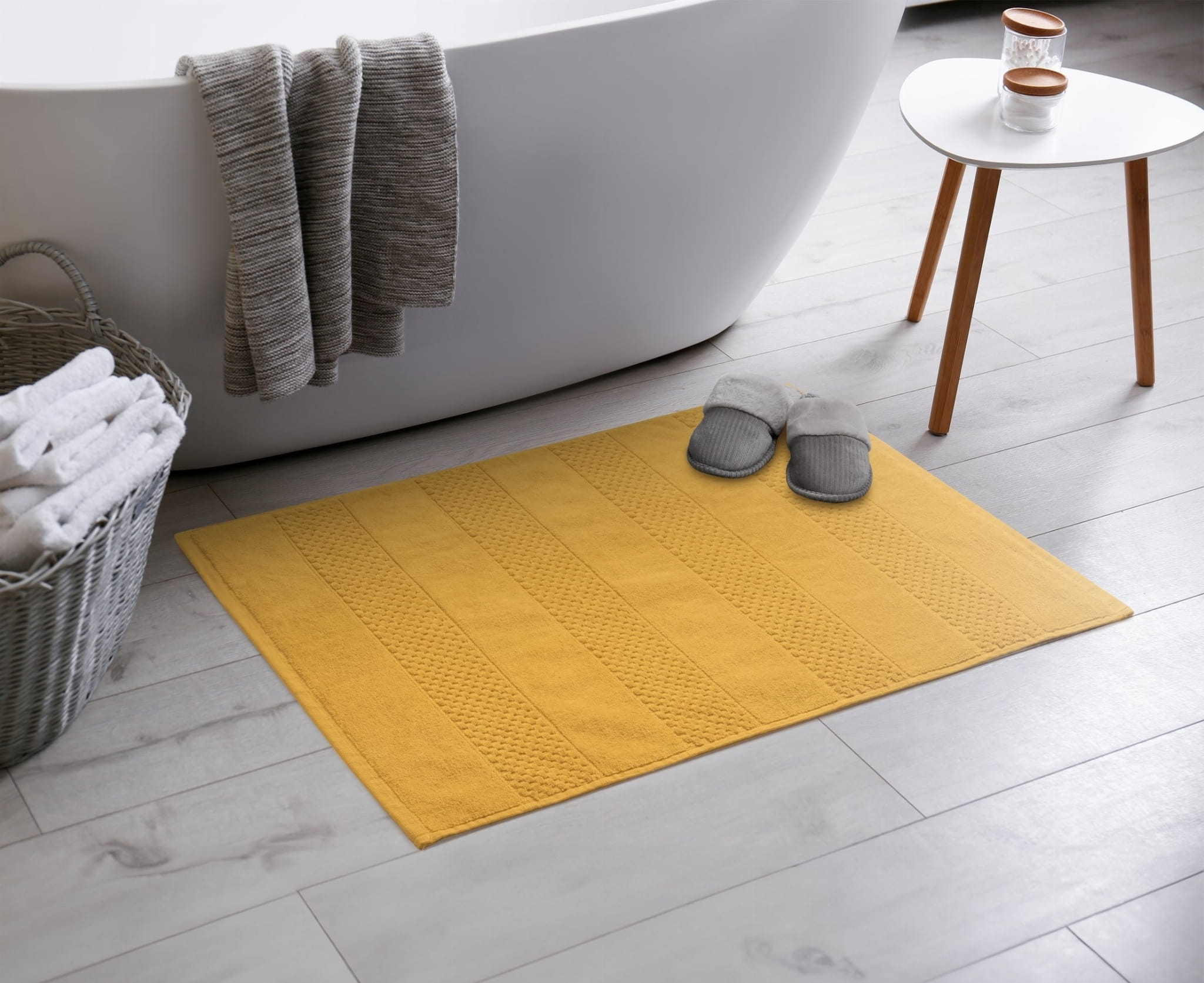 Dywanik łazienkowy 50x70 w kolorze musztardowym został wyprodukowany przez firmę Eurofirany. Mata łazienkowa została specjalnie zaprojektowana aby po skończonej kąpieli przyjąć dużą ilość wody i wilgoci z naszych stóp. Posiadają dużo wyższą gramaturę niż klasyczny ręcznik kąpielowy dzięki czemu są bardzo wytrzymałe i odporne na wycieranie. Wykonane zostały w 98% z wysokogatunkowej bawełny i 2% wiskozy o gramaturze 750g/m2, która dzielnie znosi częste pranie. Ciekawy wzór wskazuje na przeznaczenie produktu i idealnie skomponuje się z wnętrzem naszej łazienki. Prać w 60°C.