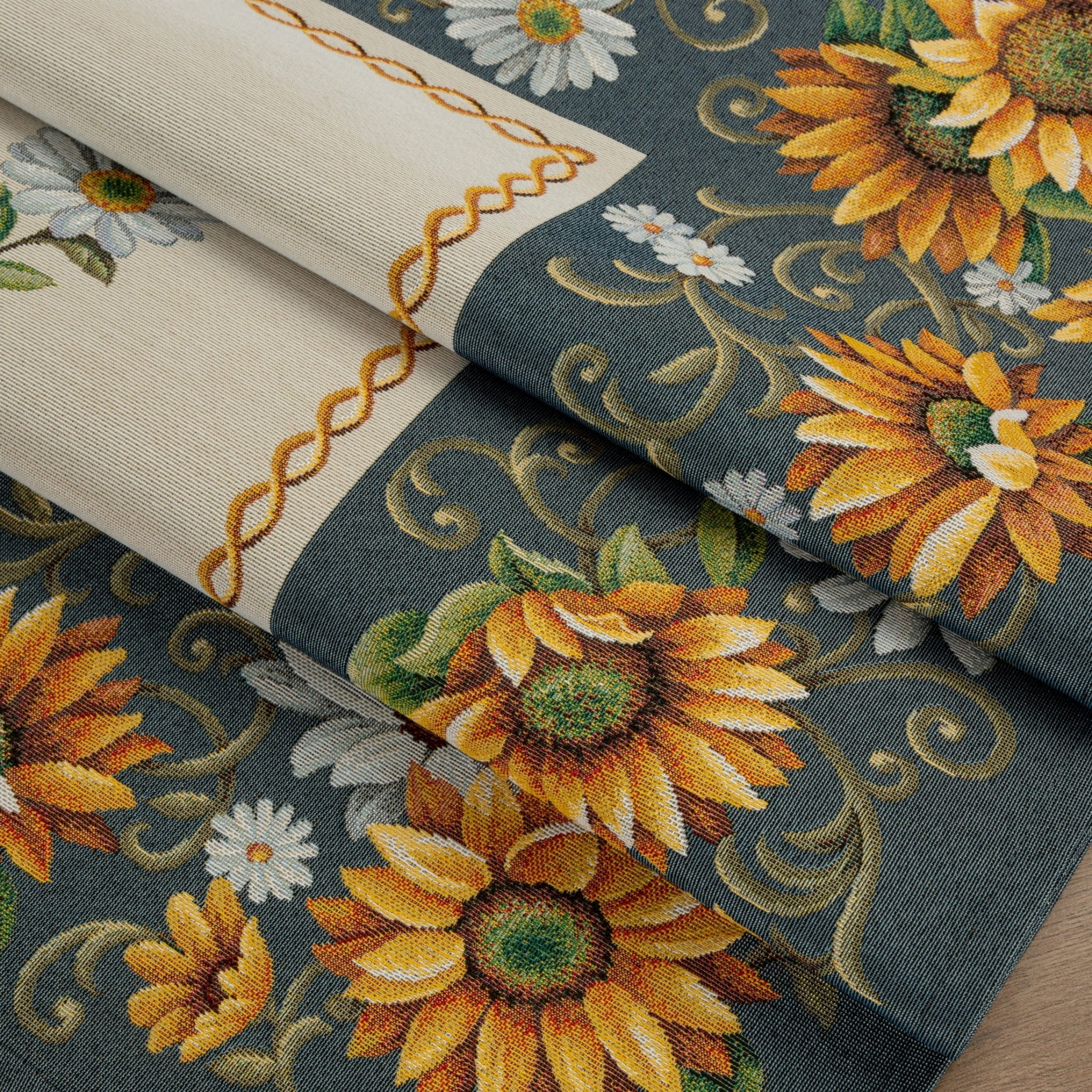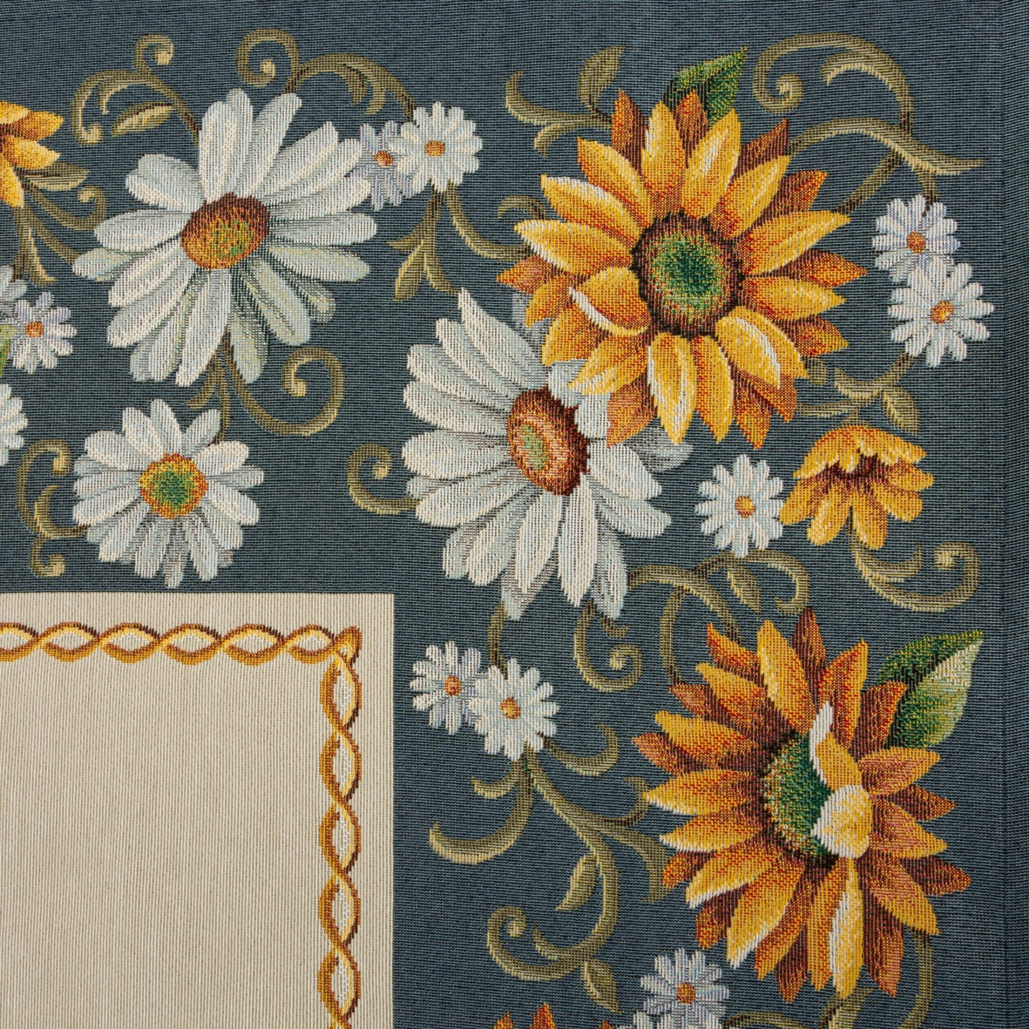 Piękny, dekoracyjny obrus Gobelinowy 45 niebieski z motywem Słoneczników 100x100 na stół elegancko ozdobi Twoje wnętrze. Ekskluzywny bieżnik jest dopełnieniem i ozdobą każdego zastawionego stołu. Wykonany z precyzją świetnie wygląda i eksponuje każdą elegancką zastawę. Kwadrat będzie się cudownie prezentowała w tradycyjnych wnętrzach, jak i w nowocześnie urządzonych pomieszczeniach.