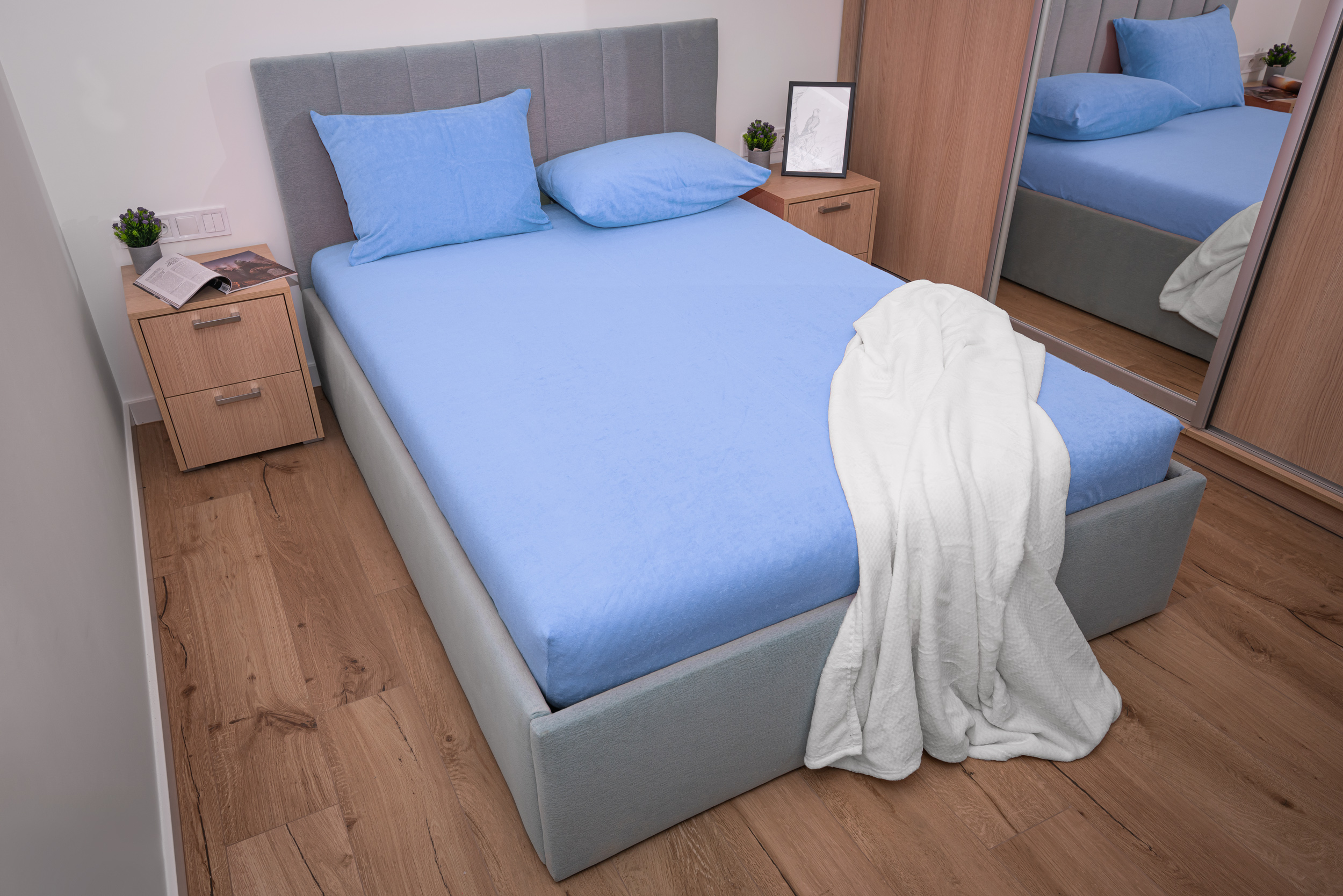 Prześcieradło frotte z gumką w kolorze niebieskim wykonane zostało z materiału frotte z wysokiej jakości przędzy czesanej. Dzianina składa się w 82% z bawełny i 18% z poliestru czyli tysięcy bawełnianych pętelek między którymi swobodnie przepływa powietrze. Taka proporcja bawełny do poliestru sprawia, że prześcieradło bardzo dobrze reguluje temperaturę ciała co zapobiega nadmiernemu poceniu się skóry a poliester gwarantuje ciągliwość i wytrzymałość oraz idealne dopasowanie do materaca. Prześcieradło frotte z gumką charakteryzuje się wykorzystaniem przędzy czesanej czyli najbardziej ekskluzywnej dostępnej na rynku o gramaturze 200g/m² która sprawia że prześcieradło jest grube, miękkie i przyjemne w dotyku.