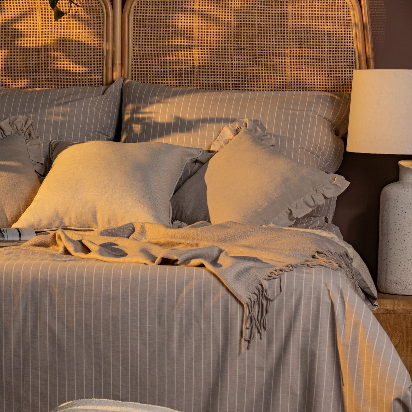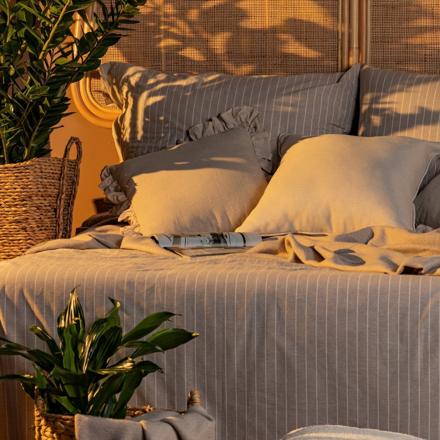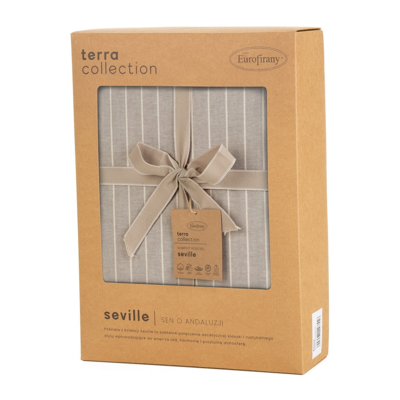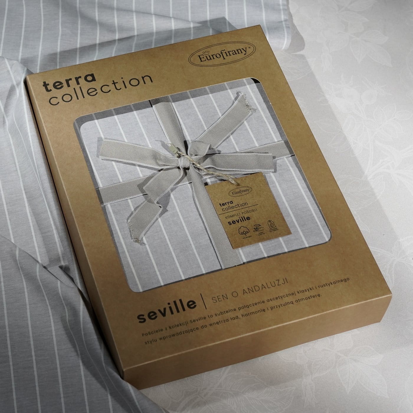 Pościel bawełna żakardowa Seville 14 Sen o Andaluzji inspirowana podróżami pochodzi z najnowszej kolekcji pościeli Terra Collection firmy Eurofirany, która stawia na nowoczesne i efektowne wzornictwo. Świadczy o tym popiel połączony z beżem. Pościel z motywem klasycznych pasów została wykonana z 80% bawełny i 20% poliestru. Tkanina z włókien bawełnianych jest przyjemna dla skóry, zapewnia przewiewność oraz komfort nocnego wypoczynku. Pościel posiada ozdobne drewniane guziki, które dodają całości charakteru w stylu eko. Żakardowy wzór w ponadczasowe pasy jest stonowany i elegancki, dzięki czemu świetnie pasuje do wystroju większości sypialni. Cały komplet jest elegancki, dokładnie wykończony i ładnie zapakowany w ekologiczne kartonowe opakowanie które jest w pełni biodegradowalne. Gramatura tkaniny to 115 g/m² dzięki czemu pościel jest lekka, przyjemna i szybko schnie. Komplet pościeli Terra Collection odnajdzie się w nowoczesnych jak i klasycznych sypialniach. Dokładne wykończenie oraz estetyczne opakowanie składa się na wysoką jakość produktu.