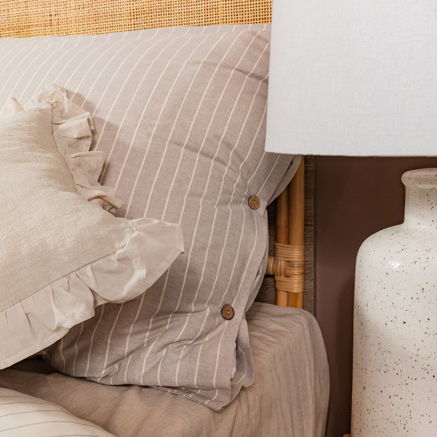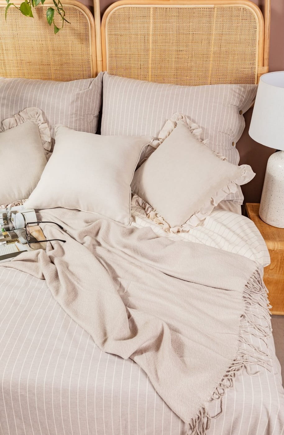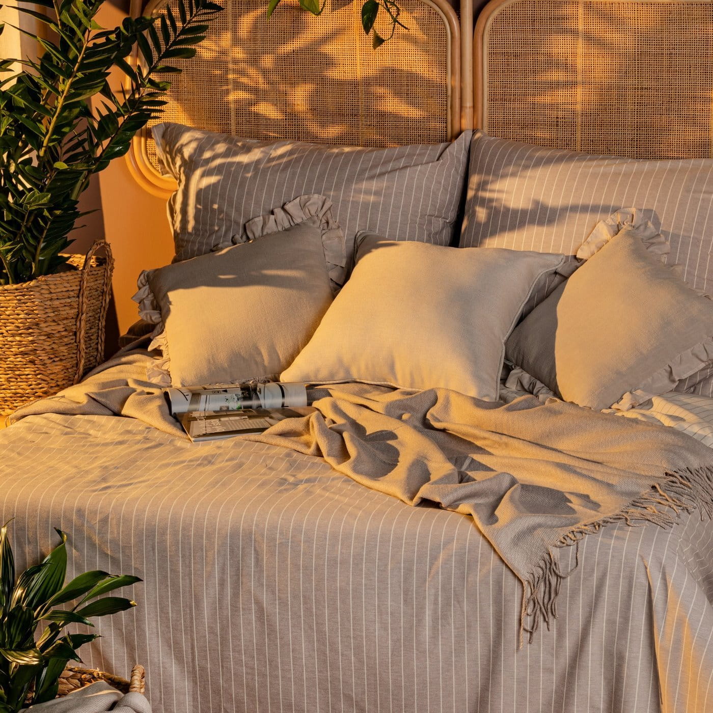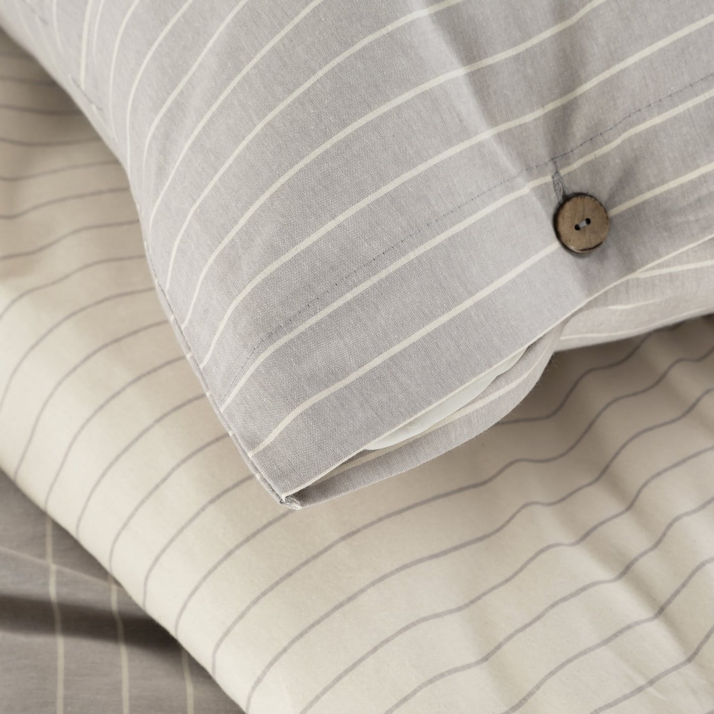 Pościel bawełna żakardowa Seville 14 Sen o Andaluzji inspirowana podróżami pochodzi z najnowszej kolekcji pościeli Terra Collection firmy Eurofirany, która stawia na nowoczesne i efektowne wzornictwo. Świadczy o tym popiel połączony z beżem. Pościel z motywem klasycznych pasów została wykonana z 80% bawełny i 20% poliestru. Tkanina z włókien bawełnianych jest przyjemna dla skóry, zapewnia przewiewność oraz komfort nocnego wypoczynku. Pościel posiada ozdobne drewniane guziki, które dodają całości charakteru w stylu eko. Żakardowy wzór w ponadczasowe pasy jest stonowany i elegancki, dzięki czemu świetnie pasuje do wystroju większości sypialni. Cały komplet jest elegancki, dokładnie wykończony i ładnie zapakowany w ekologiczne kartonowe opakowanie które jest w pełni biodegradowalne. Gramatura tkaniny to 115 g/m² dzięki czemu pościel jest lekka, przyjemna i szybko schnie. Komplet pościeli Terra Collection odnajdzie się w nowoczesnych jak i klasycznych sypialniach. Dokładne wykończenie oraz estetyczne opakowanie składa się na wysoką jakość produktu.