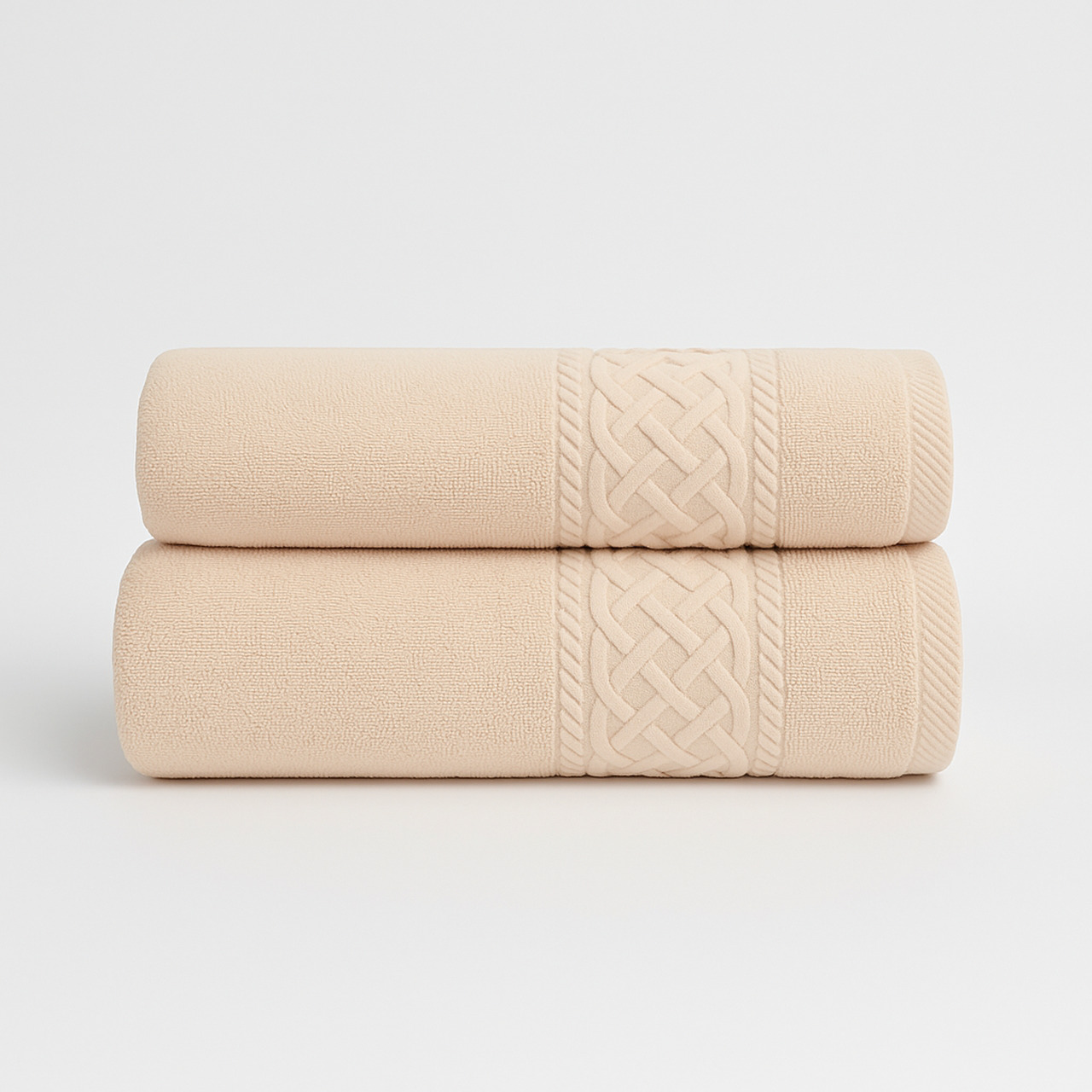 Ręcznik bawełniany Sydney w kolorze piaskowym został wyprodukowany przez markę Legs. Wykonany z wysokiej jakości przędzy frotte, składającej się w 100% bawełny, która zapewnia wysokie właściwości higroskopijne czyli zdolność pochłaniania wilgoci. Charakteryzuje się wysoką i najbardziej optymalną do codziennego użytku gramaturą 500 g/m², dzięki której szybko schnie. Dodatkowo ręcznik Sydney cechuje się przyjemnym i miękkim chwytem z piękną plecioną, geometryczną bordiurą. Elegancka ale minimalistyczna część ozdobna świetnie odnajdzie się w klasycznych jak i nowoczesnych wnętrzach tym bardziej, że ręcznik występuje w bardzo bogatej kolorystyce. Z pewnością zadowolą klientów szukających wysokiej jakości w połączeniu z atrakcyjną ceną i eleganckim designem.