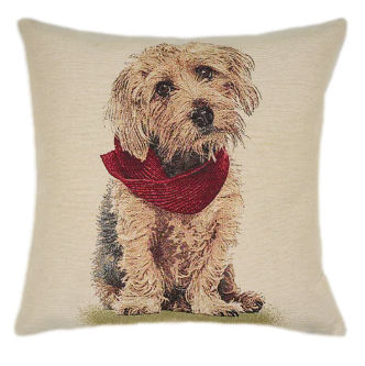 Piękna dekoracyjna poszewka Gobelin Pies na poduszkę elegancko ozdobi Twoje wnętrze. Zasuwana na zamek błyskawiczny. Poszewka jednostronna - z tyłu jednobarwna tkanina.
