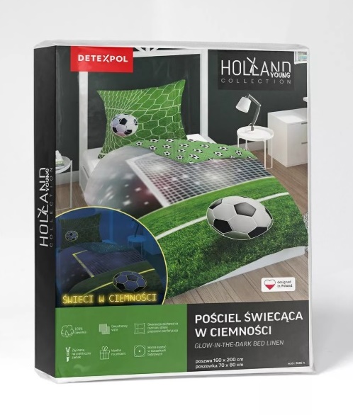 Pościel dla dzieci z piłką fluo świecąca w ciemności 3685A wykonana jest w 100% z bawełny co jest bardzo istotne przy produktach przeznaczonych dla najmłodszych. Bawełna jest naturalna i pozwala skórze swobodnie oddychać. Tkanina posiada Certyfikat Oeko-Tex Standard 100 co oznacza, że została przebadana i nie zawiera substancji szkodliwych dla dziecka oraz substancji powodujących alergie.