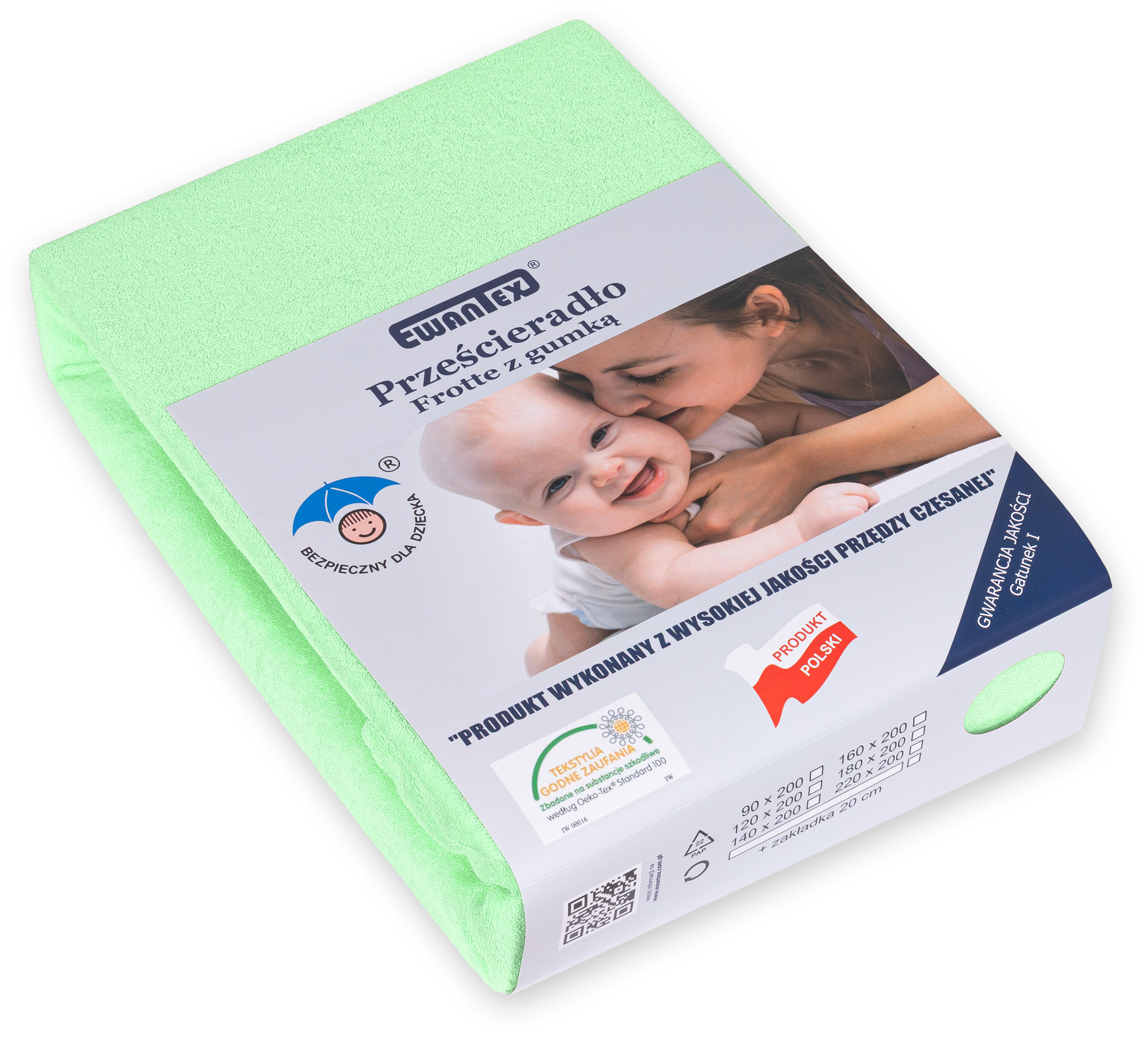 Prześcieradło z gumką idealnie pasuje na materac o wysokości do 17 cm. Gumka została wszyta w tunelu, który został dokładnie obszyty 5 igłowym overlockiem co gwarantuje nam solidność i stabilność gumki podczas użytkowania. Dzianina do uszycia prześcieradła produkowana jest w Polsce i posiada Certyfikat Oeko-Tex Standard 100 co oznacza, że została przebadana i nie zawiera substancji szkodliwych dla człowieka oraz substancji powodujących alergie.