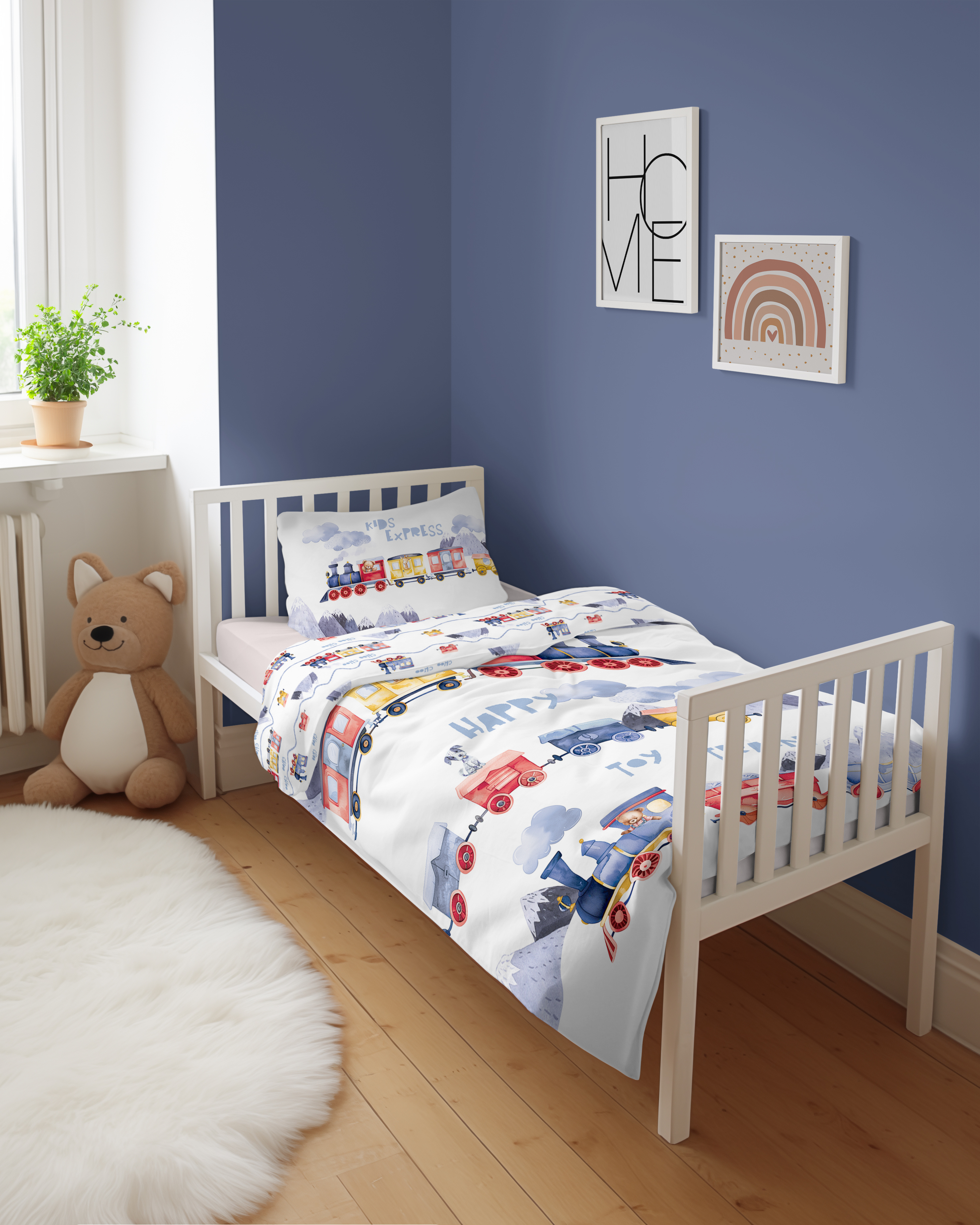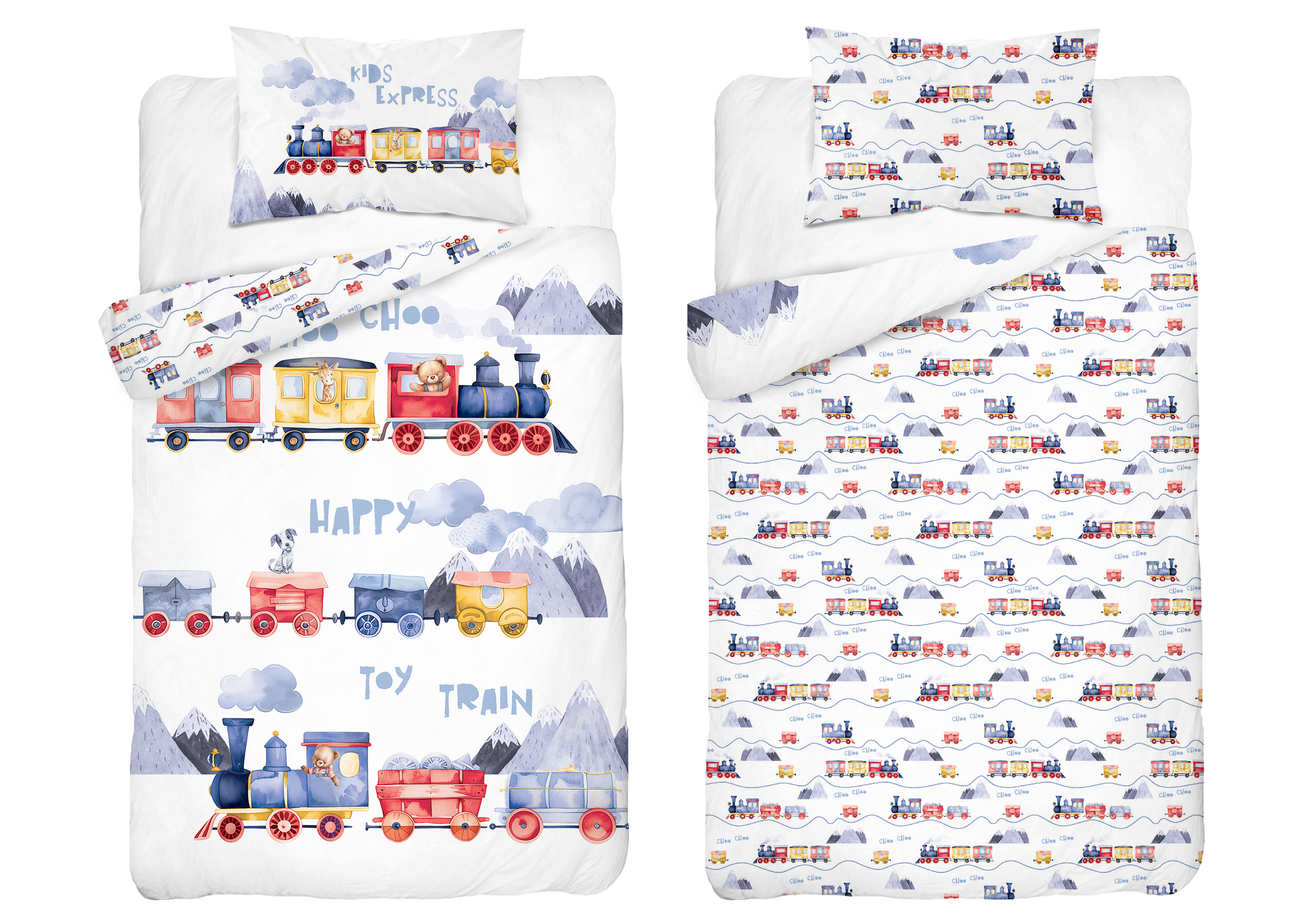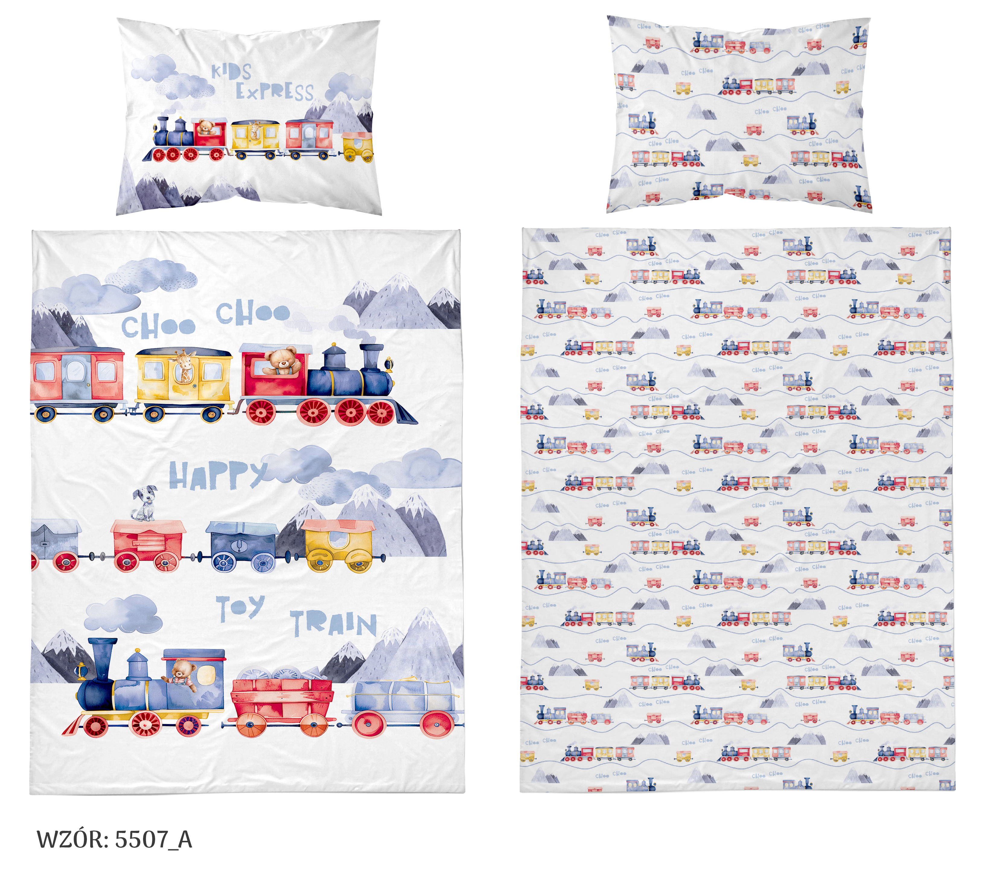 pociąg słodziaków dwustronna pościel bawełniana maya moo 100x135 + 40x60 do łóżeczka 5507A
