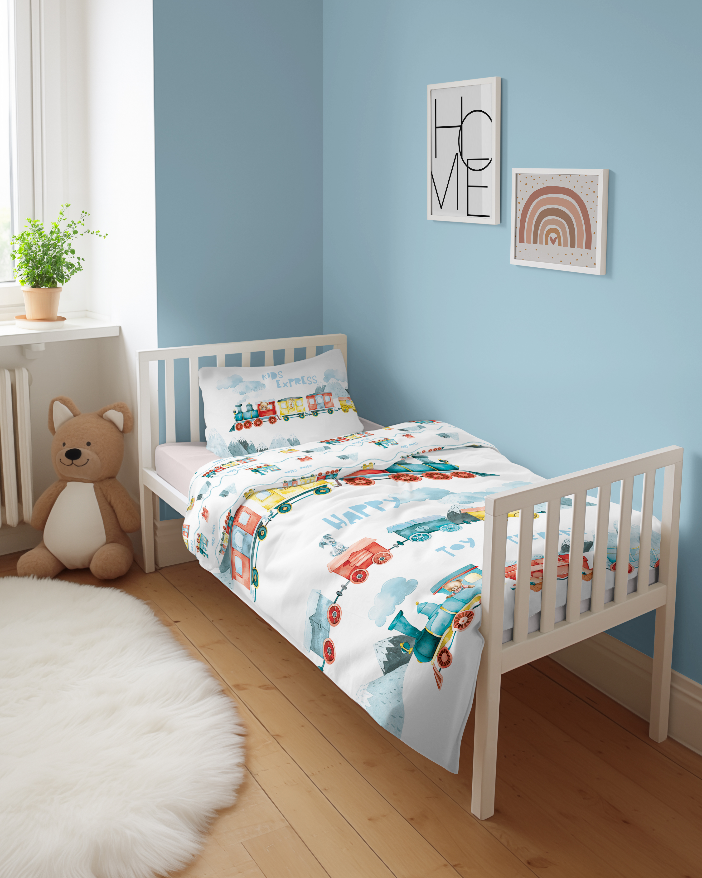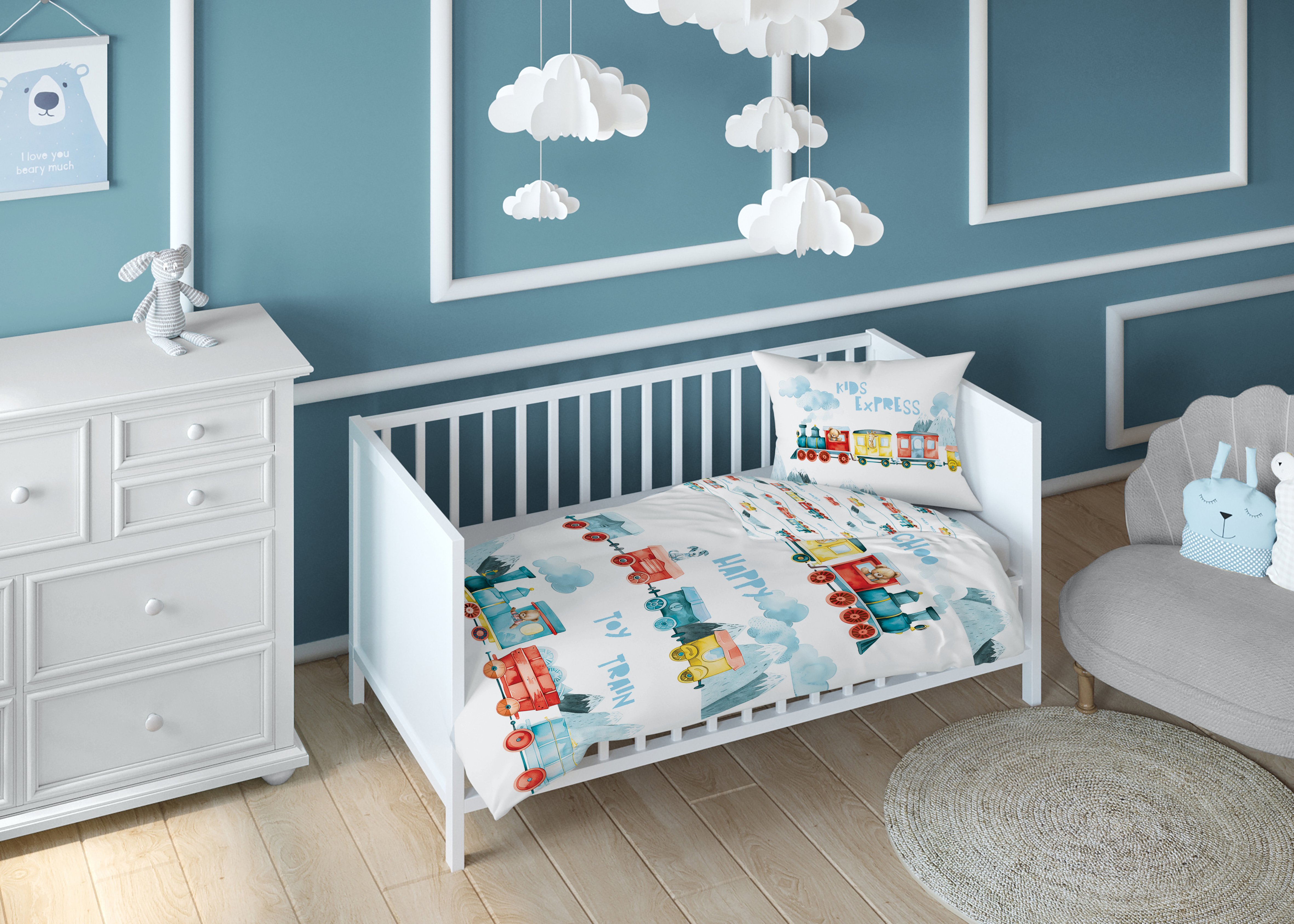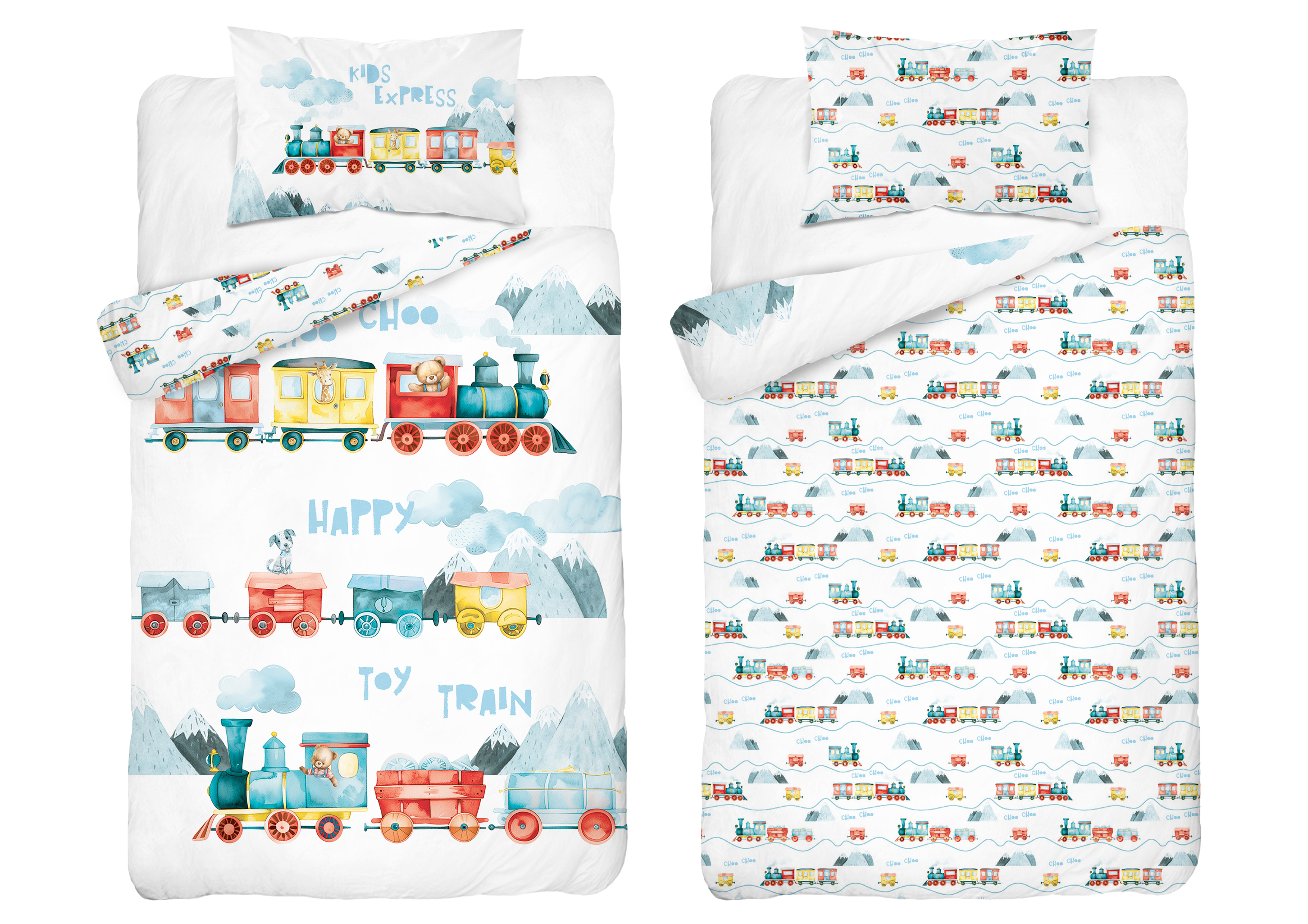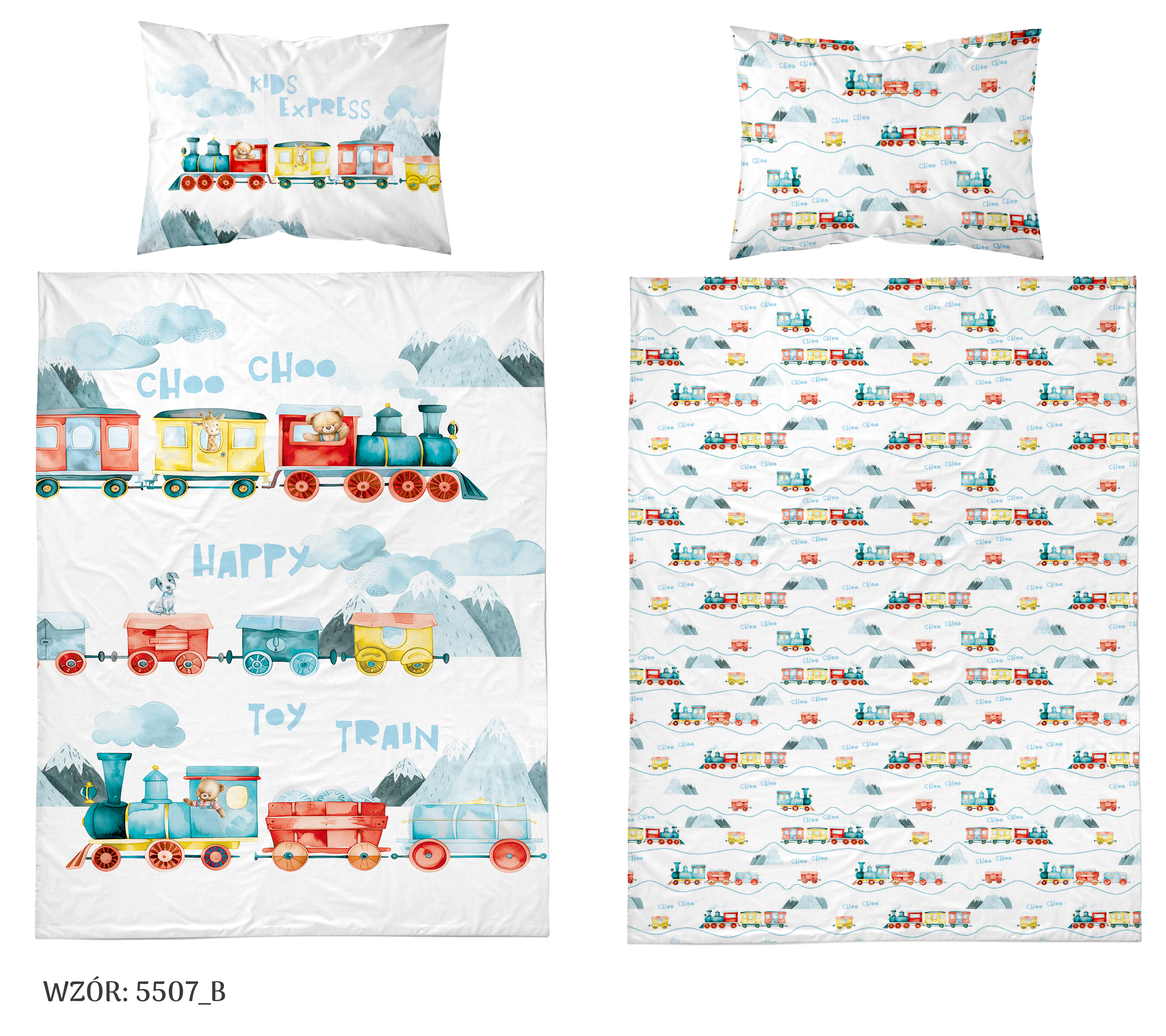 pociąg słodziaków dwustronna pościel bawełniana maya moo 100x135 + 40x60 do łóżeczka 5507B