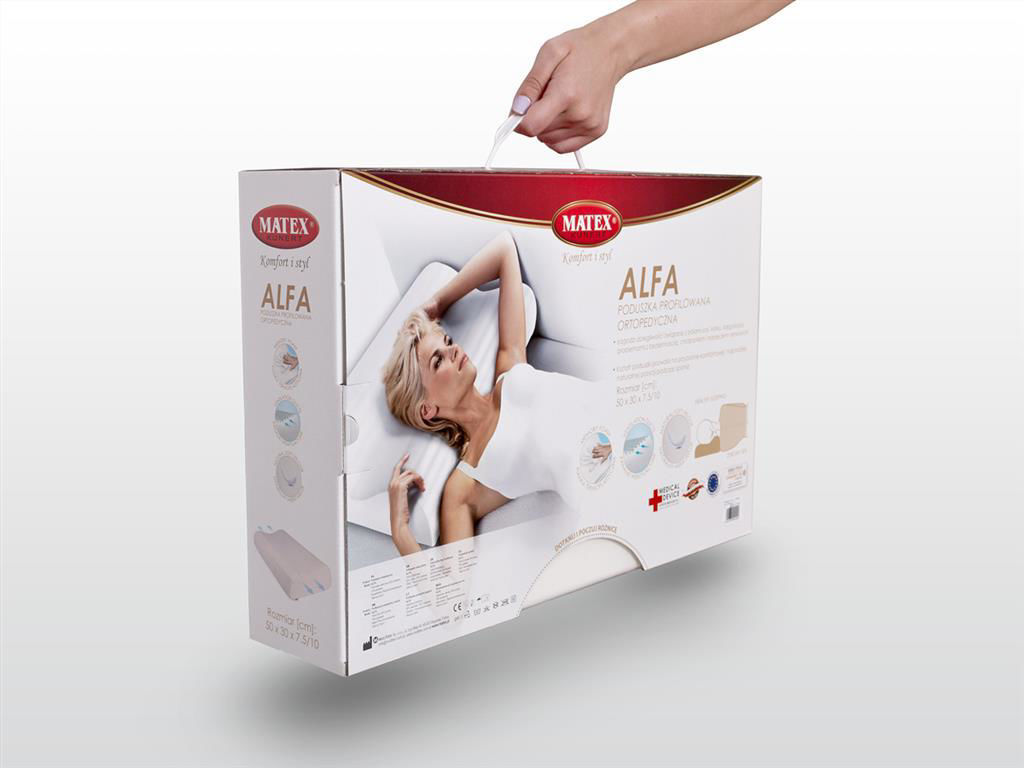 Profilowana poduszka ortopedyczna Alfa została zaprojektowana w celu zapewnienia ergonomicznego podparcia szyi i głowy podczas snu. Dwie wysokości – 7,5cm oraz 10cm – pozwalają dopasować poduszkę do indywidualnych preferencji oraz pozycji spania. Specjalnie wyprofilowany kształt pomaga utrzymać naturalną krzywiznę odcinka szyjnego kręgosłupa, zmniejszając napięcie mięśni karku i barków.