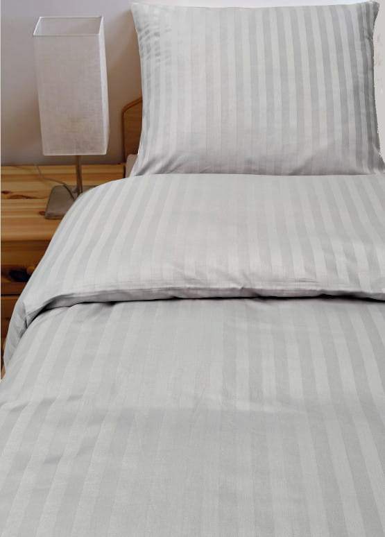 Pościel z adamaszku w kolorze popielatym 160x200 została uszyta z tkaniny, która została wykonana w 100% z włókien bawełnianych a jej producentem jest znana i ceniona firma Andropol. Komplet jest bardzo wytrzymały mechanicznie dzięki wysokiej gramaturze 160 g/m². Całość tworzy prosty ale jednocześnie elegancki wzór w paseczki o szerokości 1 cm. Pościel z adamaszku w kolorze popielatym posiada matowy wygląd, nie jest śliska oraz nie posiada połysku.