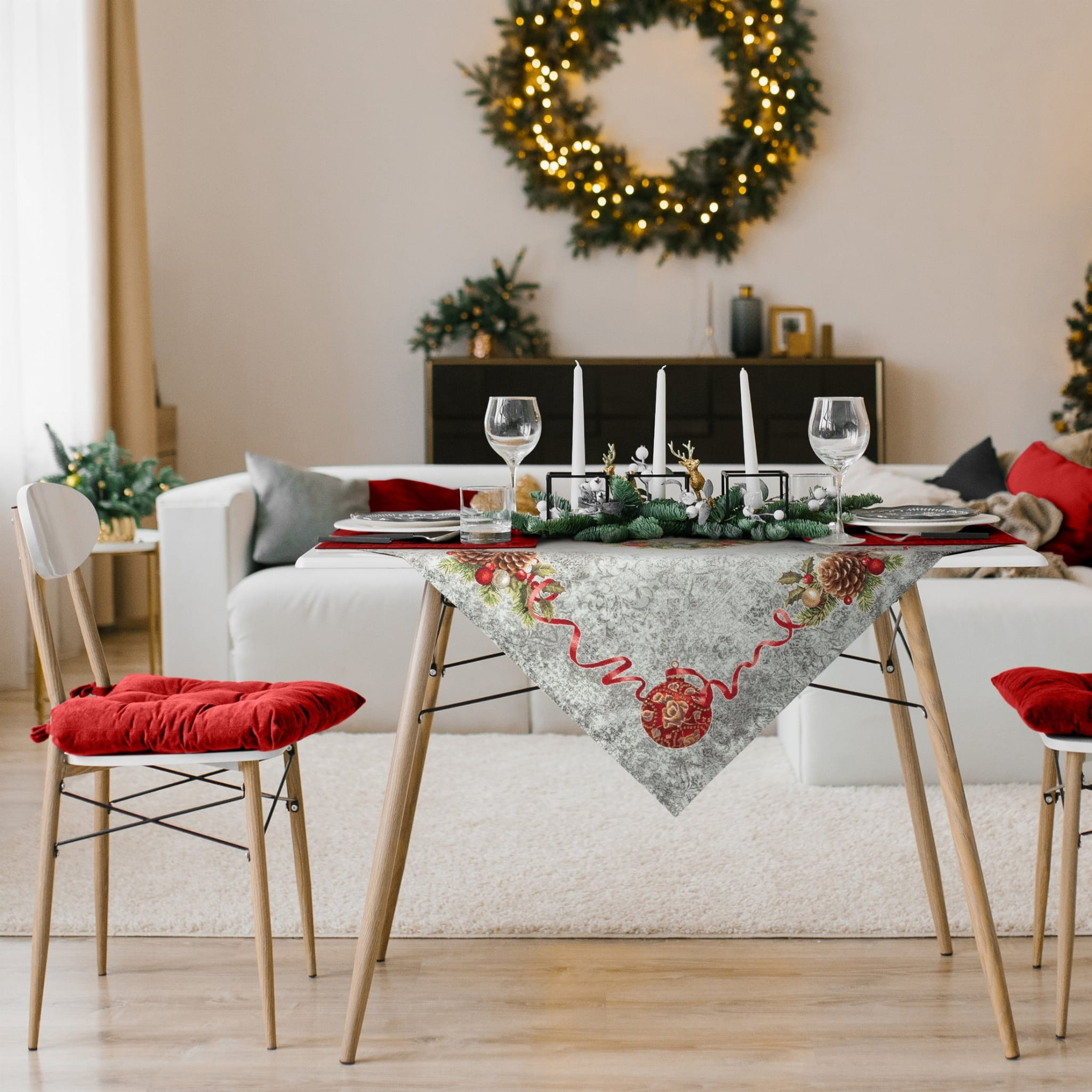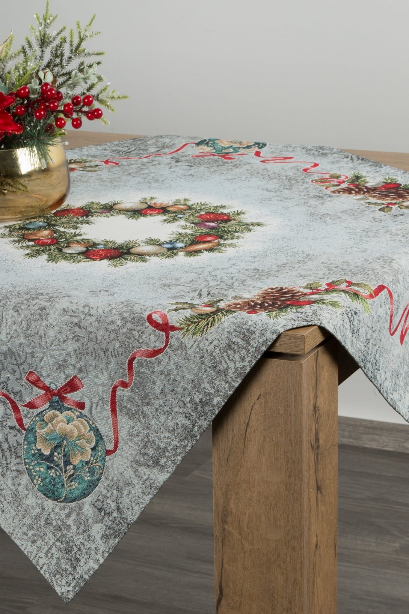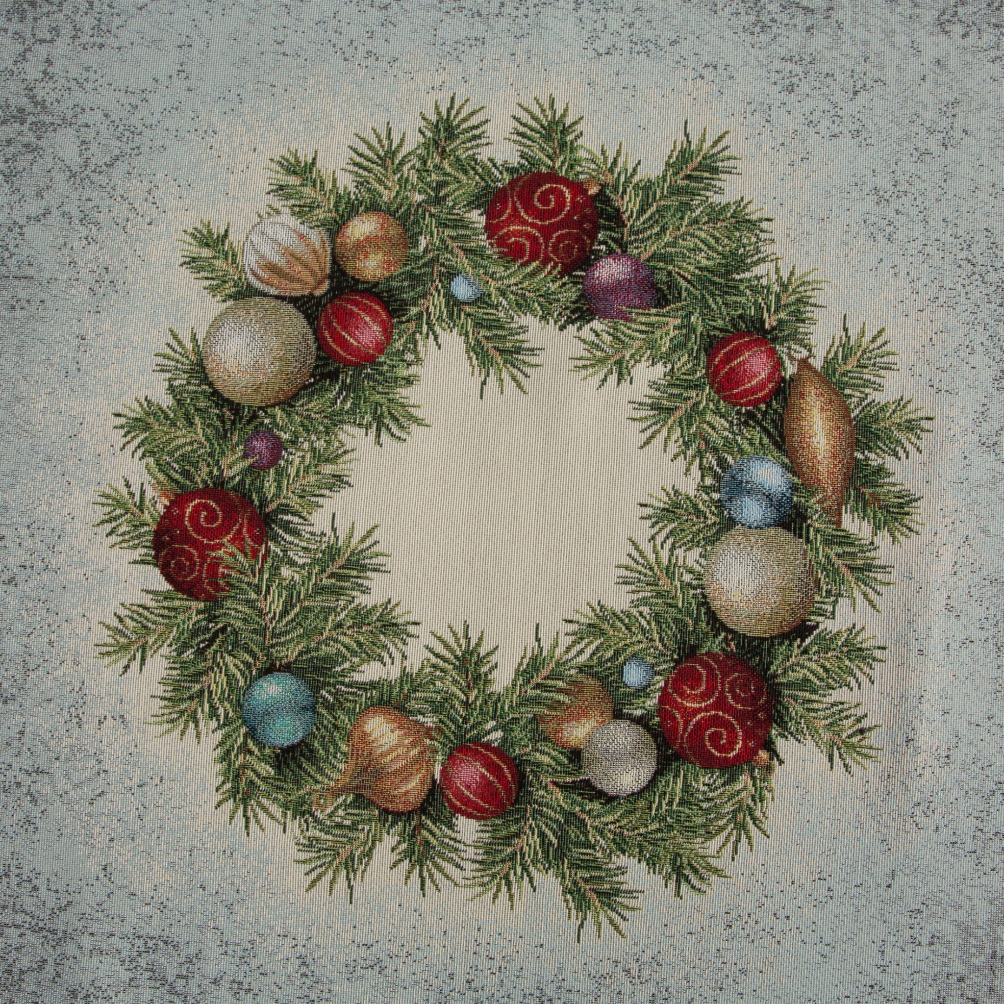 Ekskluzywny bieżnik Gobelin Świąteczny z Wiankiem Świątecznym jest dopełnieniem i ozdobą każdego zastawionego stołu. Wykonany z precyzją świetnie wygląda i eksponuje każdą elegancką zastawę. Kwadrat będzie się cudownie prezentował w tradycyjnych wnętrzach, jak i w nowocześnie urządzonych pomieszczeniach.