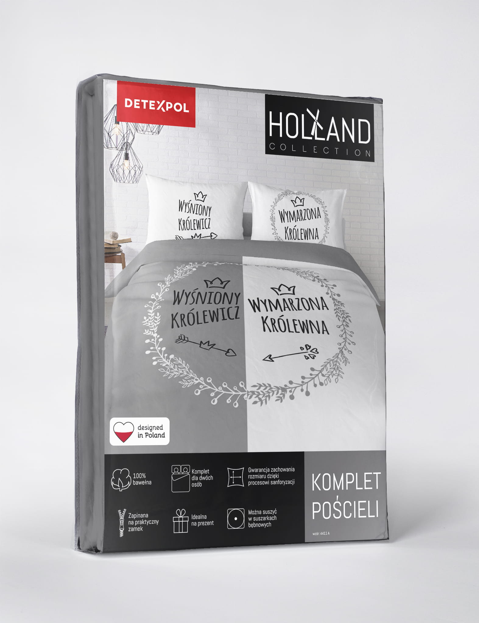 Komplet pościeli bawełnianej Wymarzona Królewna Wyśniony Królewicz 4411A z serii Holland Collection wykonana jest w 100% z bawełny, która sprawia, że tkanina ma jednorodną powierzchnię, estetyczny wygląd i jest miękka w dotyku. Design pościeli został stworzony na wzór oryginalnych panelowych pościeli holenderskich dlatego pościel jest dwustronna. Docenią ją szczególnie osoby, które cenią nowoczesne wzornictwo i doceniają najmodniejsze trendy. Pościel gwarantuje nam wysoki komfort snu przez cały rok a dzięki wykonaniu w 100% z naturalnych włókien bawełnianych świetną cyrkulację powietrza oraz gwarancję komfortowego i zdrowego snu. Dodatkowym atutem pościeli panelowej wykonanej z bawełny jest wysoka higroskopijność (zdolność pochłaniania wilgoci), przyjazność dla osób uczulonych lub cierpiących na alergie. Dokładne wykończenie, dbałość o detale oraz estetyczne opakowanie składa się na wysoką jakość produktu. Komplet pościeli z bawełny zapinany jest na bezpieczny i atestowany zamek błyskawiczny. Komplet pościeli Holland Collection może okazać się świetnym pomysłem na prezent.