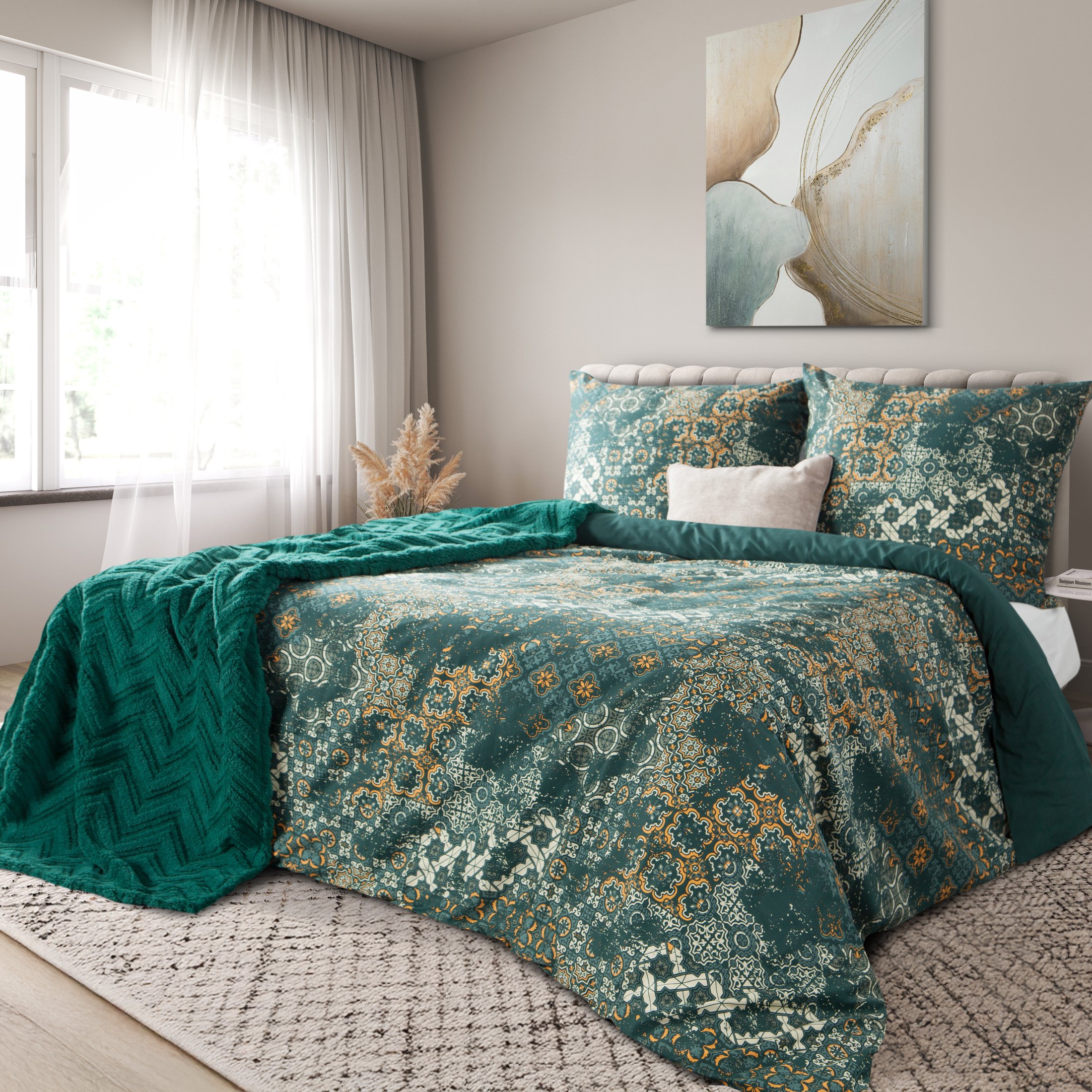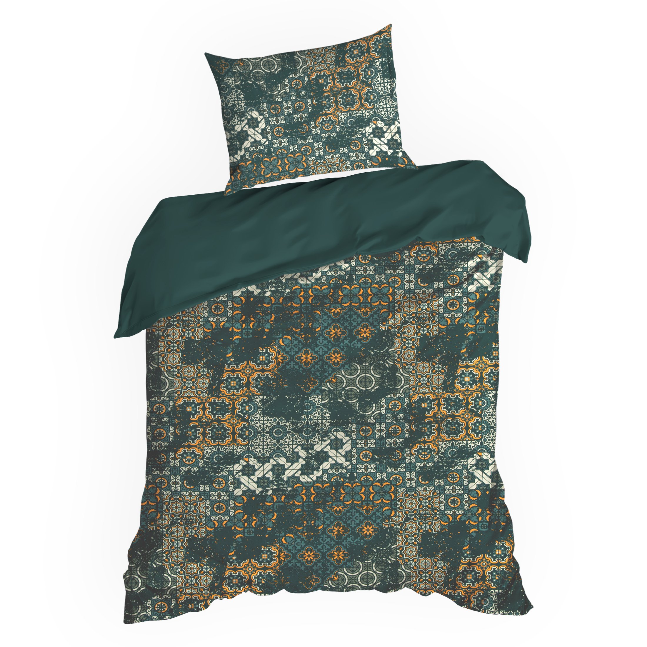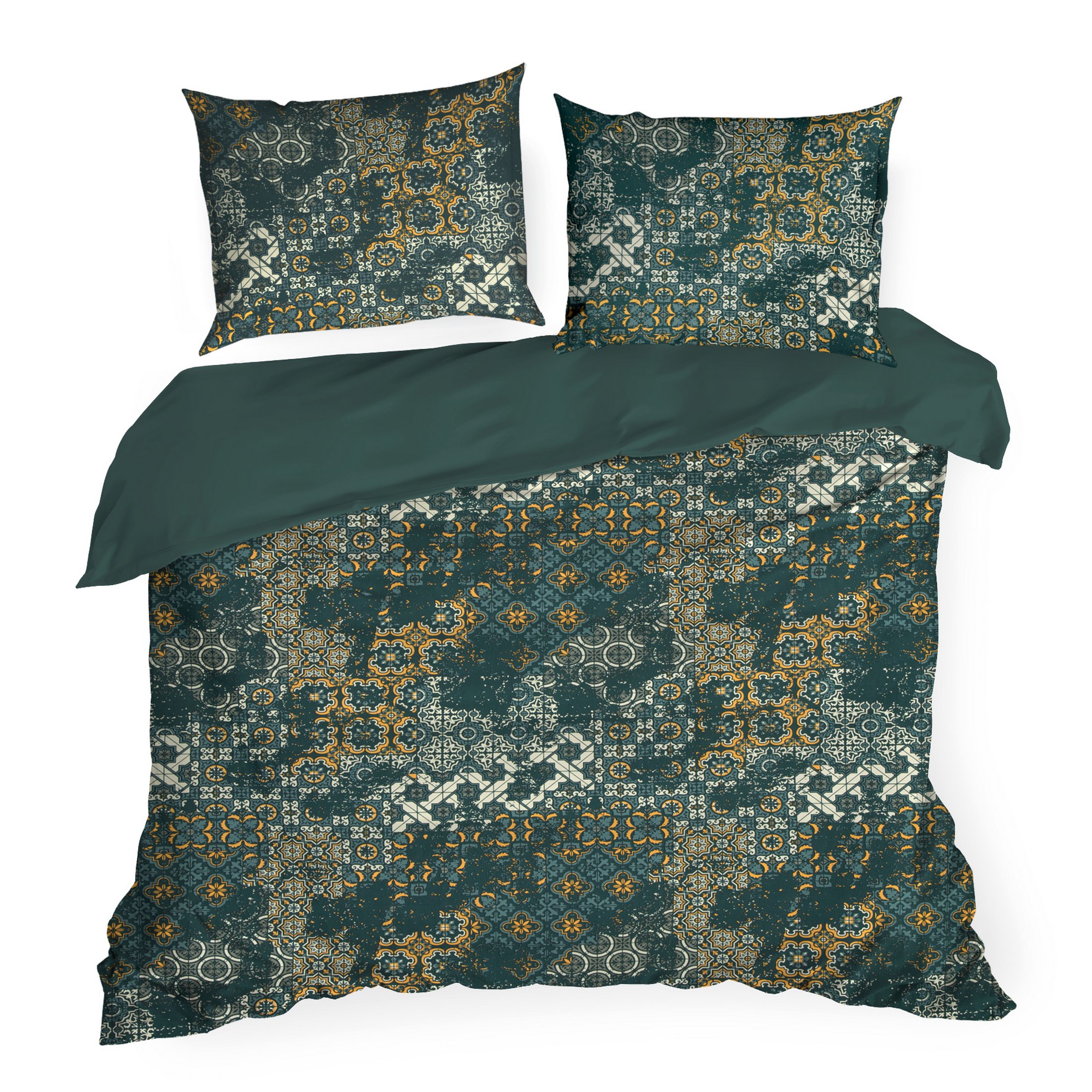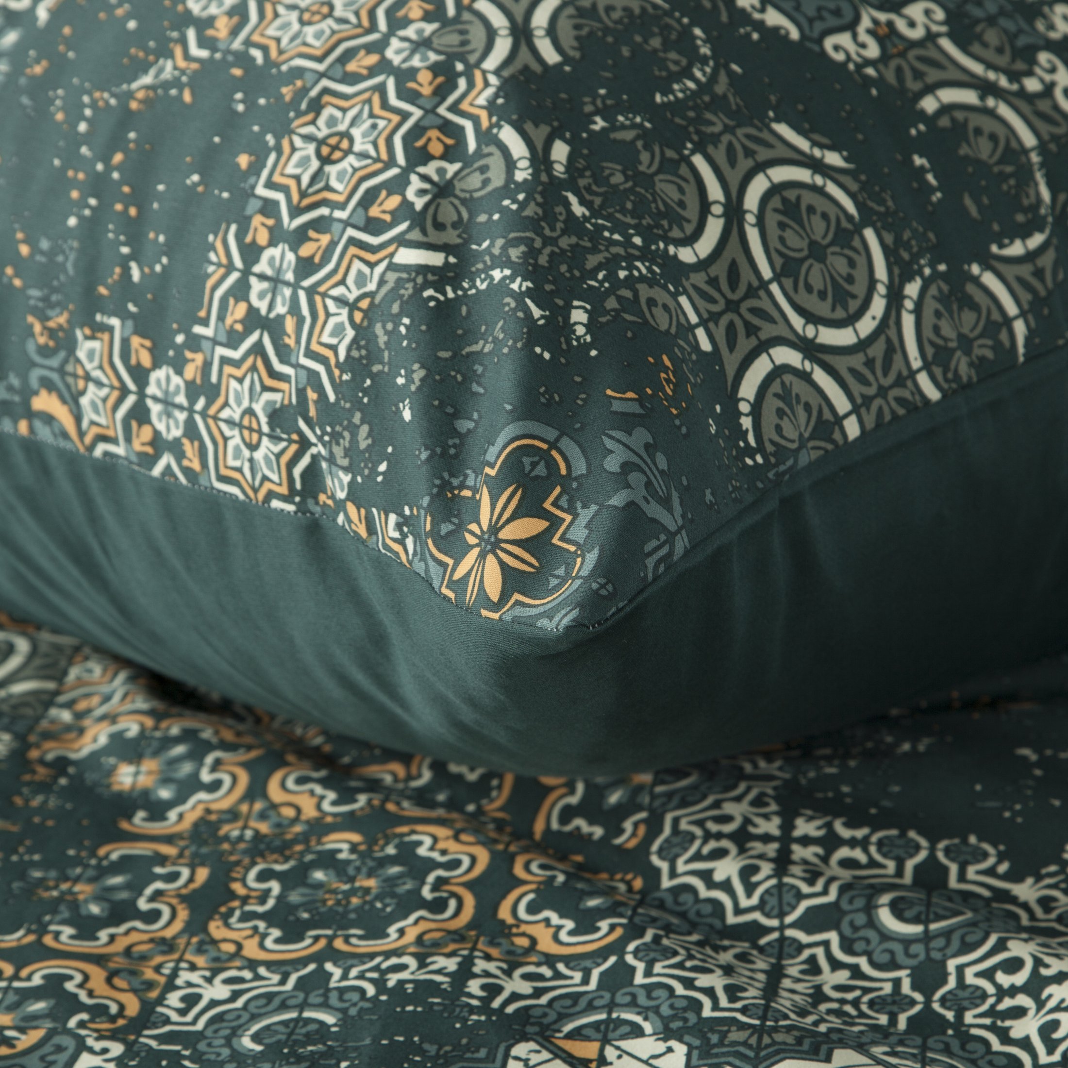 Komplet pościeli Spring 69, uszyto z wysokiej jakości satyny bawełnianej z nadrukiem mozaiki. Pościel została wyprodukowana na zlecenie marki Eurofirany. Nowoczesna technika nadruku rotacyjnego, gwarantuje wyrazisty wzór, nasycone kolory ciemnej zieleni ze złotem to niezwykłe przejścia kolorystyczne które sprawia, że nadruk nie traci swojej intensywności, nawet po wielu praniach. Proces sanforyzacji, daje gwarancję niezmienności rozmiaru, dzięki niemu pościel nie kurczy się nawet po wielu praniach. Pościel o gramaturze 115g/m² nie podrażnia skóry, jest przewiewna i niezwykle miła dla ciała.