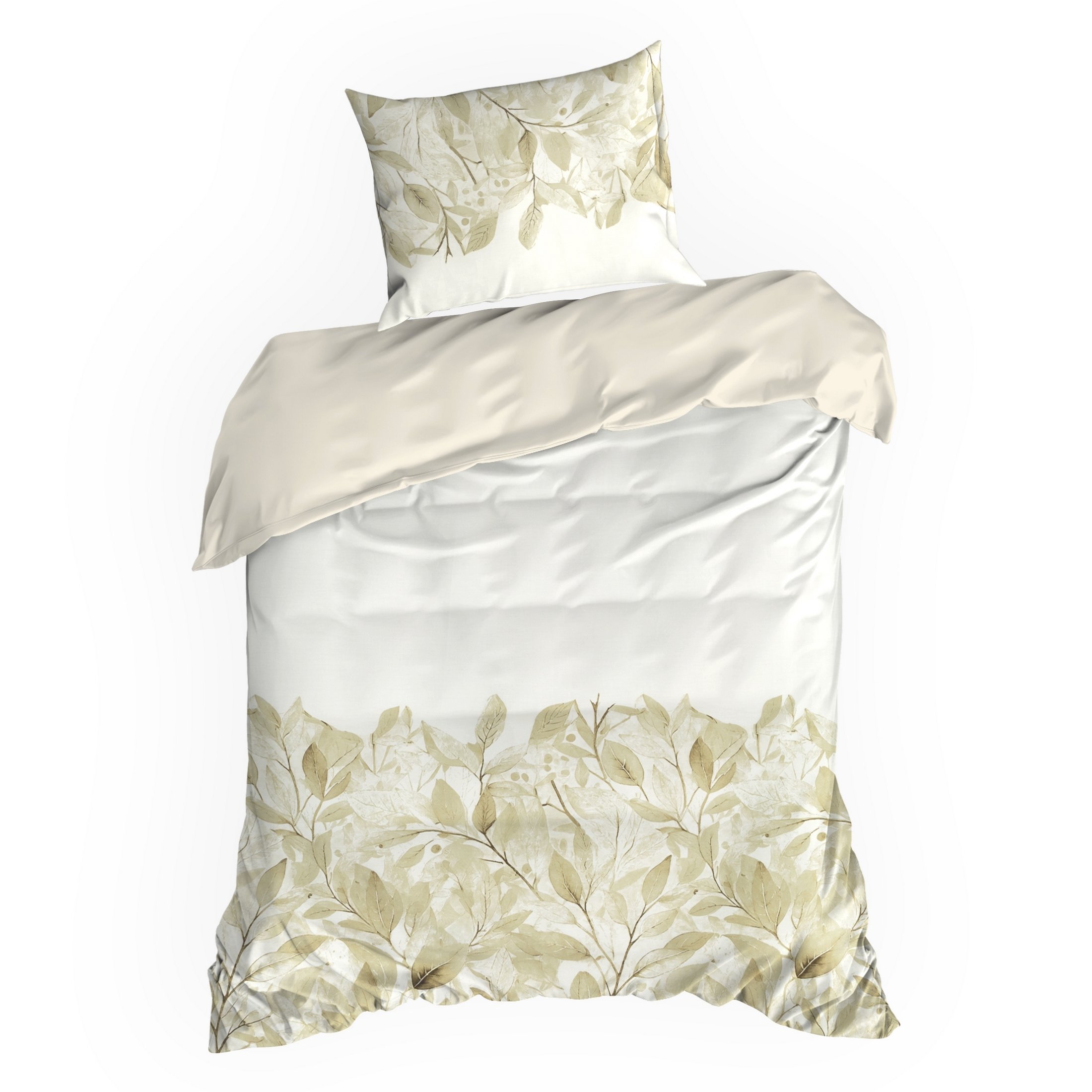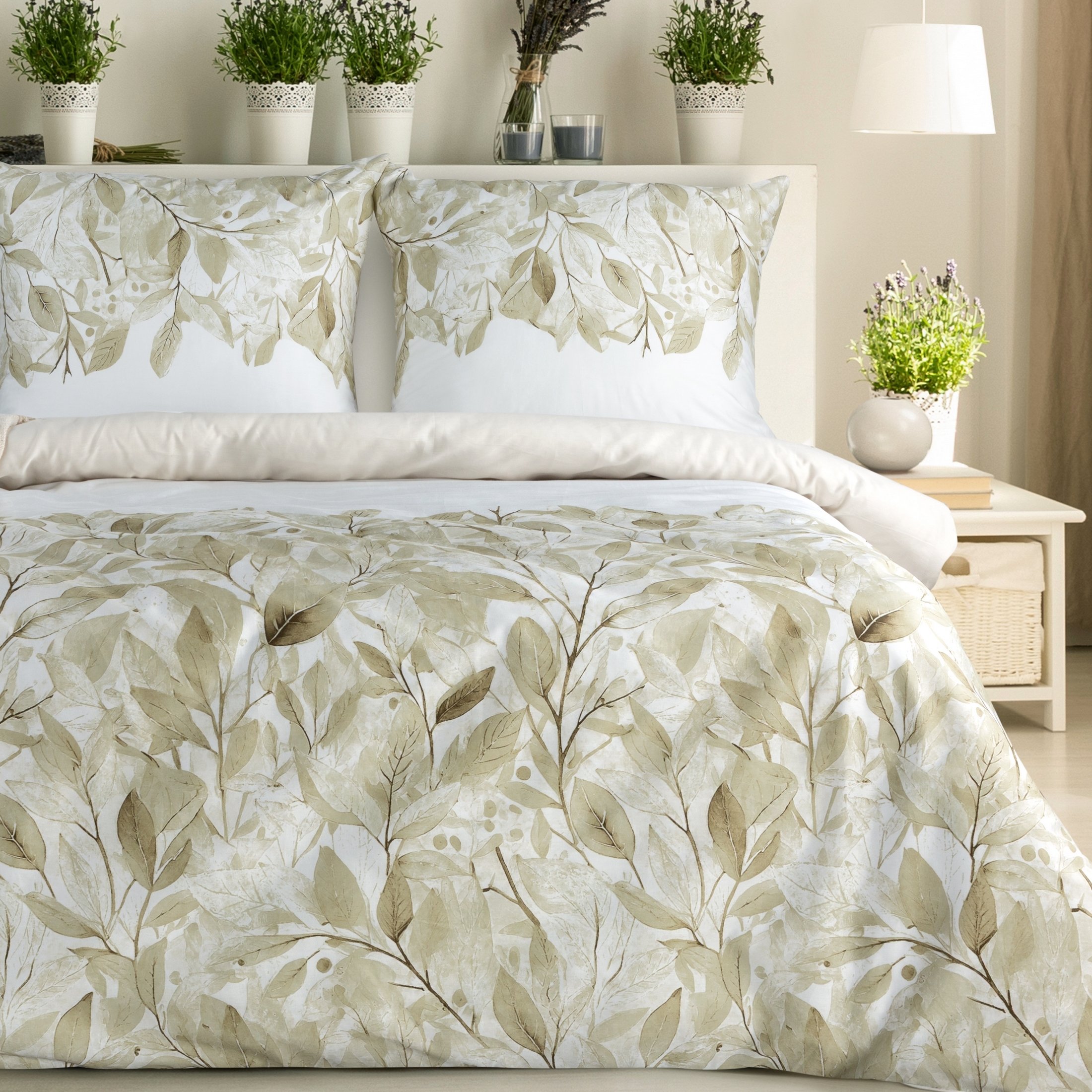 Komplet pościeli Spring 70, uszyto z wysokiej jakości satyny bawełnianej z nadrukiem liści. Pościel została wyprodukowana na zlecenie marki Eurofirany. Nowoczesna technika nadruku rotacyjnego, gwarantuje wyrazisty wzór, nasycone kolory beżu to niezwykłe przejścia kolorystyczne które sprawia, że nadruk nie traci swojej intensywności, nawet po wielu praniach. Proces sanforyzacji, daje gwarancję niezmienności rozmiaru, dzięki niemu pościel nie kurczy się nawet po wielu praniach. Pościel o gramaturze 115g/m² nie podrażnia skóry, jest przewiewna i niezwykle miła dla ciała.