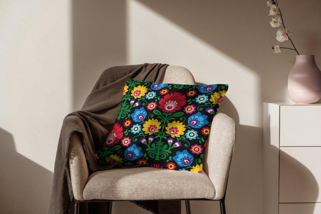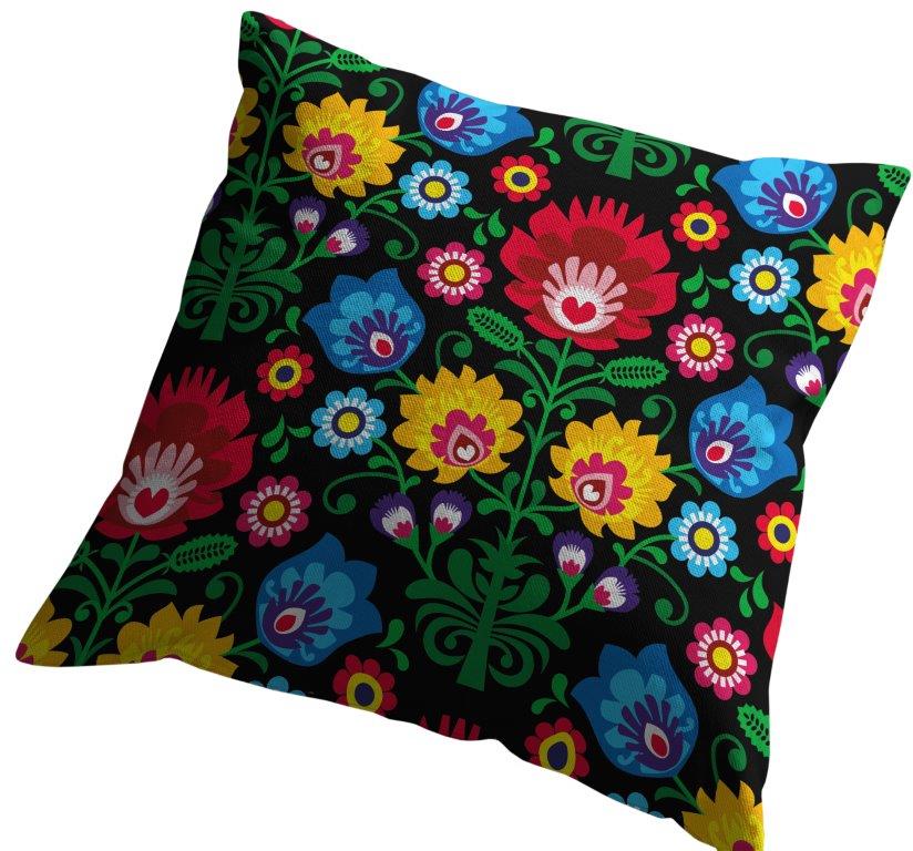 Poszewka dekoracyjna 45x45 kanwas we wzór folkowy czyli łowickich kwiatów na czarnym tle z pewnością dopasuje się do salonu czy tarasu. Elegancko i dokładnie uszyta z chowanym zamkiem. Materiał, z którego jest uszyta to połączenie bawełny z poliestrem. Bawełna dodaje tej poszewce ozdobnej miękkości i naturalności a poliester powoduje, że jest bardzo wytrzymała. Dzięki temu poszewkę ozdobną 45x45 możemy użytkować zarówno w salonie ale też na zewnątrz.